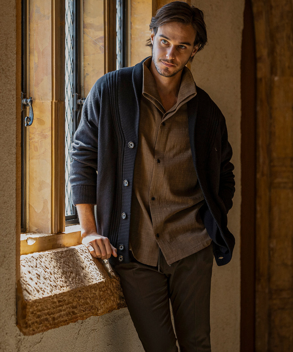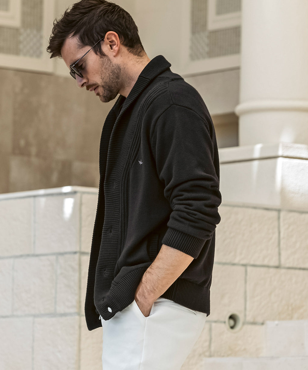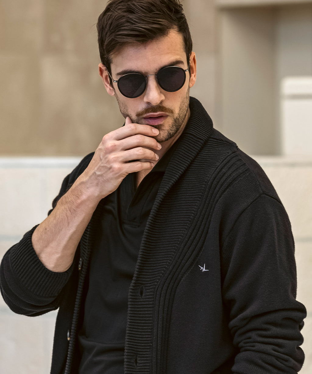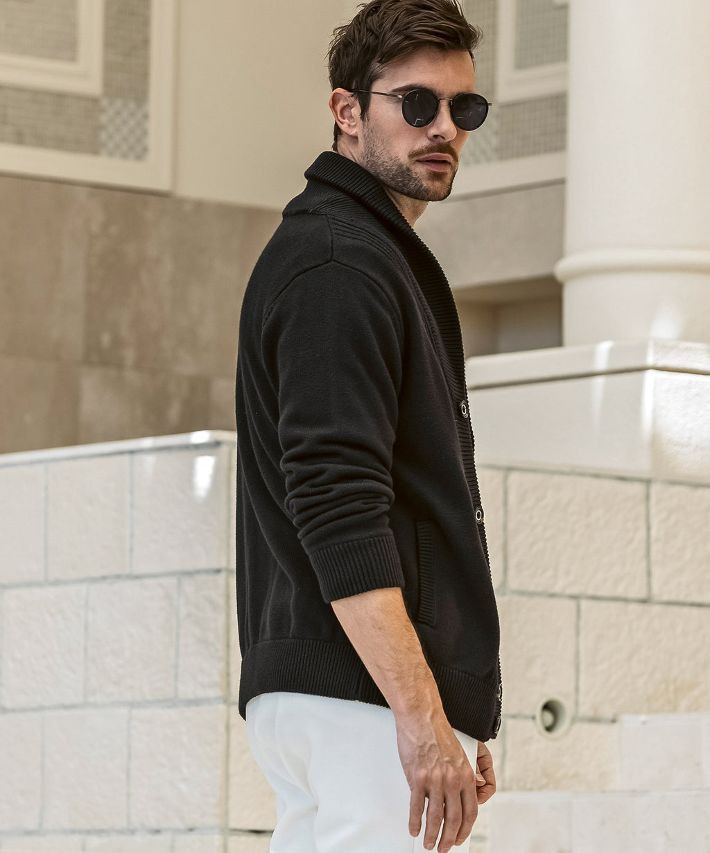 The flowing shawl collar line creates a three-dimensional effect on the chest, elevating the outfit with elegance.