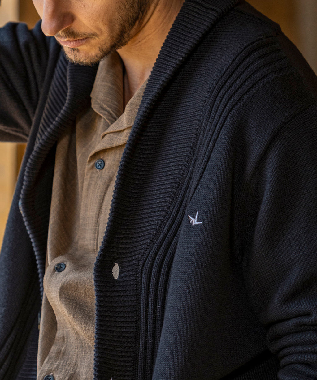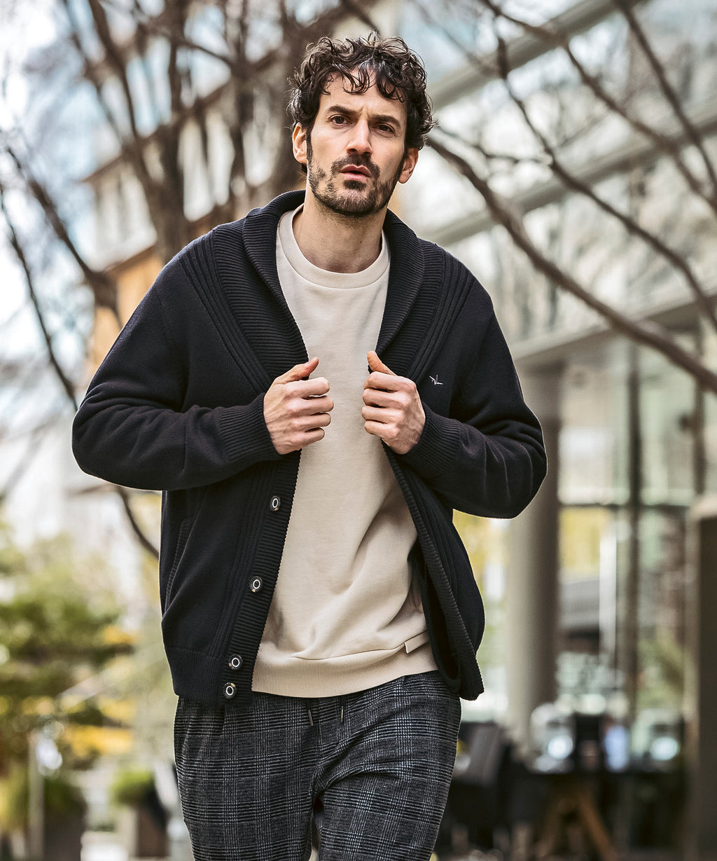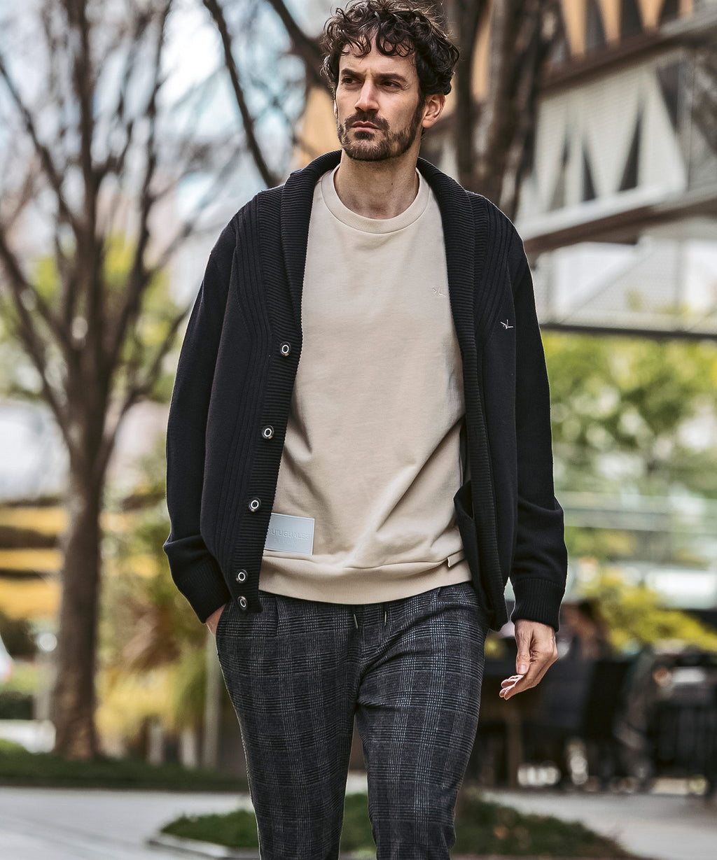 It combines the neatness reminiscent of a jacket with the soft comfort unique to knitwear.