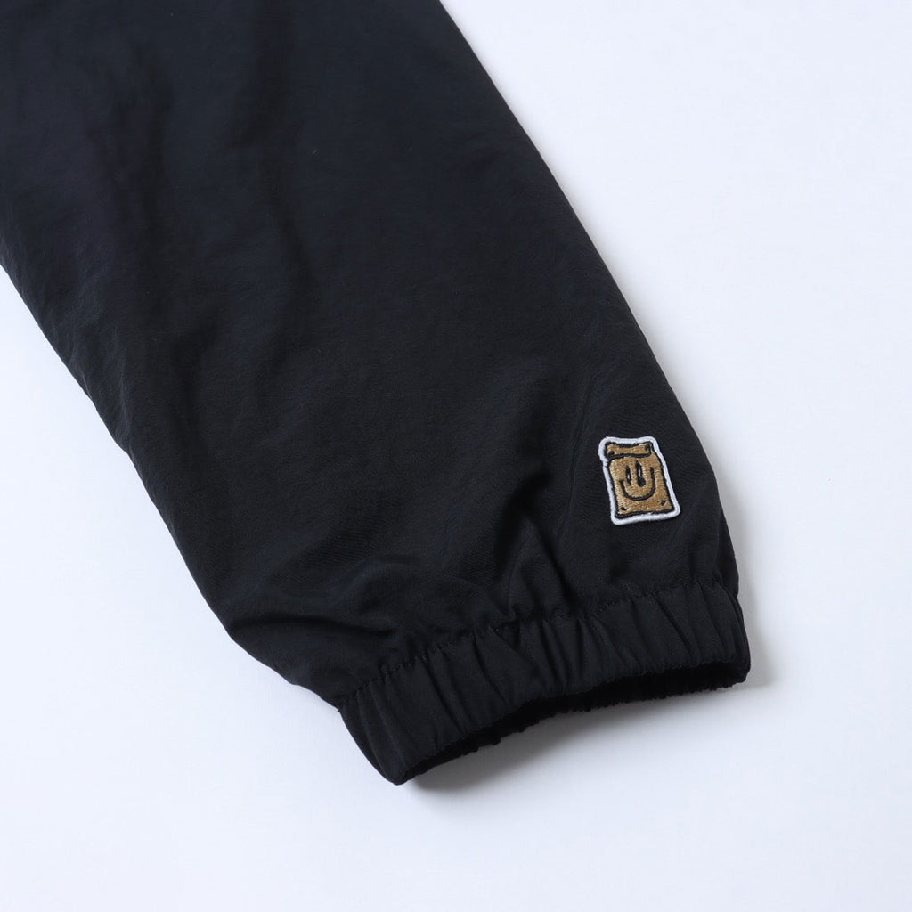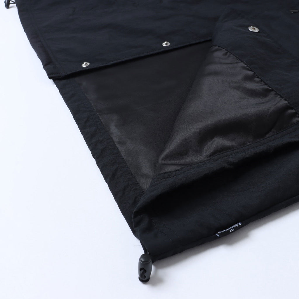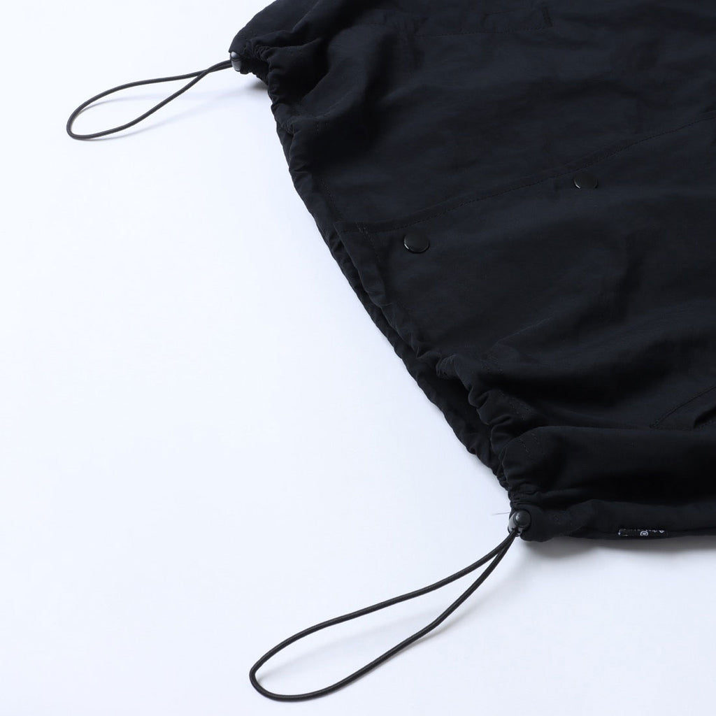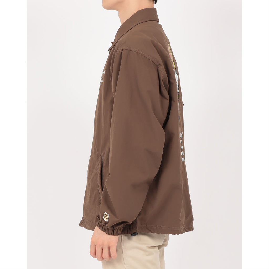 A coach jacket made from nylon taslan with a matte finish and a wrinkled texture created by washing.