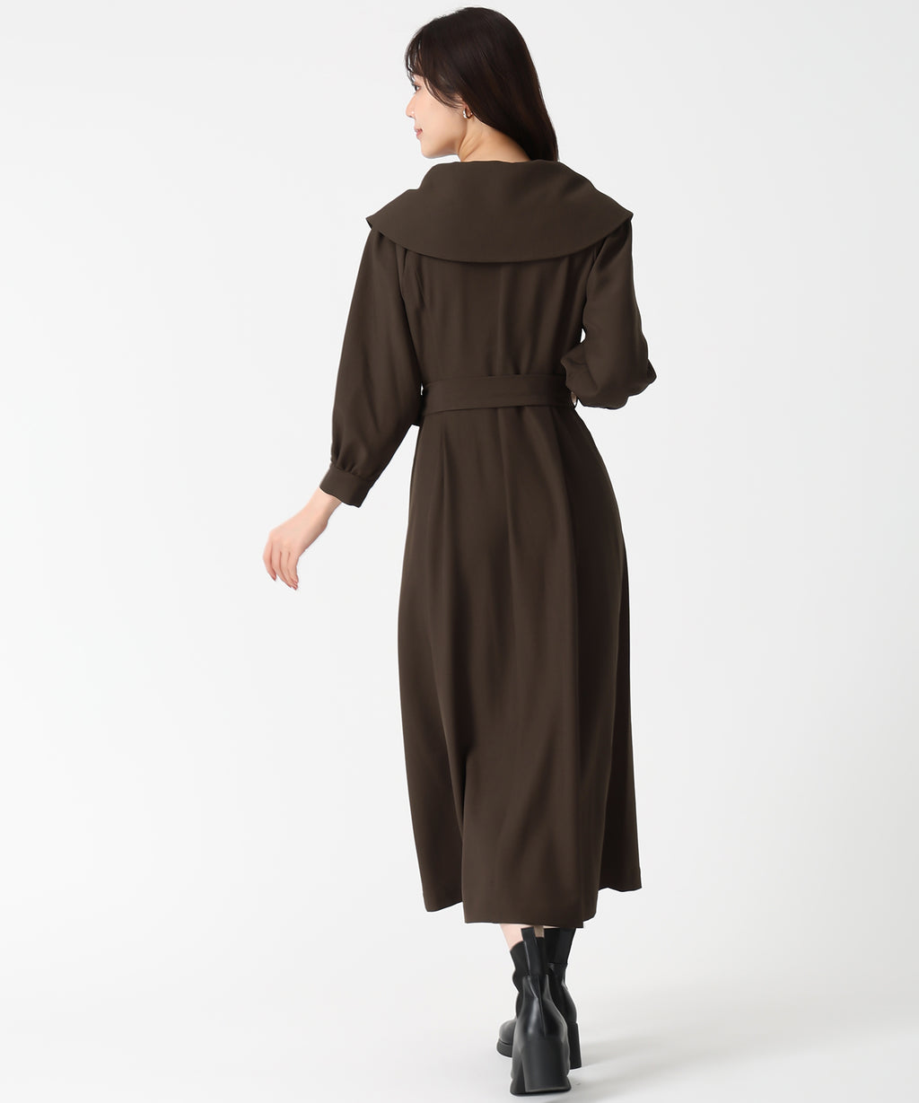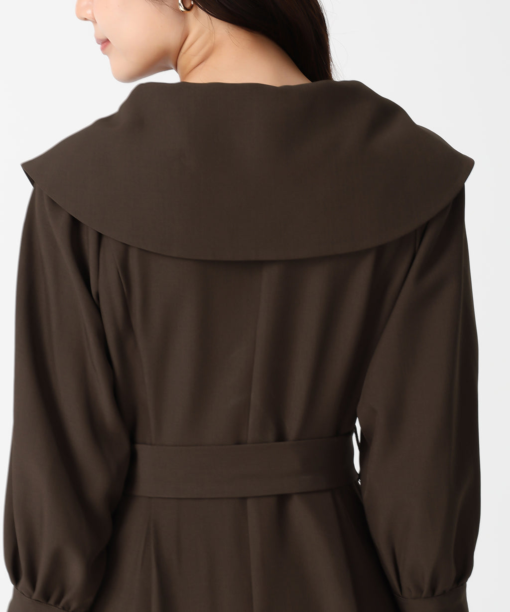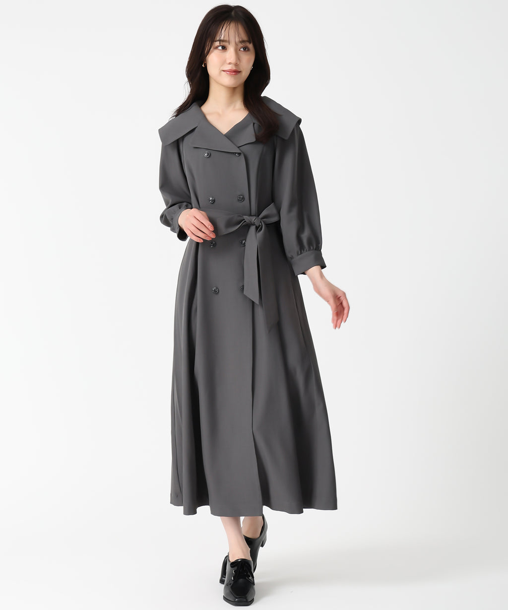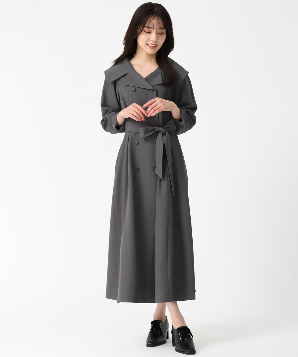 A dress with a classic big collar that becomes a stylish accent. The trench-like design allows for an elegant look. The ribbon that can be used to mark the waist is a key point. It is an item that completes a holiday outing coordinate with just one piece.