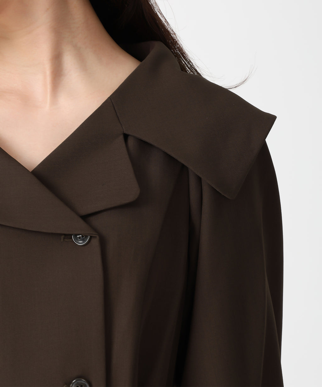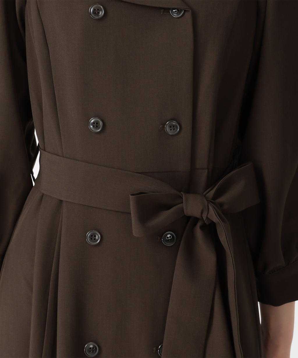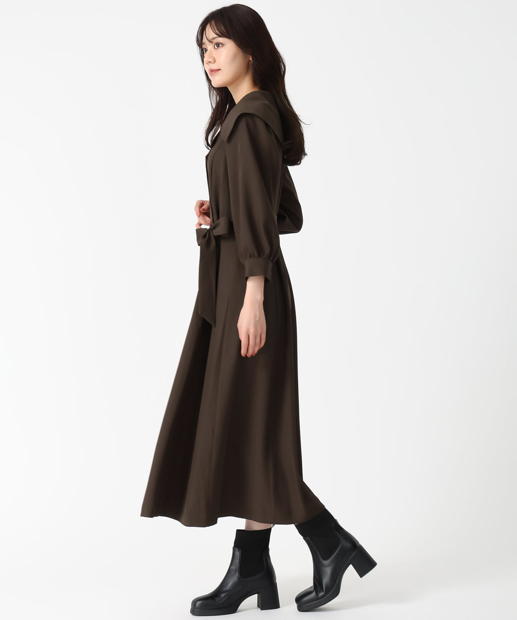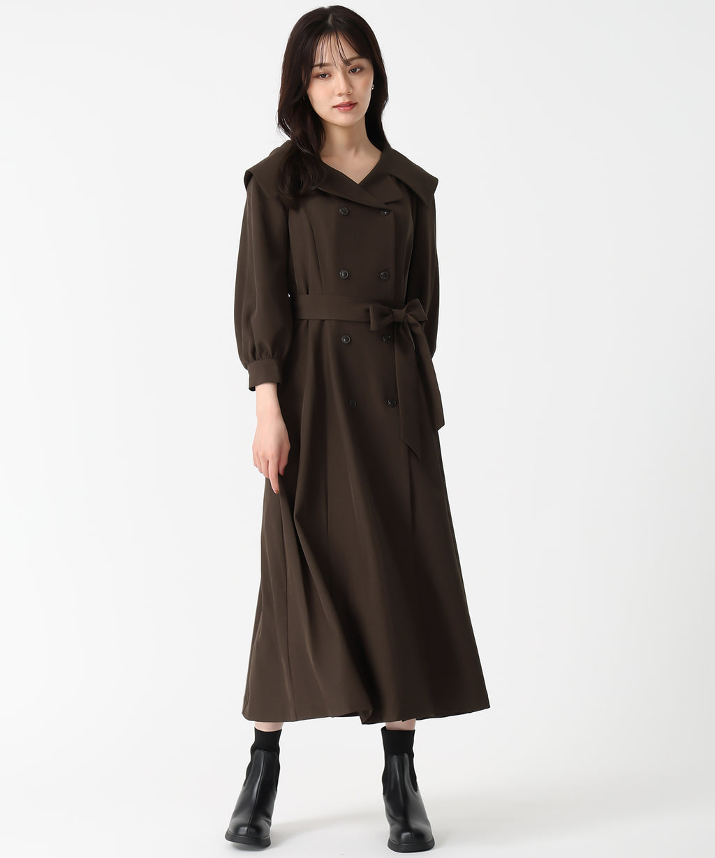A dress with a classic big collar that becomes a stylish accent. The trench-like design allows for an elegant look. The ribbon that can be used to mark the waist is a key point. It is an item that completes a holiday outing coordinate with just one piece.