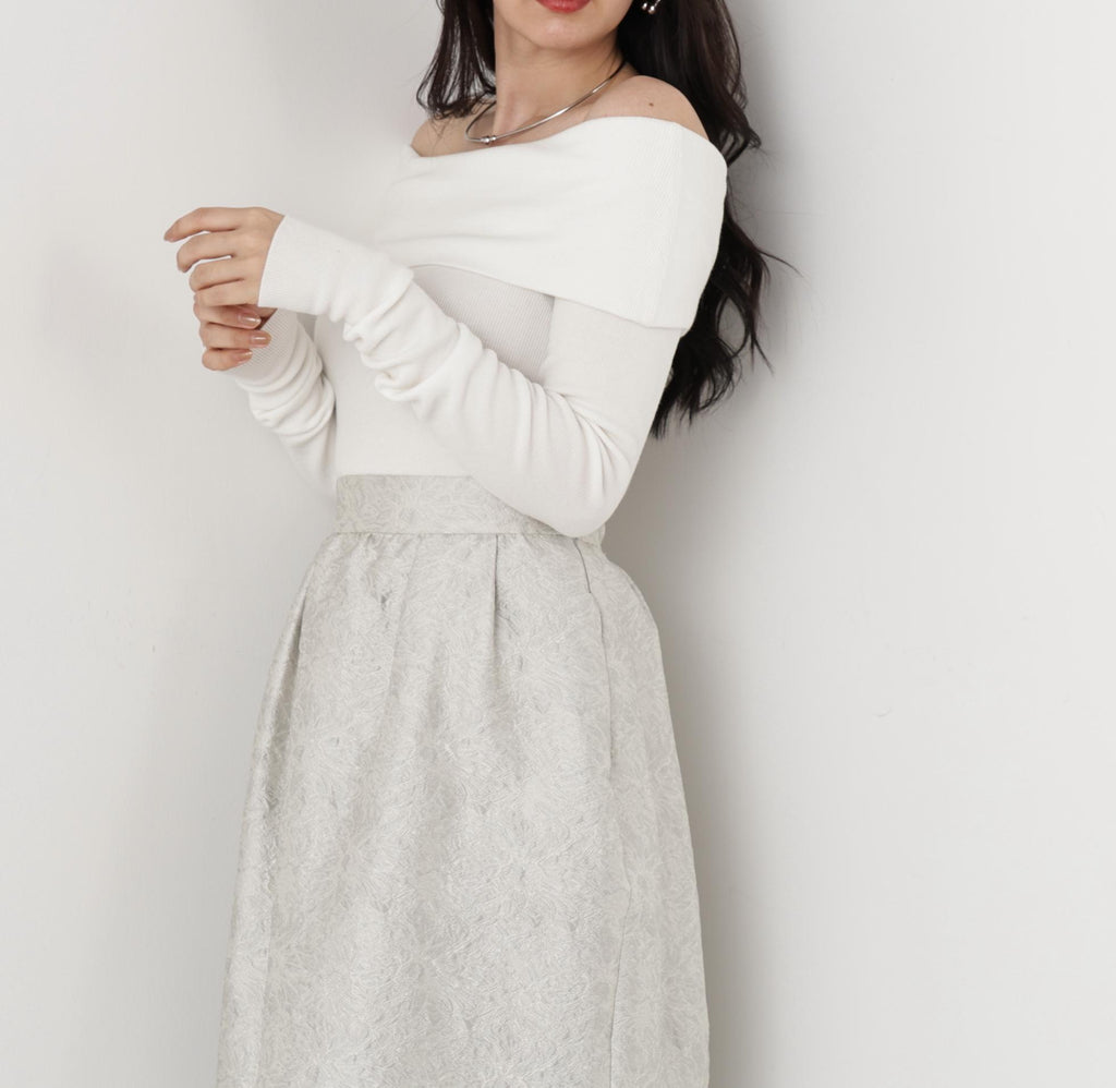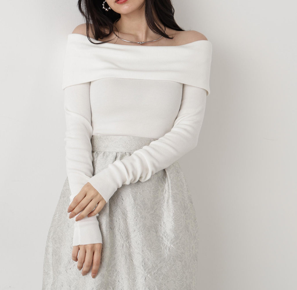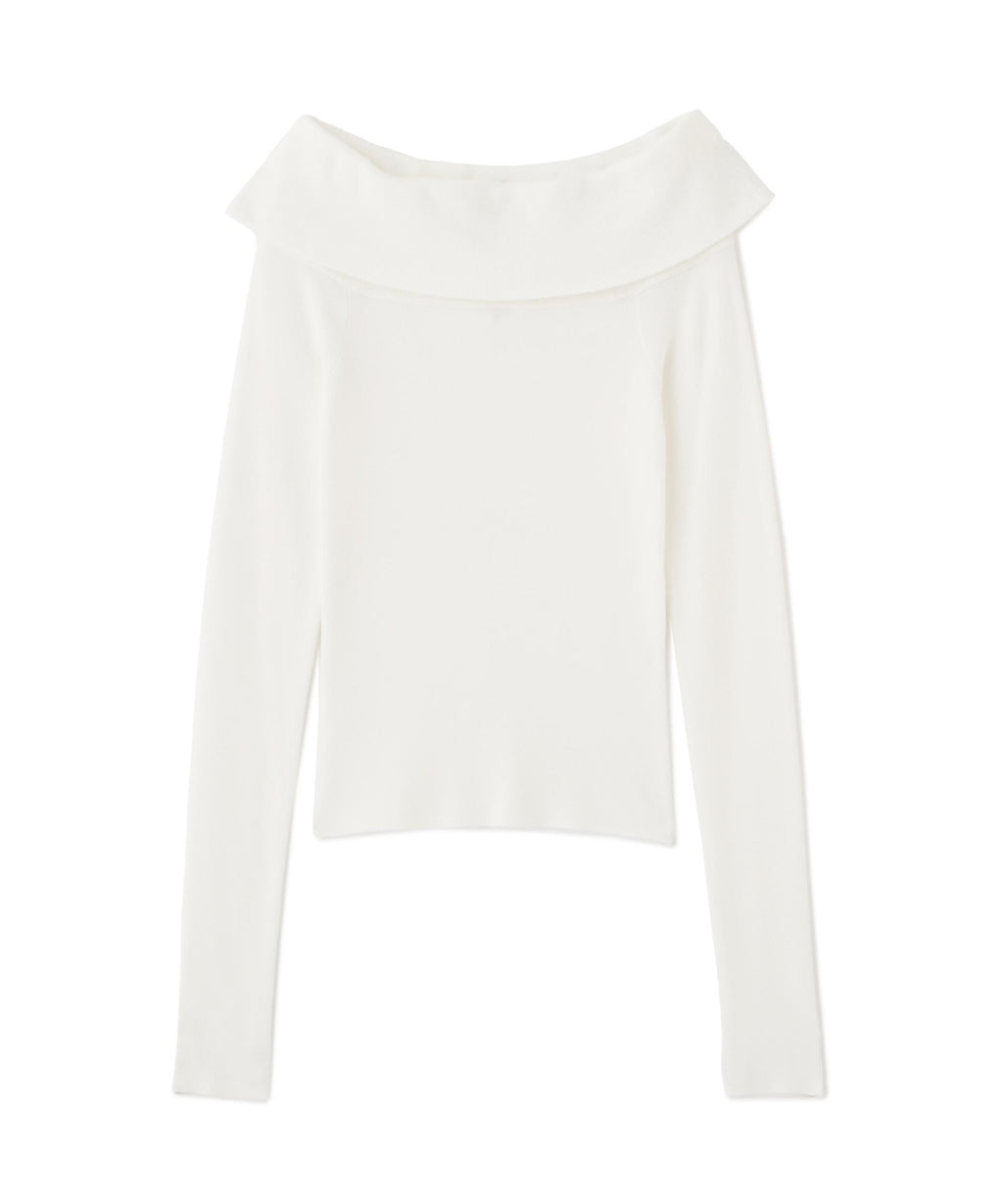 You can fold back the off-shoulder part at the shoulders and wear it at your preferred position, allowing for styles that expose both shoulders or a loose diagonal look, depending on the occasion. A fitted top made from a smooth wool blend material.