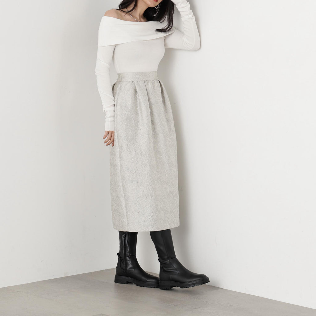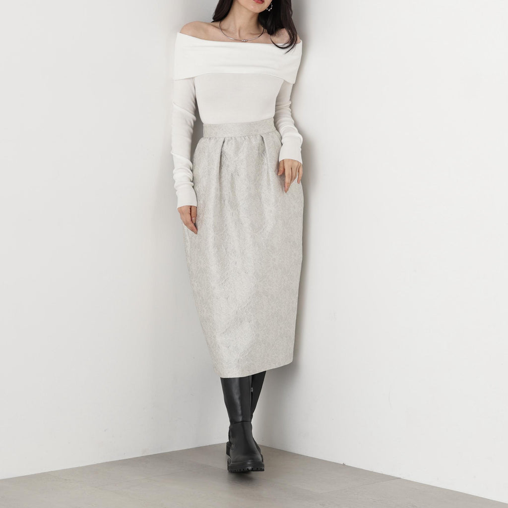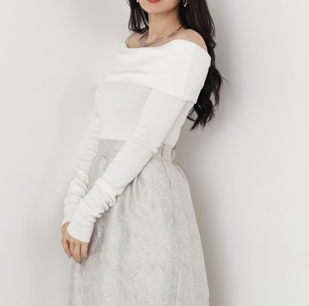 You can fold back the off-shoulder part at the shoulders and wear it at your preferred position, allowing for styles that expose both shoulders or a loose diagonal look, depending on the occasion. A fitted top made from a smooth wool blend material.