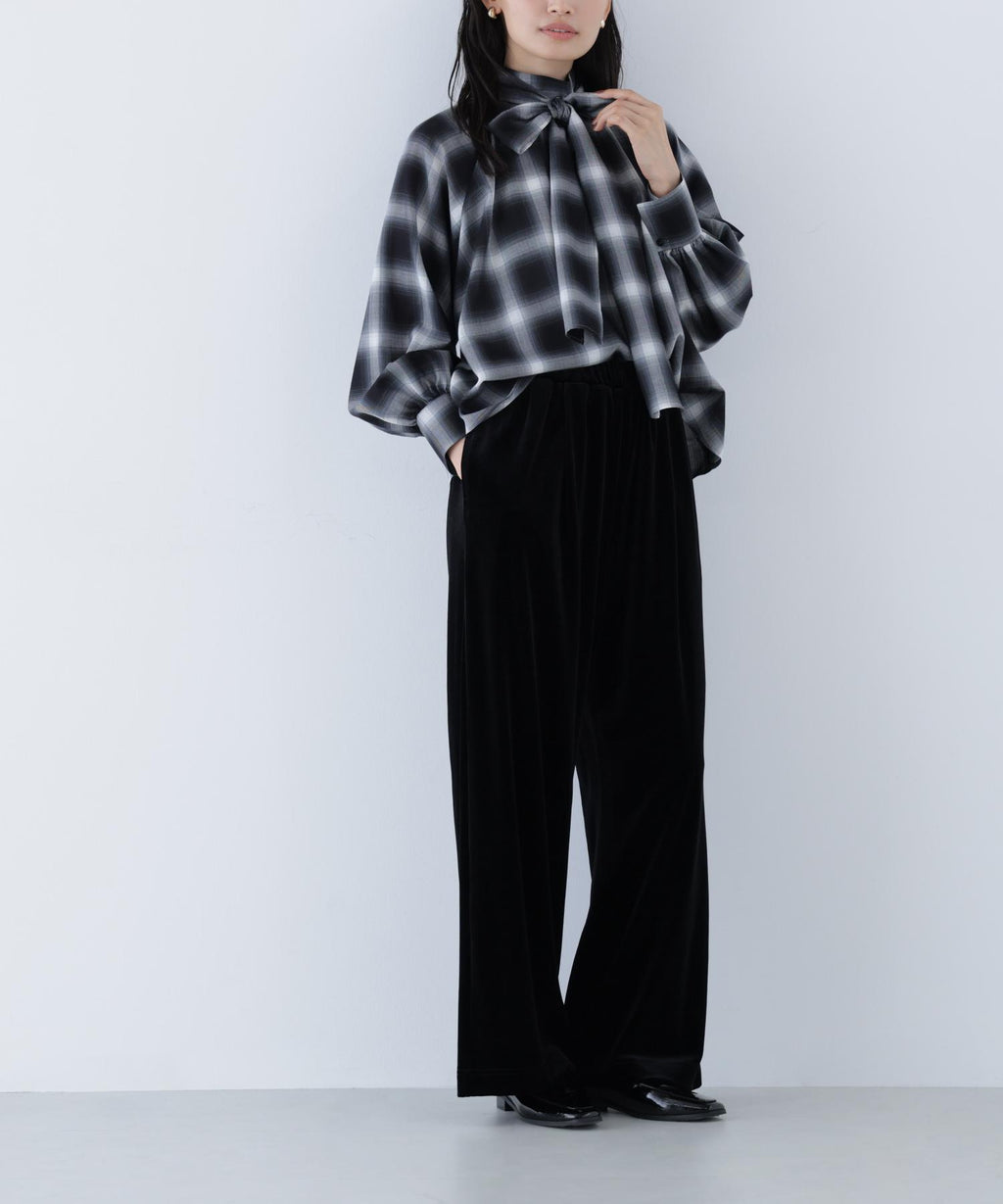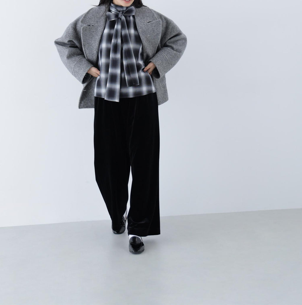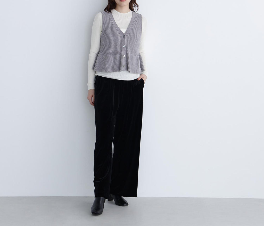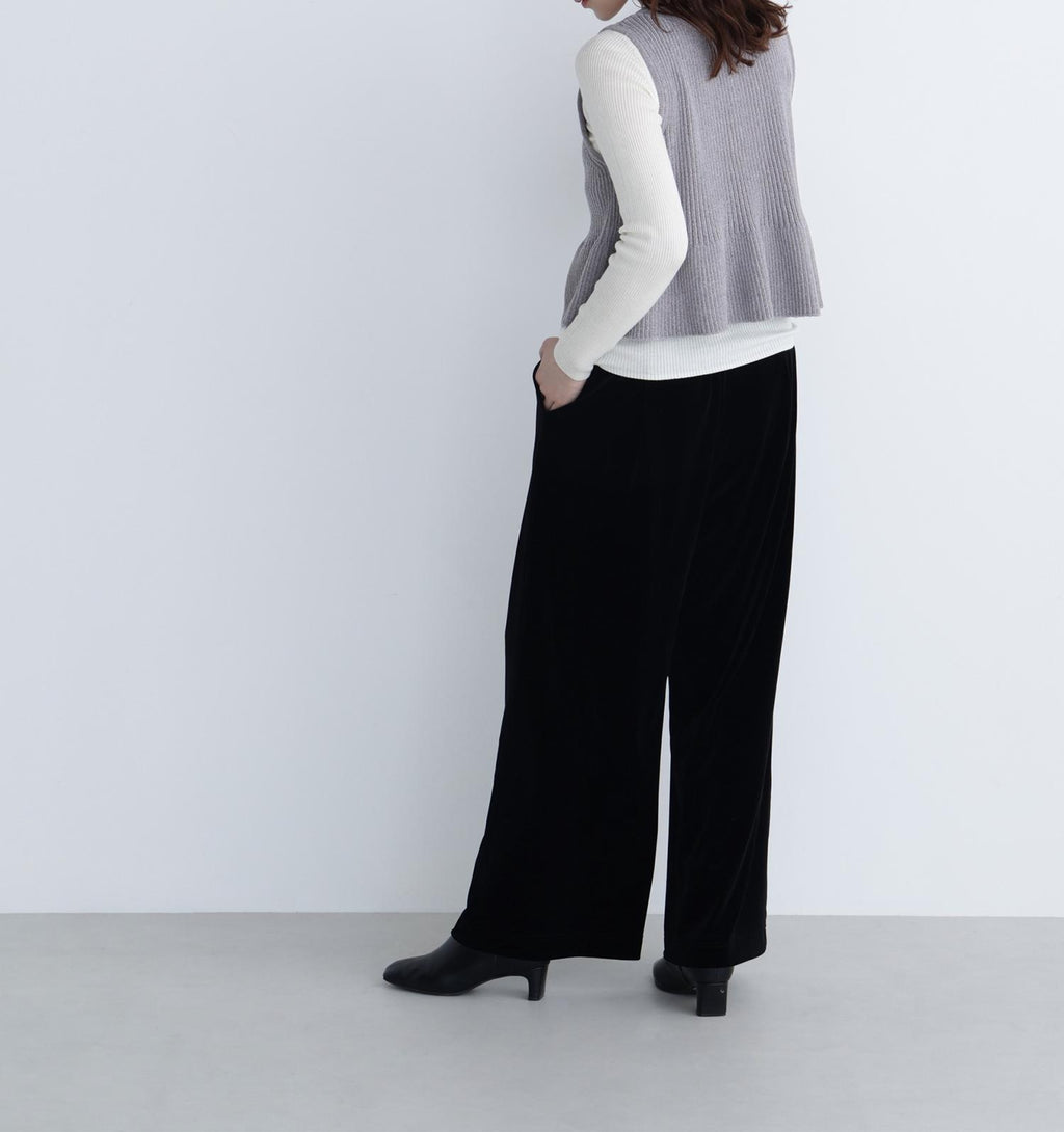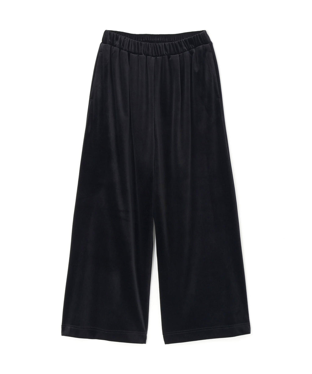 These velour pants feature an easy design that exudes a sense of relaxation, making them perfect for daily wear. The Waist is designed with an all-elastic specification for easy wear. The glossy velour material adds a touch of elegance to your coordination. The straight silhouette with a draping effect creates a beautiful leg appearance.