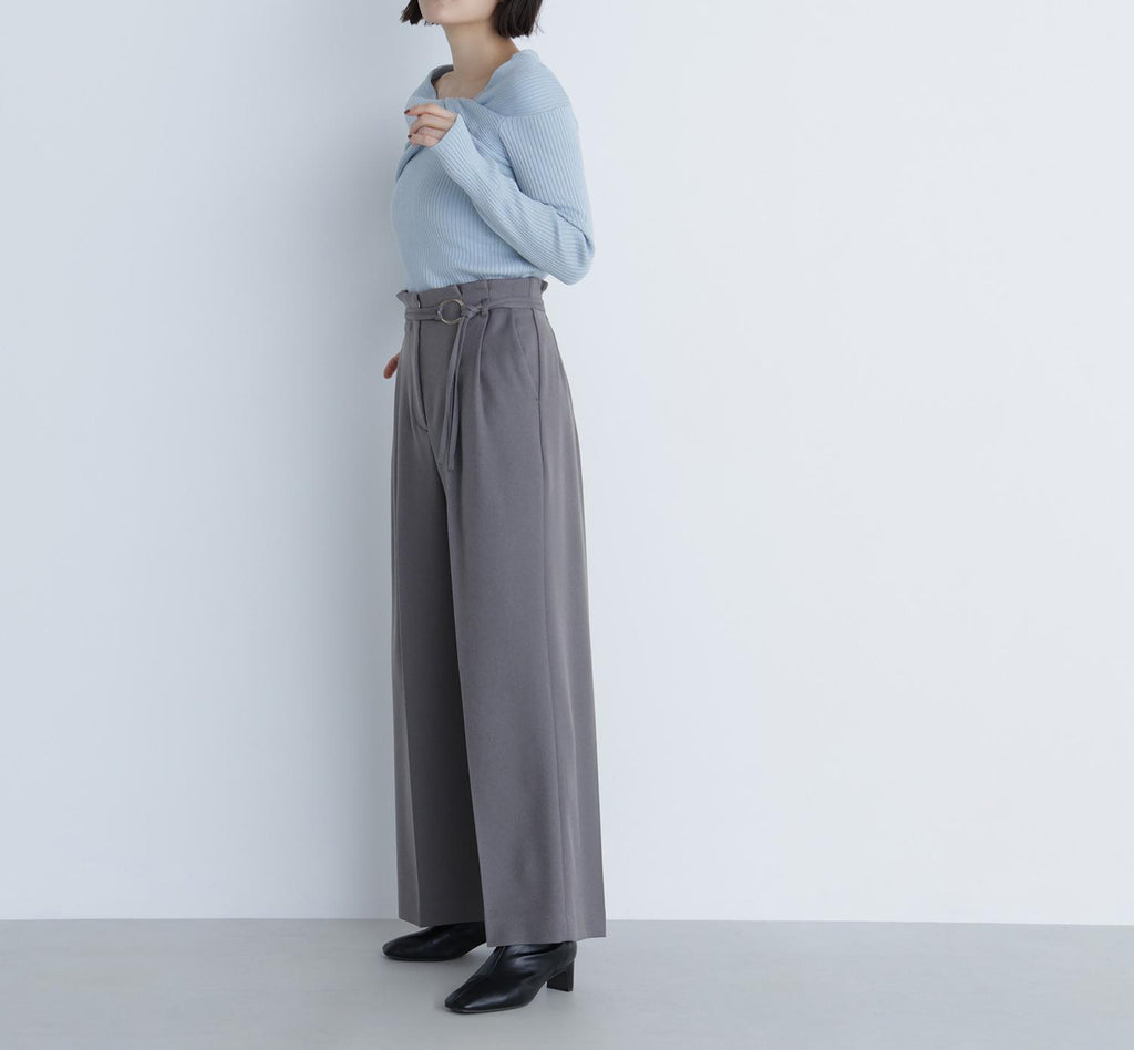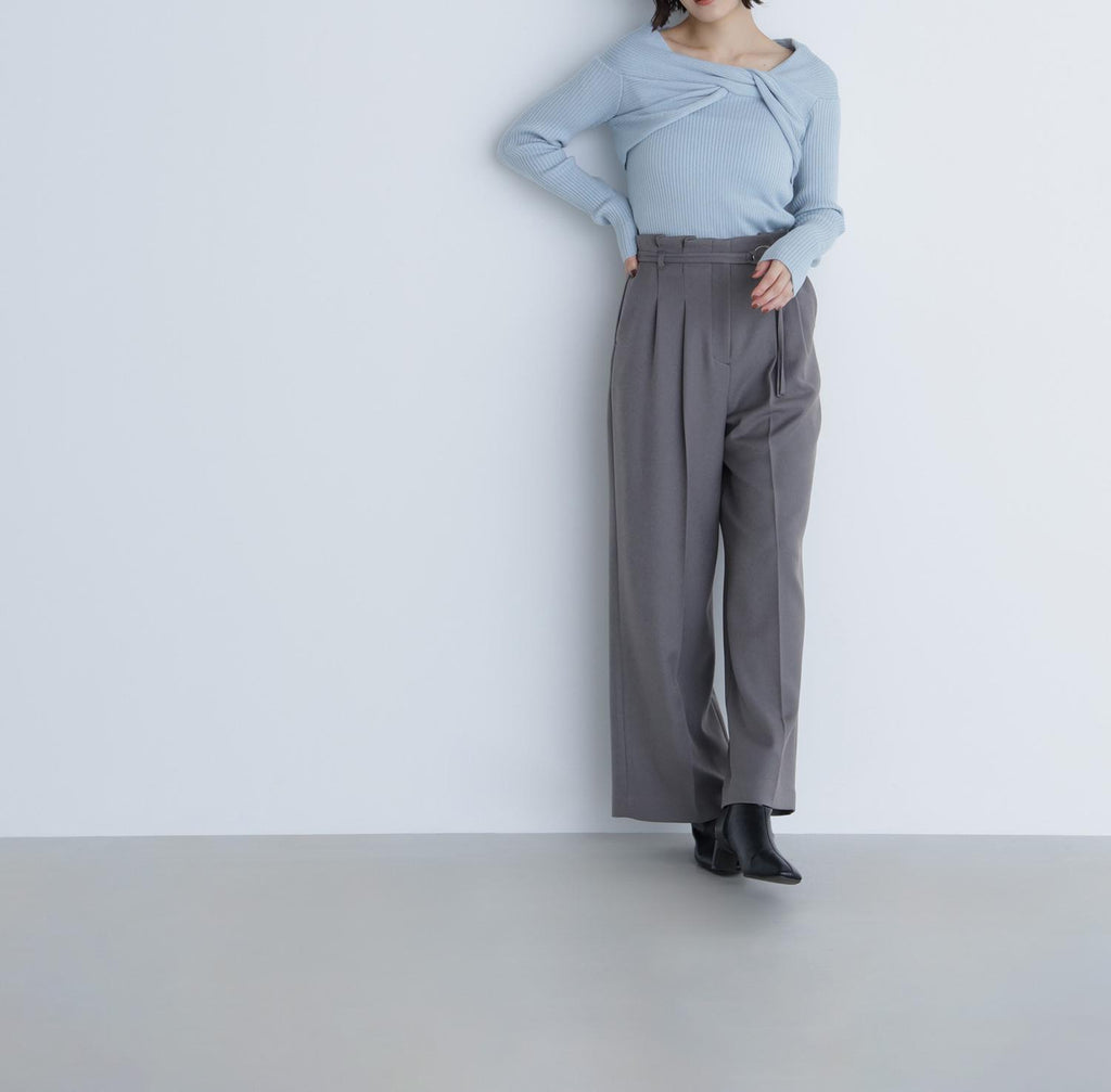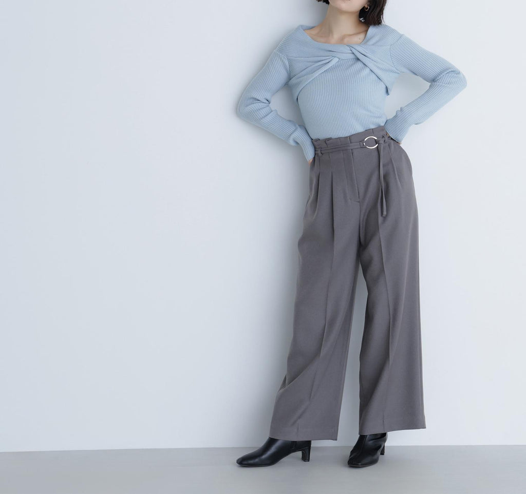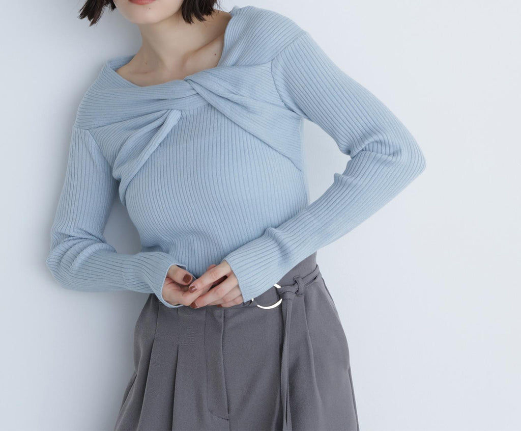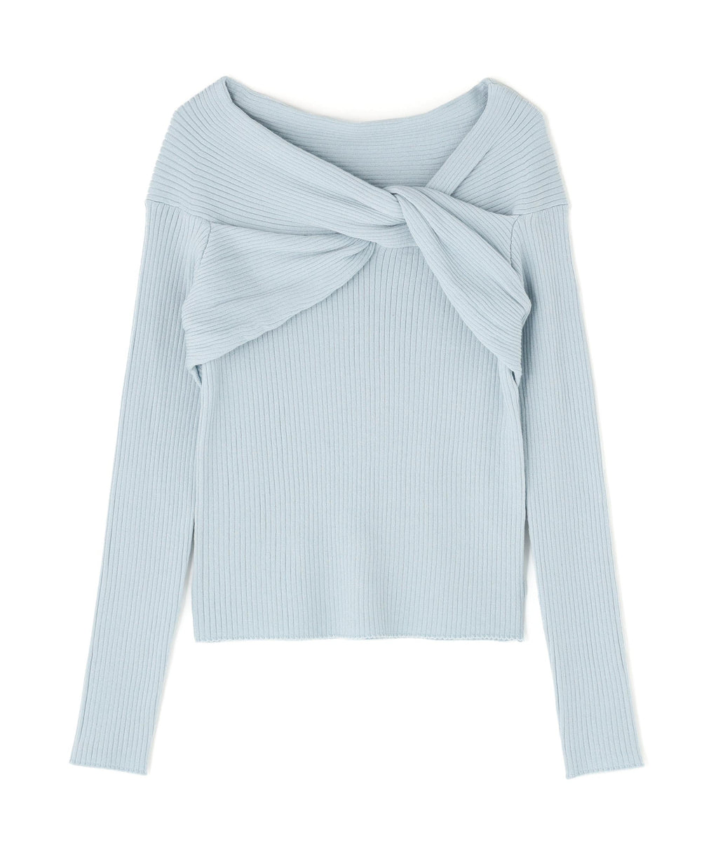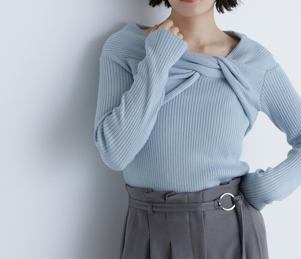 A glamorous ribbed knit pullover made with delicate glitter yarn. The design features a three-dimensional twist from the body, adding a feminine sense of Firmness. The collar can be worn off the shoulder like a boat neck, achieving a sense of security and ease. Depending on the bottoms, it can be styled casually or in a ladylike manner.