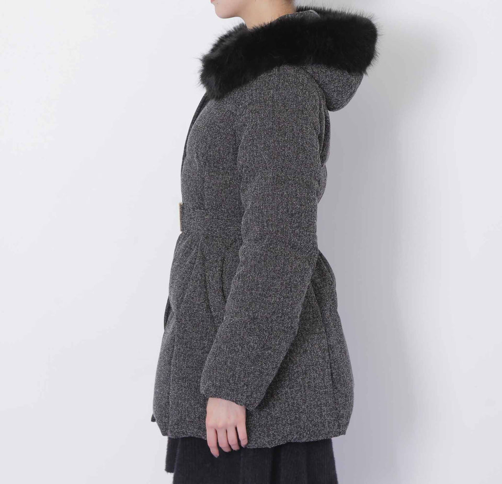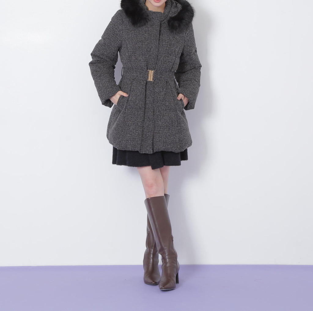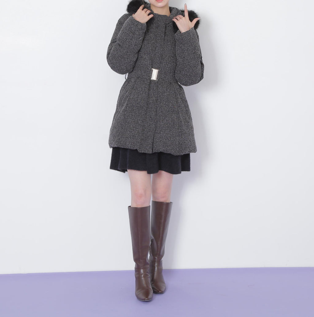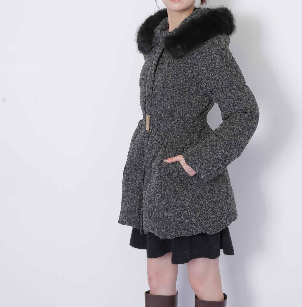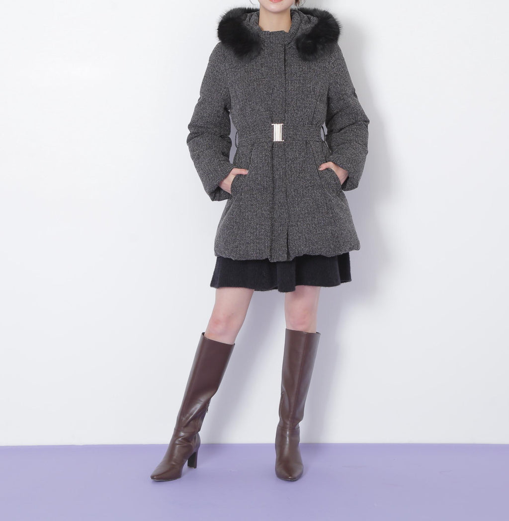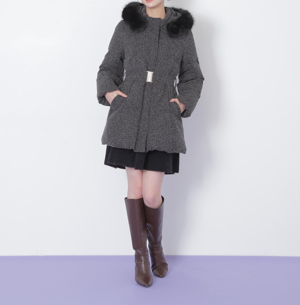 A sophisticated down coat that enhances your style with a Waist mark. It features a silhouette that provides solid warmth with down feathers while allowing for a non-bulky fit. The hood is adorned with voluminous fake fur, adding a glamorous touch around the face. When you tighten the included belt on the silhouette that gently follows the body, it creates a sleek appearance around the Waist. It is available in two colors: solid black and tweed material, making it easy to style. *Please note that due to lighting conditions during photography, the color may appear different. Additionally, depending on the environment of your computer or smartphone, the product's Color may slightly differ from the images. Thank you for your understanding.*