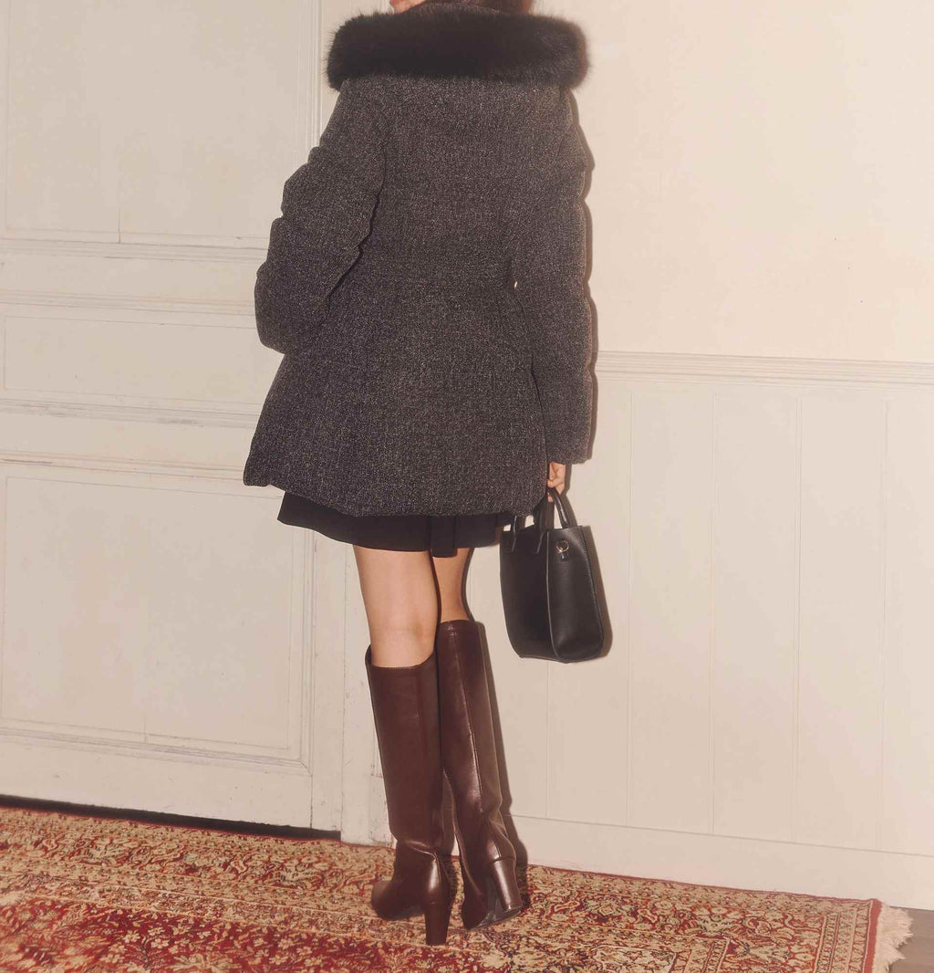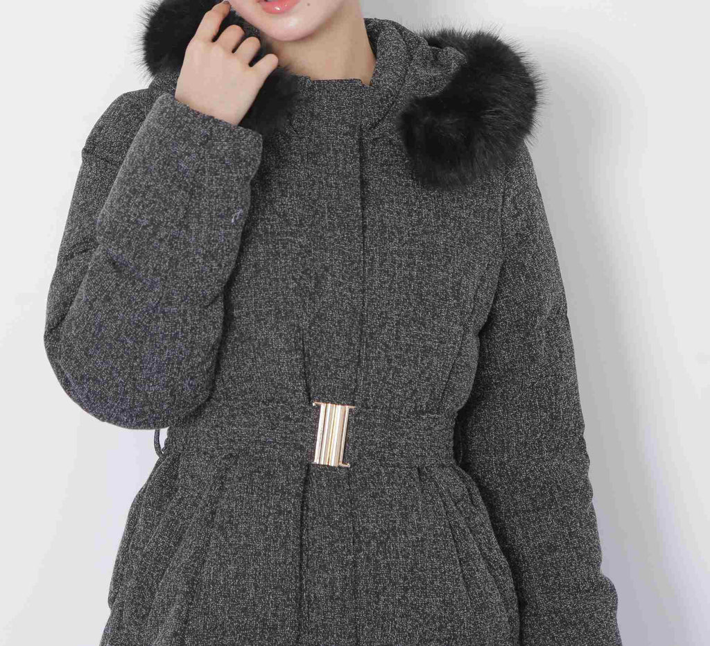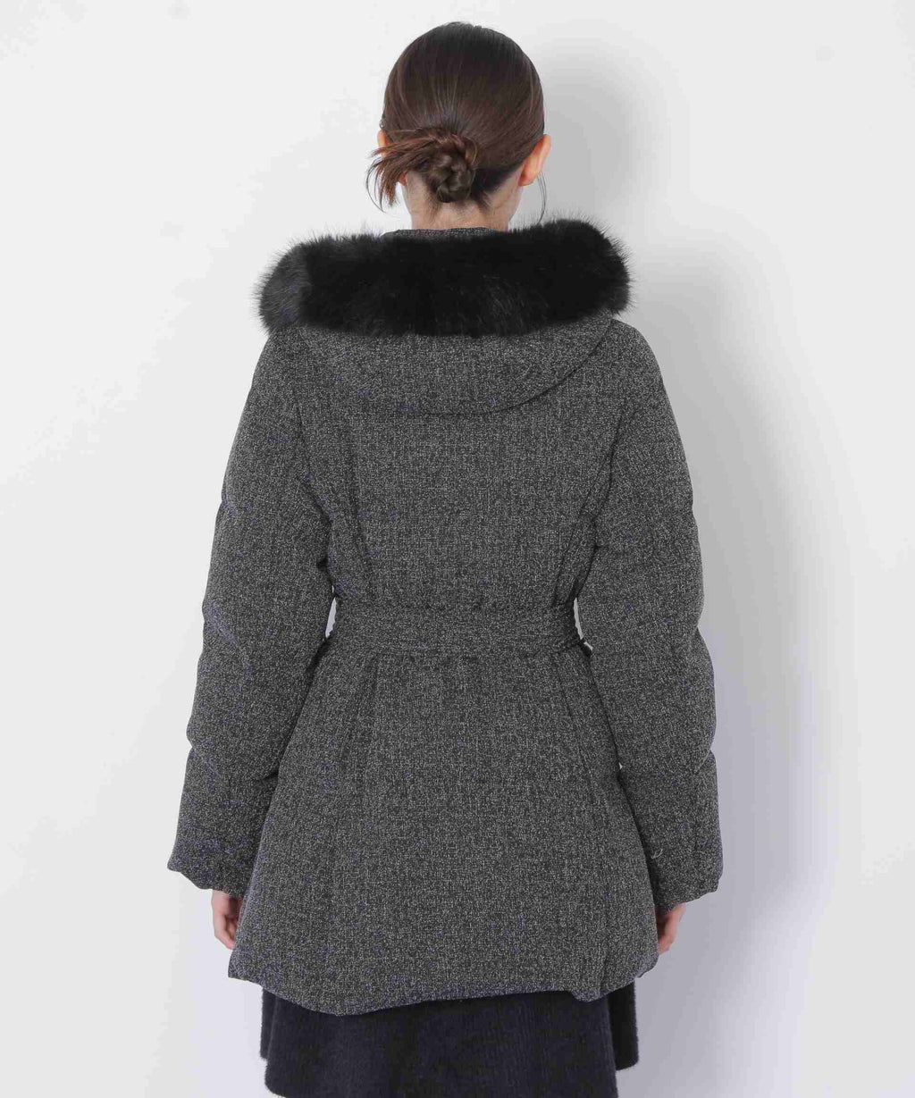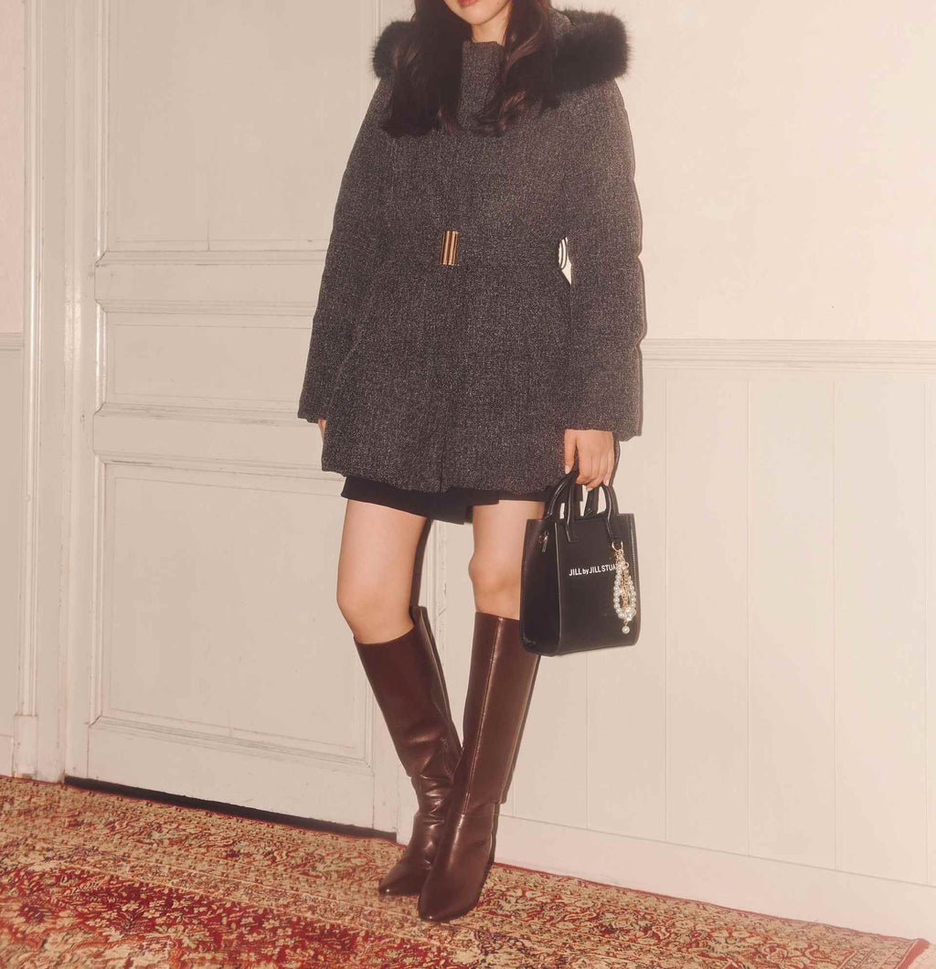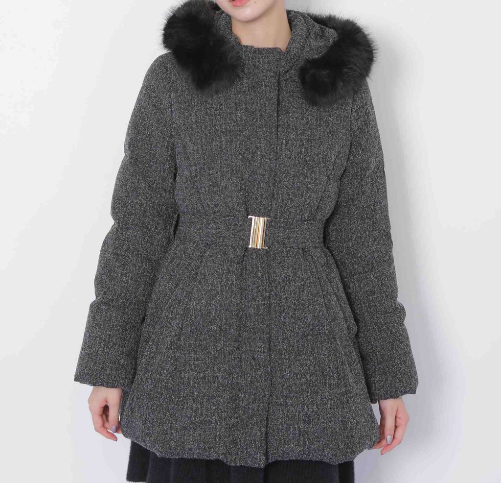 A sophisticated down coat that enhances your style with a Waist mark. It features a silhouette that provides solid warmth with down feathers while allowing for a non-bulky fit. The hood is adorned with voluminous fake fur, adding a glamorous touch around the face. When you tighten the included belt on the silhouette that gently follows the body, it creates a sleek appearance around the Waist. It is available in two colors: solid black and tweed material, making it easy to style. *Please note that due to lighting conditions during photography, the color may appear different. Additionally, depending on the environment of your computer or smartphone, the product's Color may slightly differ from the images. Thank you for your understanding.*