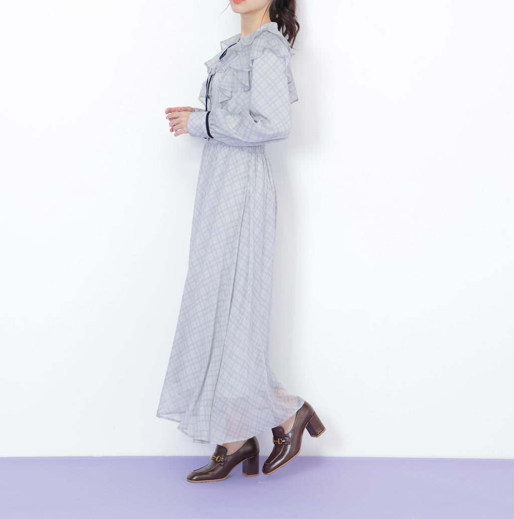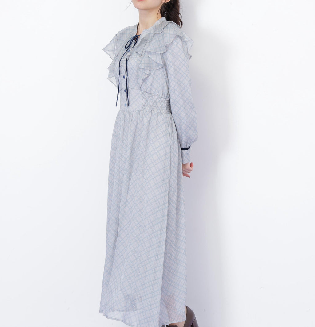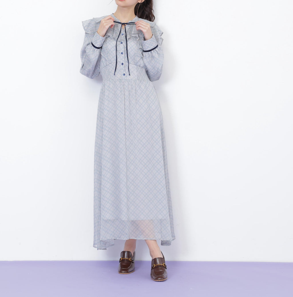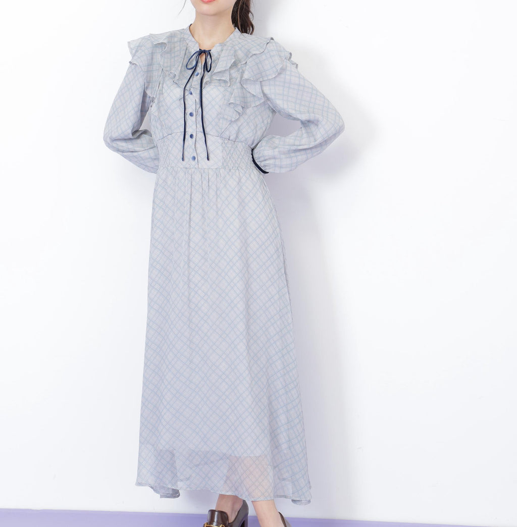 A reliable one-piece dress for everyday use and special occasions. It features an elegant design with a delicate sheer check pattern, adorned with velvet tape and buttons. The elastic detail applied from the side of the Waist to the back adds definition to the silhouette. The front ruffle sways beautifully, adding a touch of cuteness. *Please note that due to lighting conditions during photography, the color may appear different. Additionally, depending on the environment of your computer or smartphone, there may be slight differences between the product and the image color. Thank you for your understanding.*