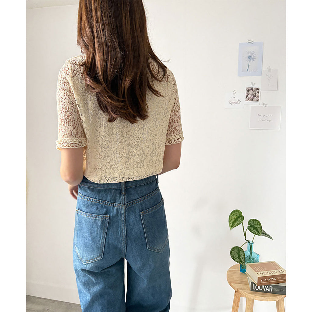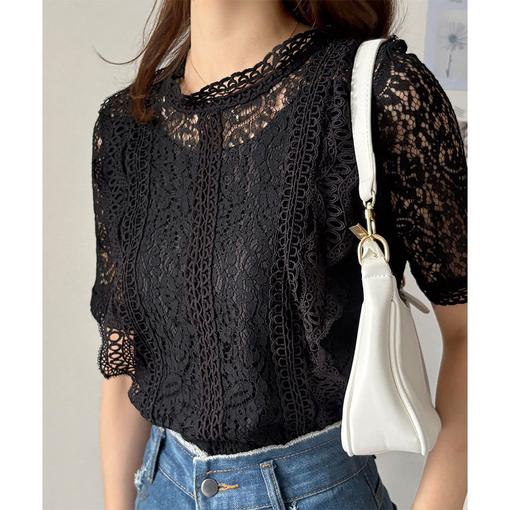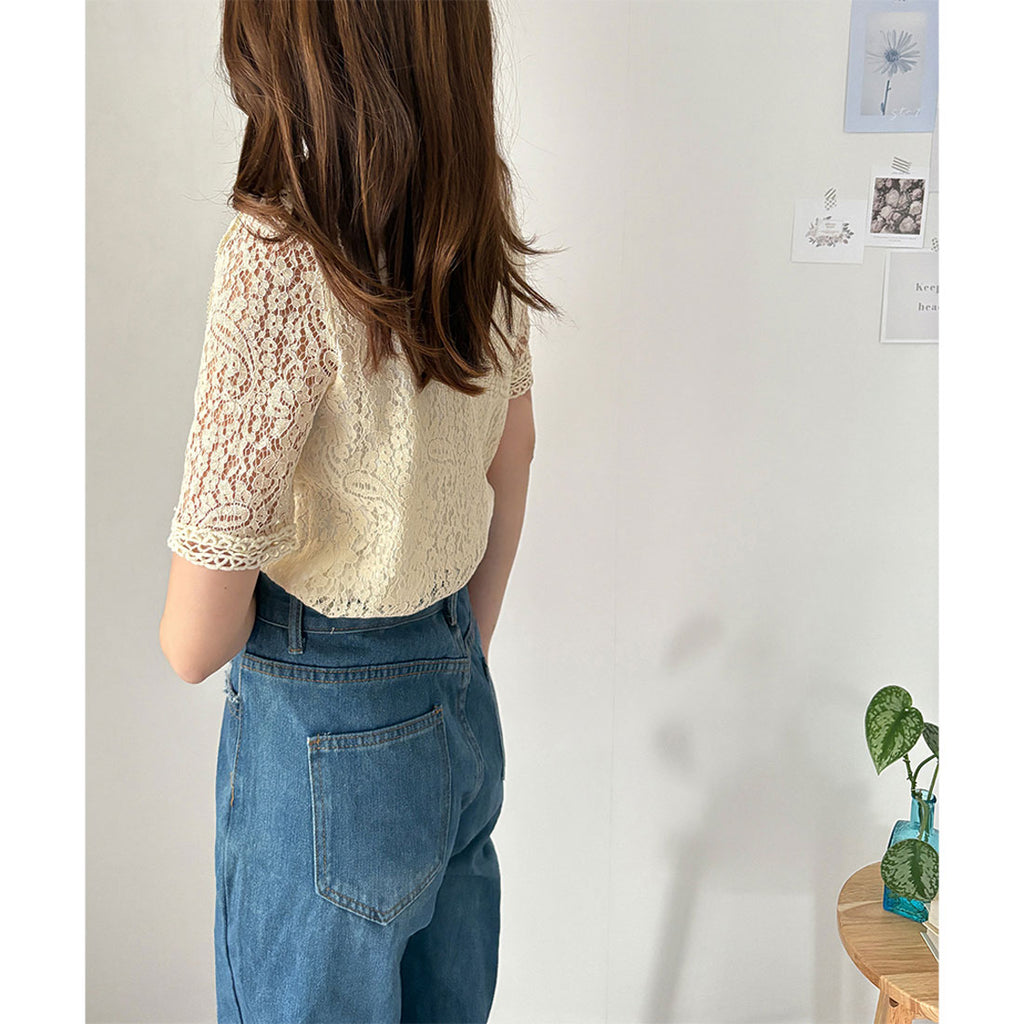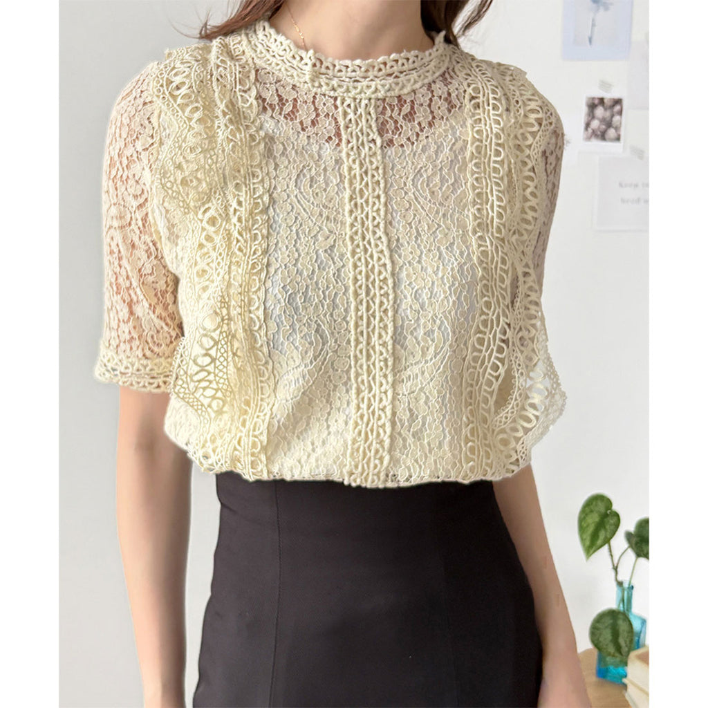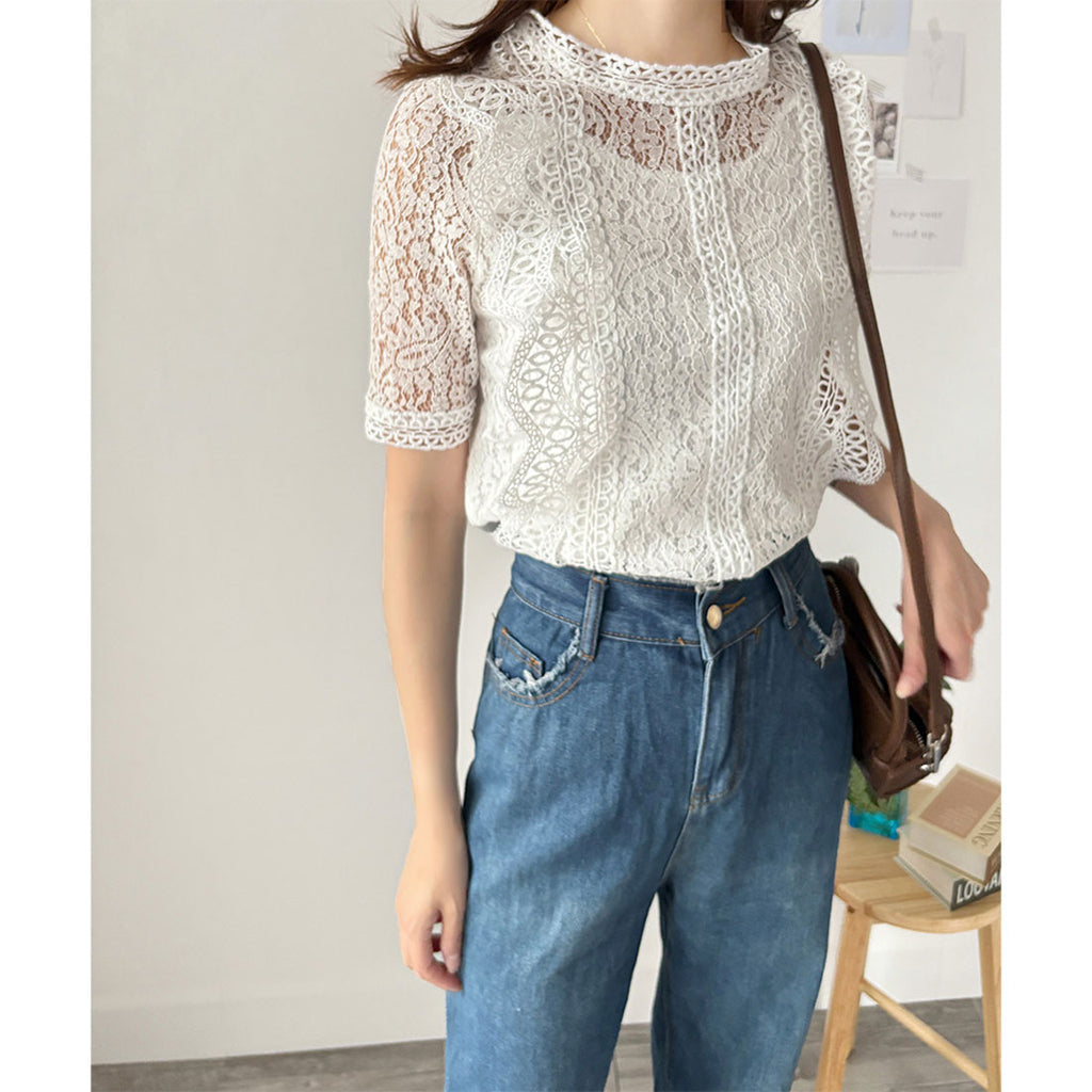 Dewlily Round Neck Short Sleeve Lace Shirt for Women, Korean Casual Short Sleeve Top, Cute, Stylish, Versatile, Outing, Sheer, Airy, Elegant, Spring, Summer, Floral Pattern