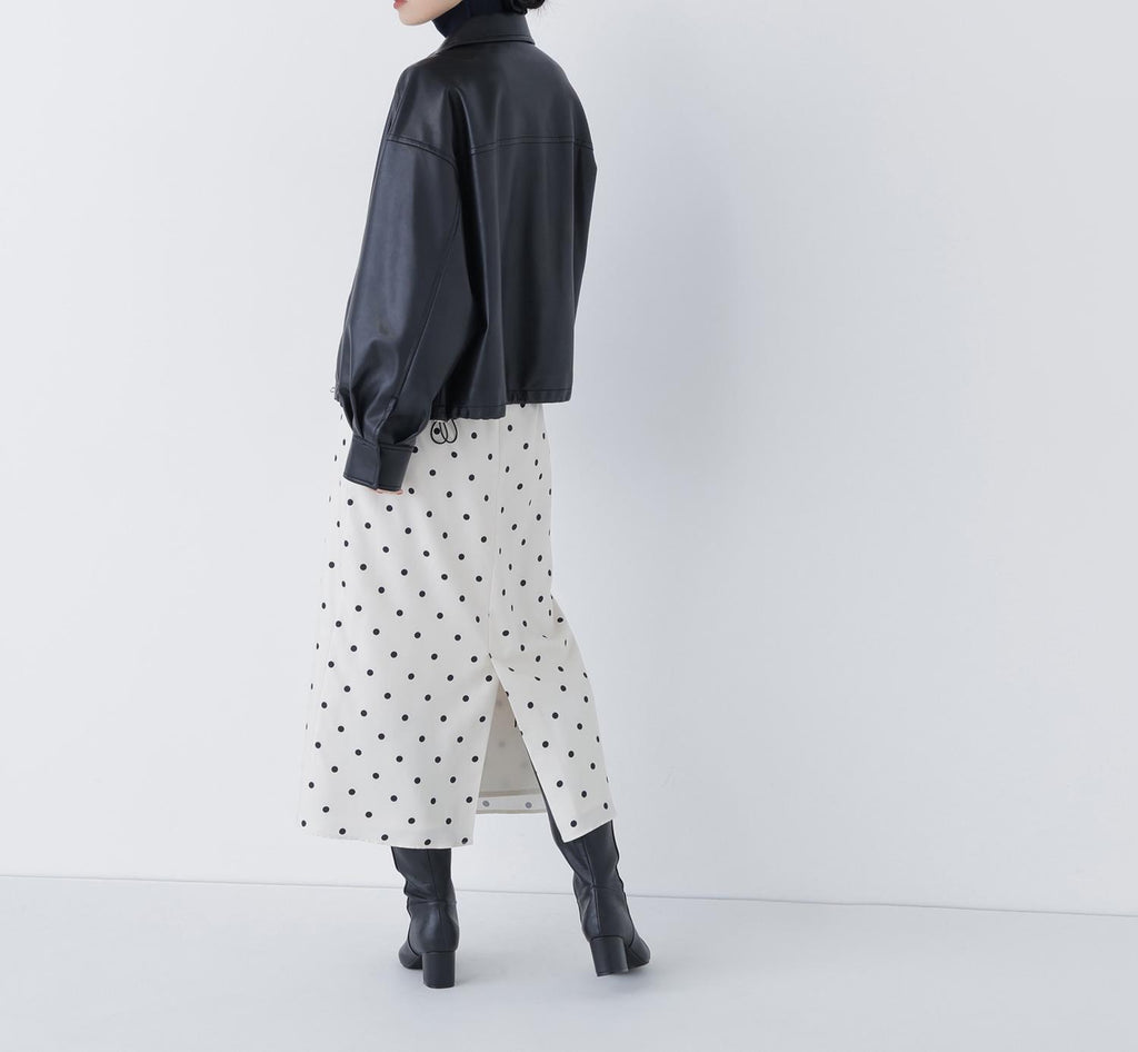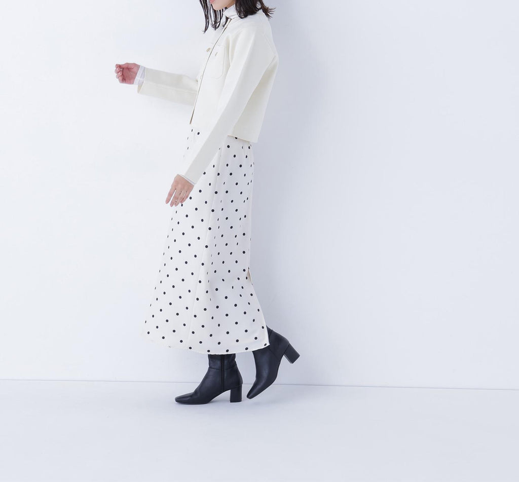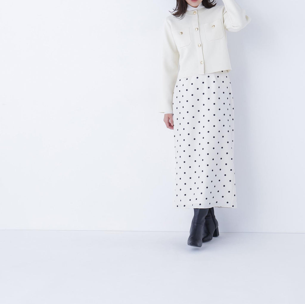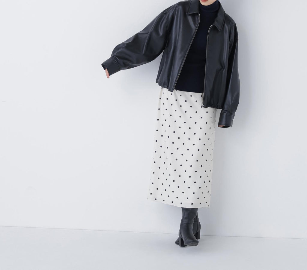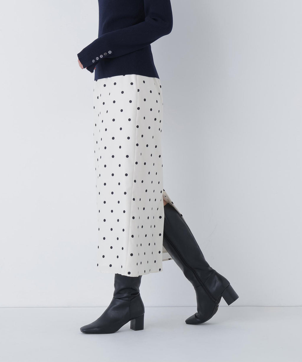 A tight skirt with a polka dot pattern that creates a sense of trend just by wearing it. The smart tight line allows for styling that enjoys both the elegance of an adult woman and a playful spirit. It creates a delicate silhouette with a clean Waist. Pair it with a cable knit or a bicolor cardigan, and long boots are also recommended for the feet.