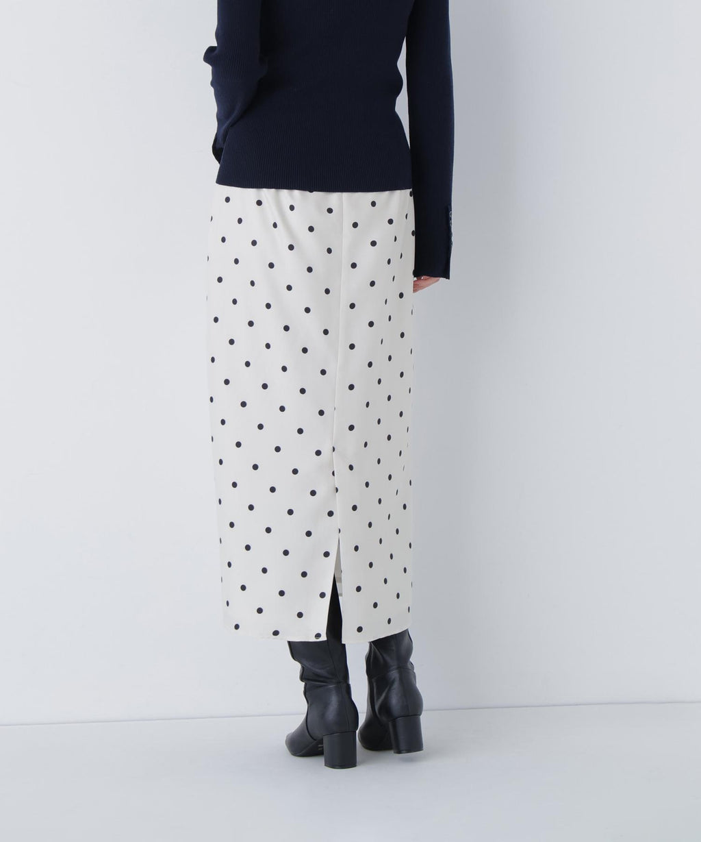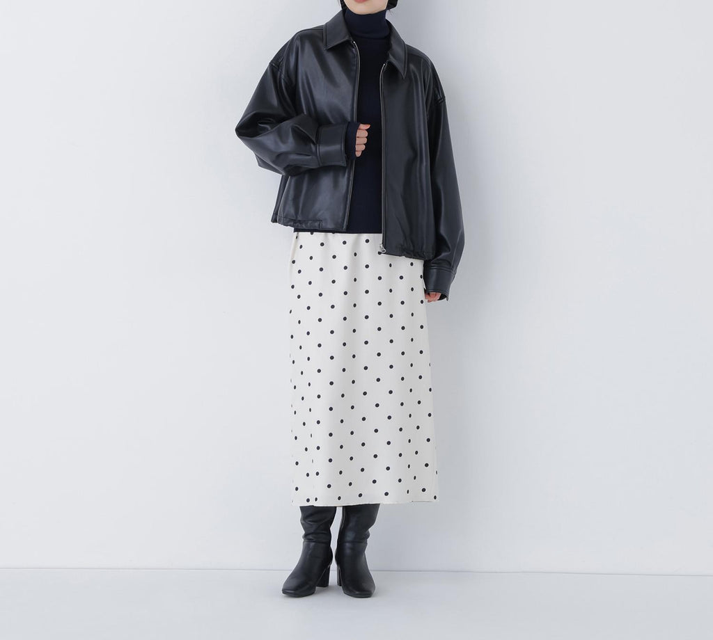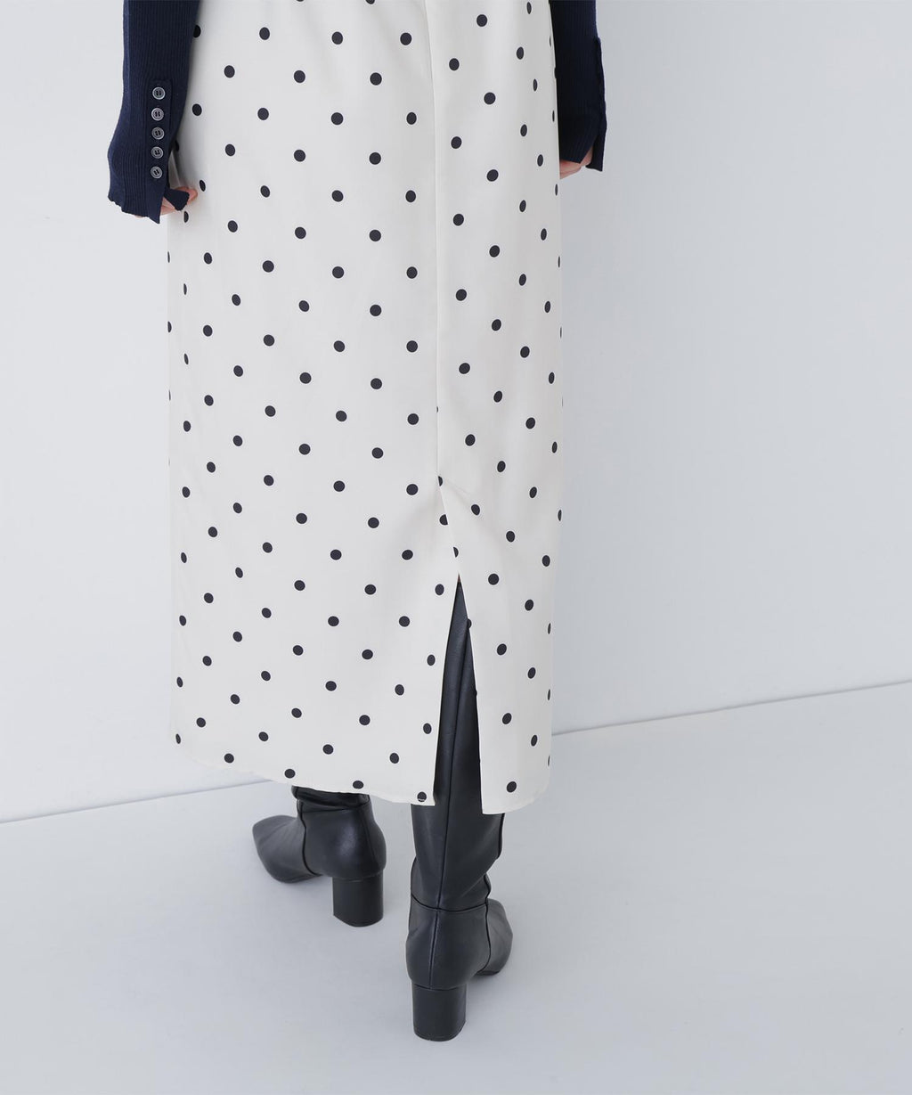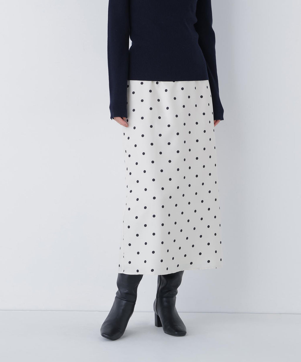 A tight skirt with a polka dot pattern that creates a sense of trend just by wearing it. The smart tight line allows for styling that enjoys both the elegance of an adult woman and a playful spirit. It creates a delicate silhouette with a clean Waist. Pair it with a cable knit or a bicolor cardigan, and long boots are also recommended for the feet.