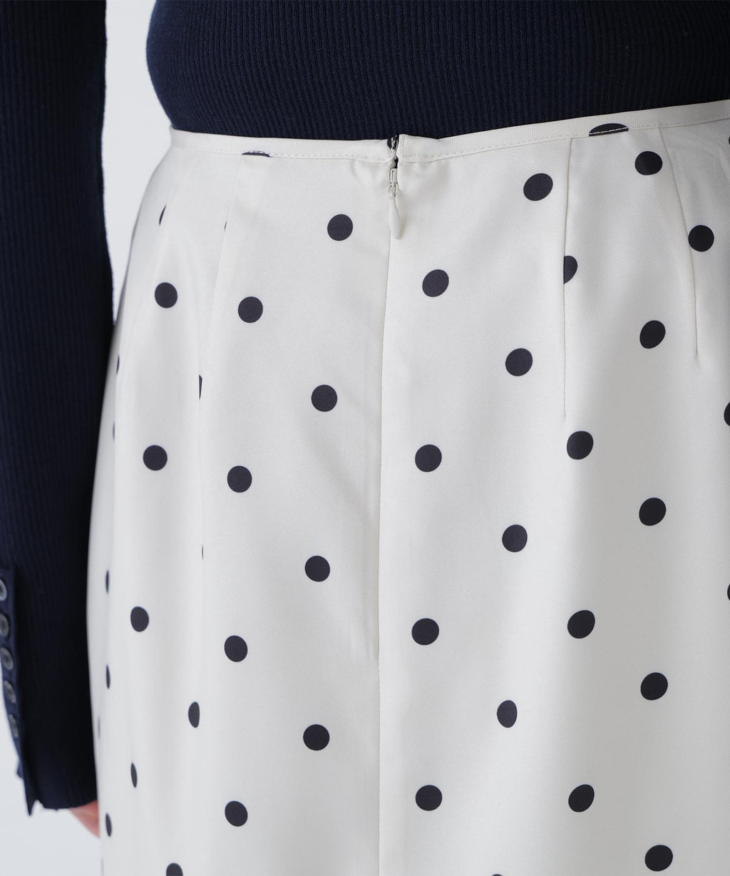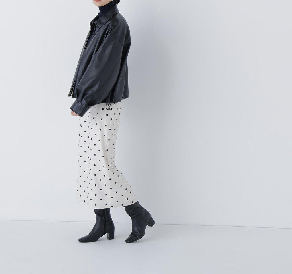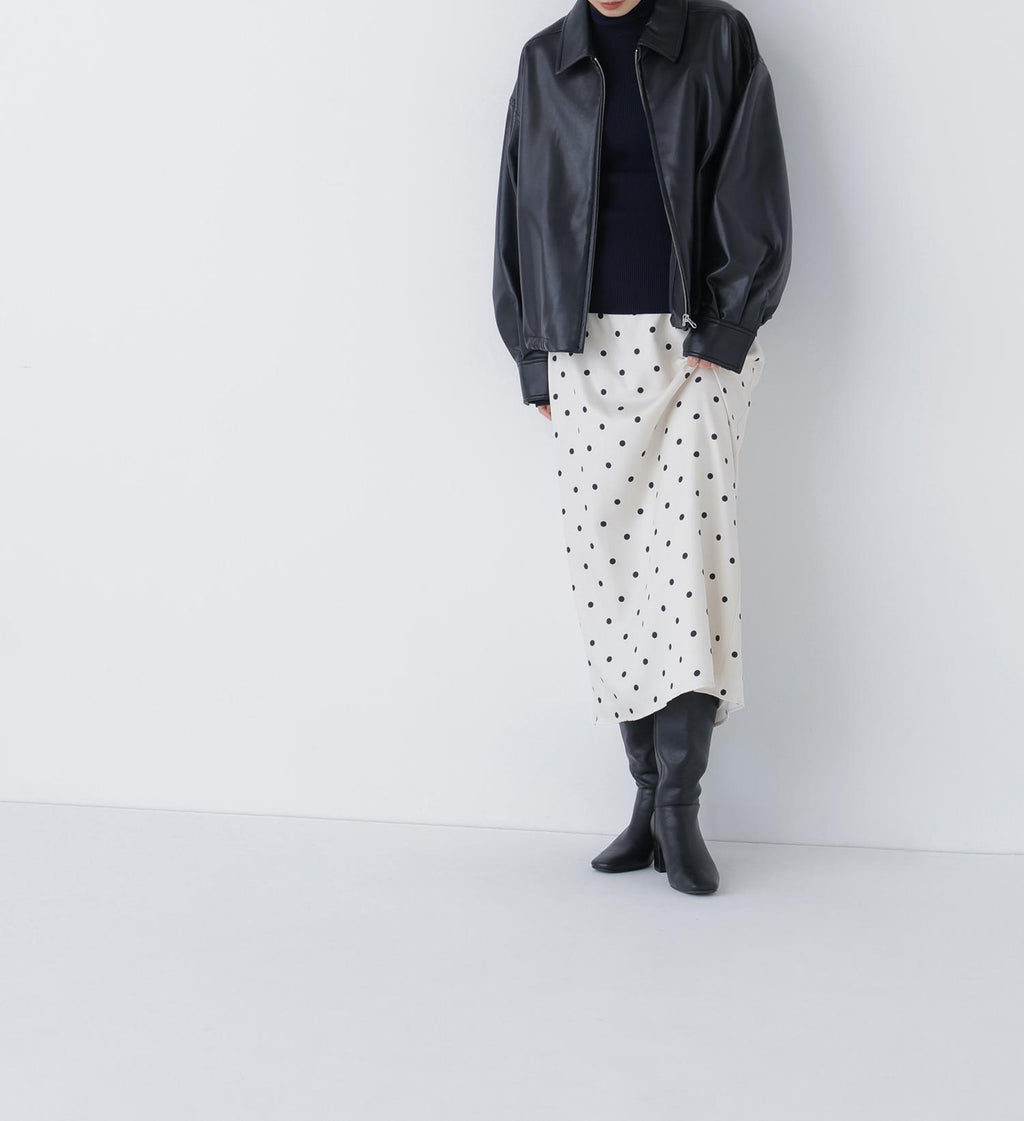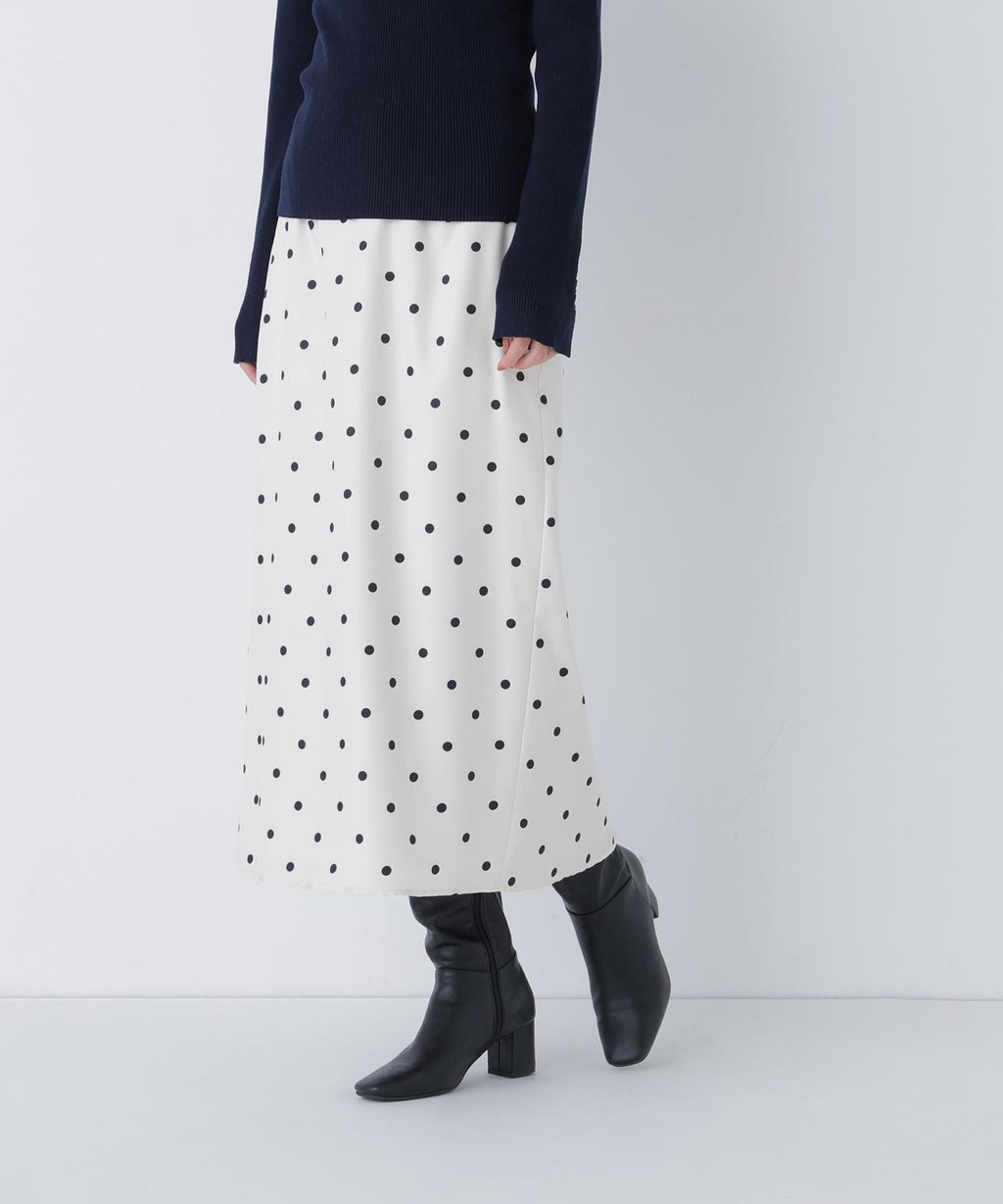 A tight skirt with a polka dot pattern that creates a sense of trend just by wearing it. The smart tight line allows for styling that enjoys both the elegance of an adult woman and a playful spirit. It creates a delicate silhouette with a clean Waist. Pair it with a cable knit or a bicolor cardigan, and long boots are also recommended for the feet.