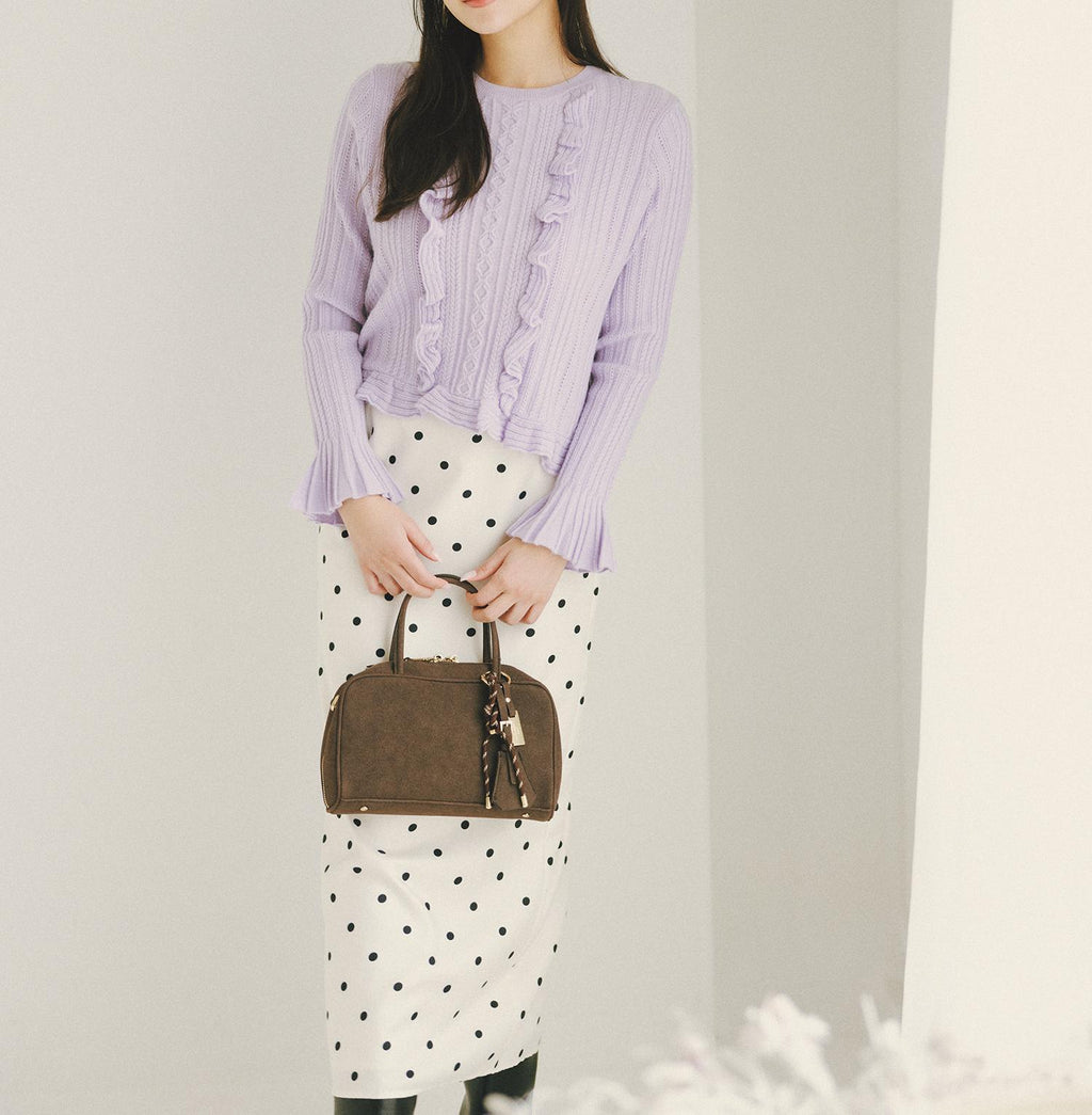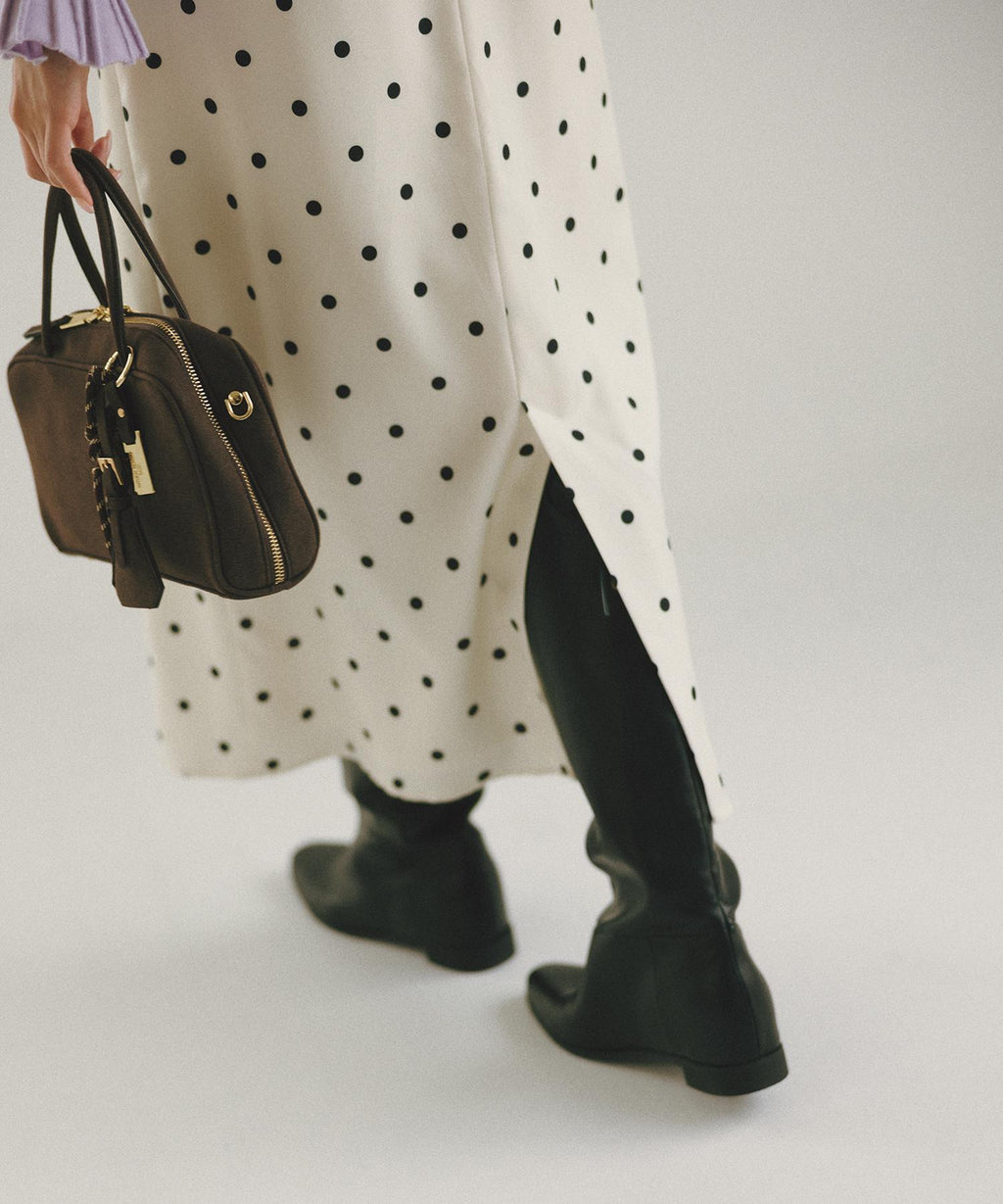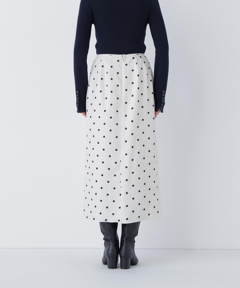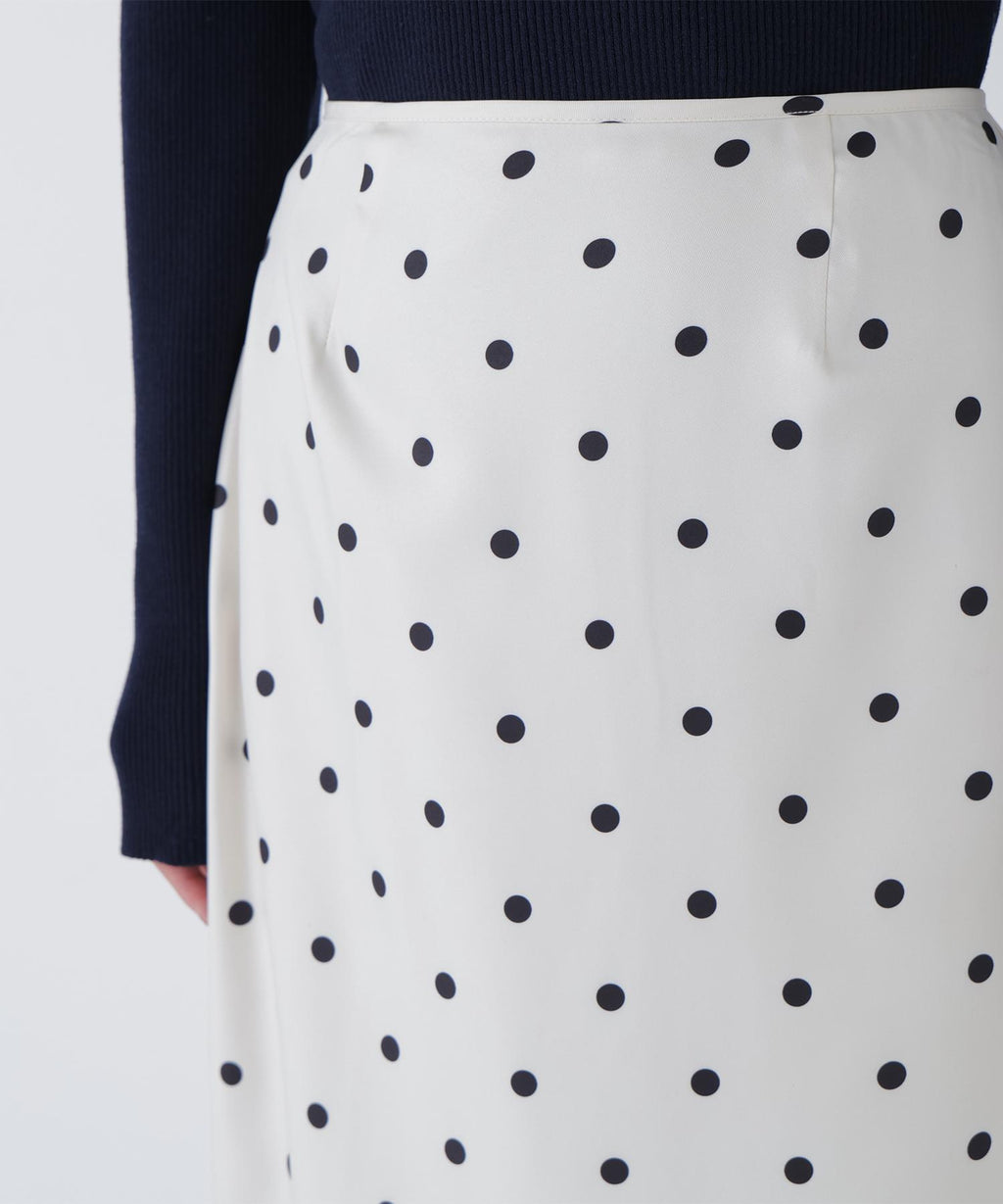 A tight skirt with a polka dot pattern that creates a sense of trend just by wearing it. The smart tight line allows for styling that enjoys both the elegance of an adult woman and a playful spirit. It creates a delicate silhouette with a clean Waist. Pair it with a cable knit or a bicolor cardigan, and long boots are also recommended for the feet.