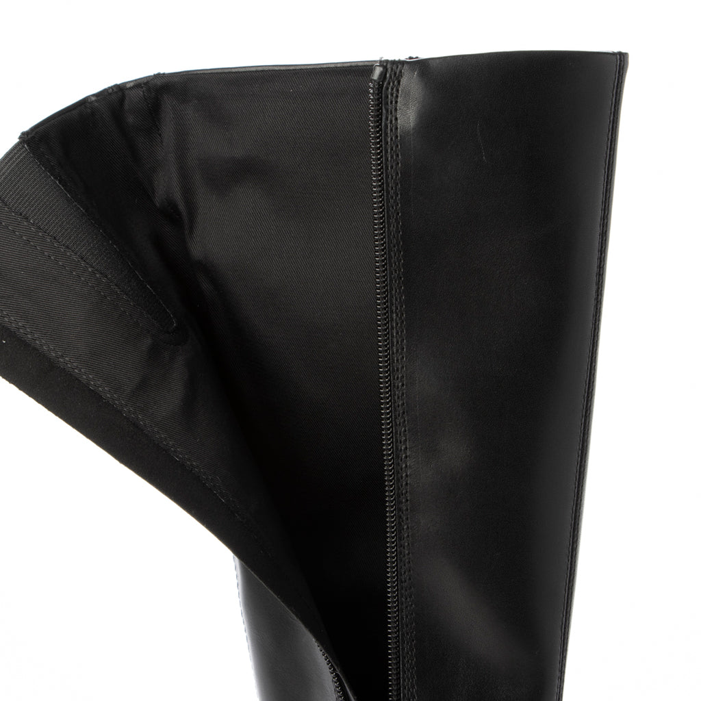 Long boots with a zipper design at the back.