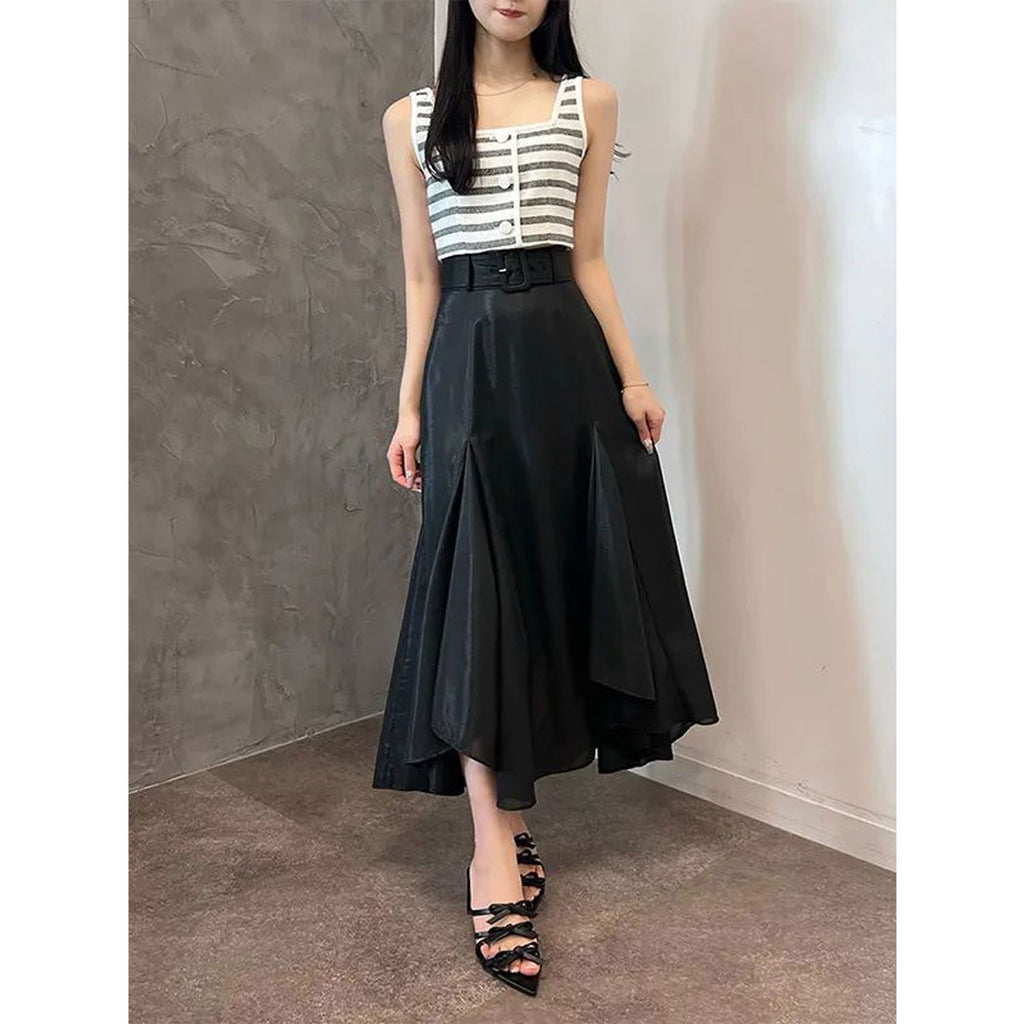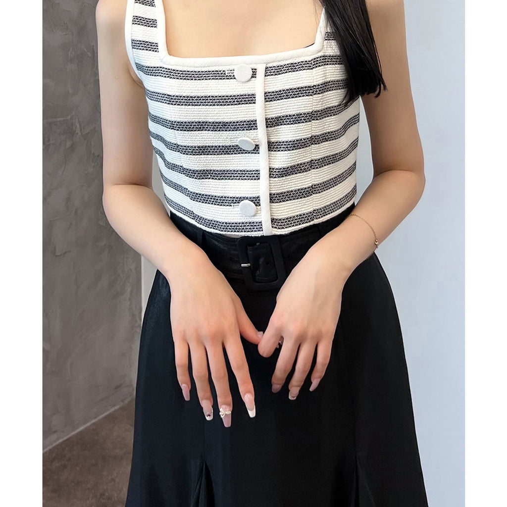 The vest with a minimal length and the high-waisted bottoms are designed with a silhouette that can be styled to enhance your look even with the border pattern.