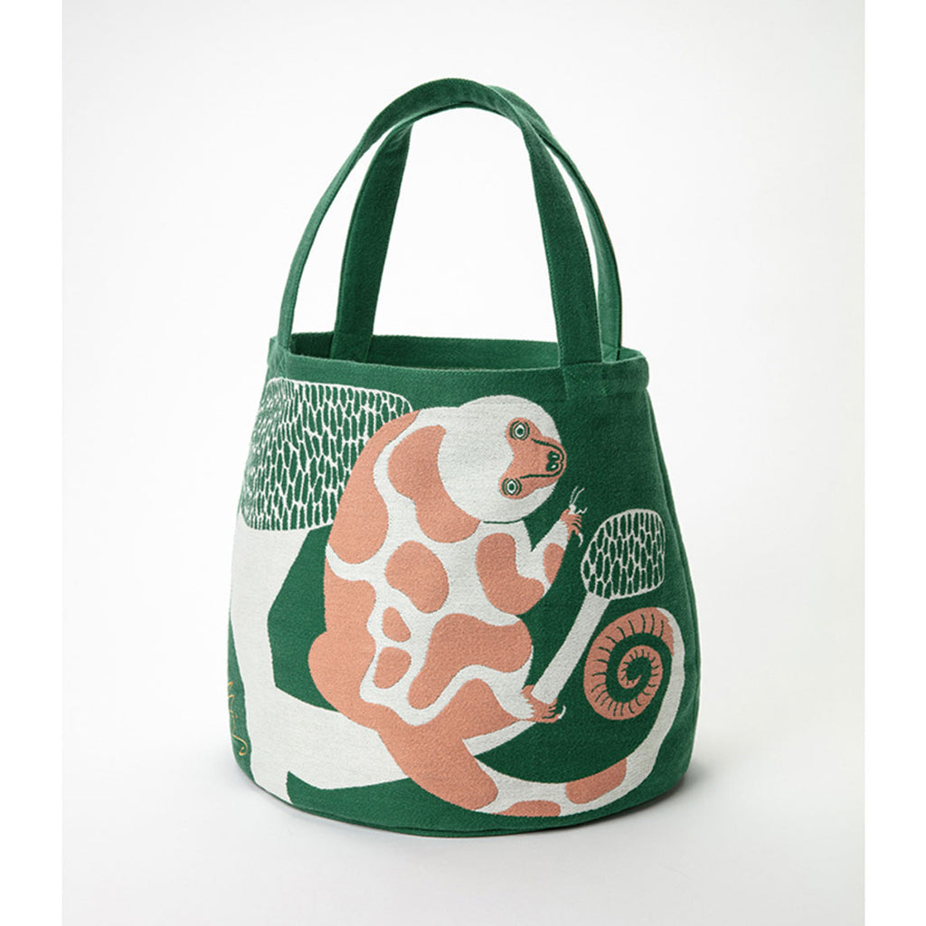 The adorable, rounded shape of the tote bag features a sturdy woven fabric with an elegant colored lining.