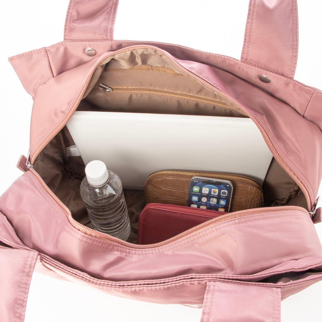 The spacious main storage area, with a width of 44cm and a depth of 20cm, is suitable for travel, which often requires carrying a lot of items such as changes of clothes, towels, and guidebooks, as well as for use as a mother's bag, gym bag, or for commuting to work or school. It can easily accommodate A4 files and magazines.