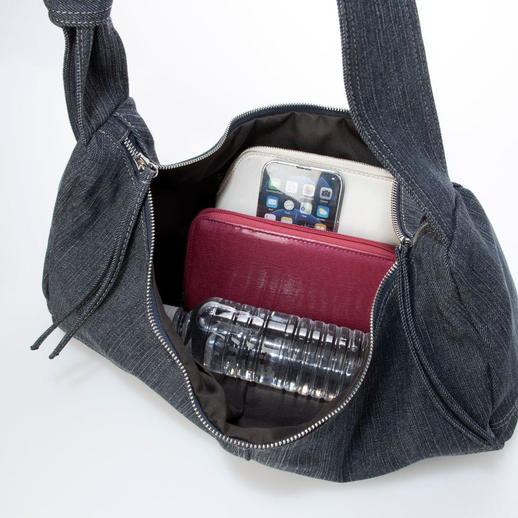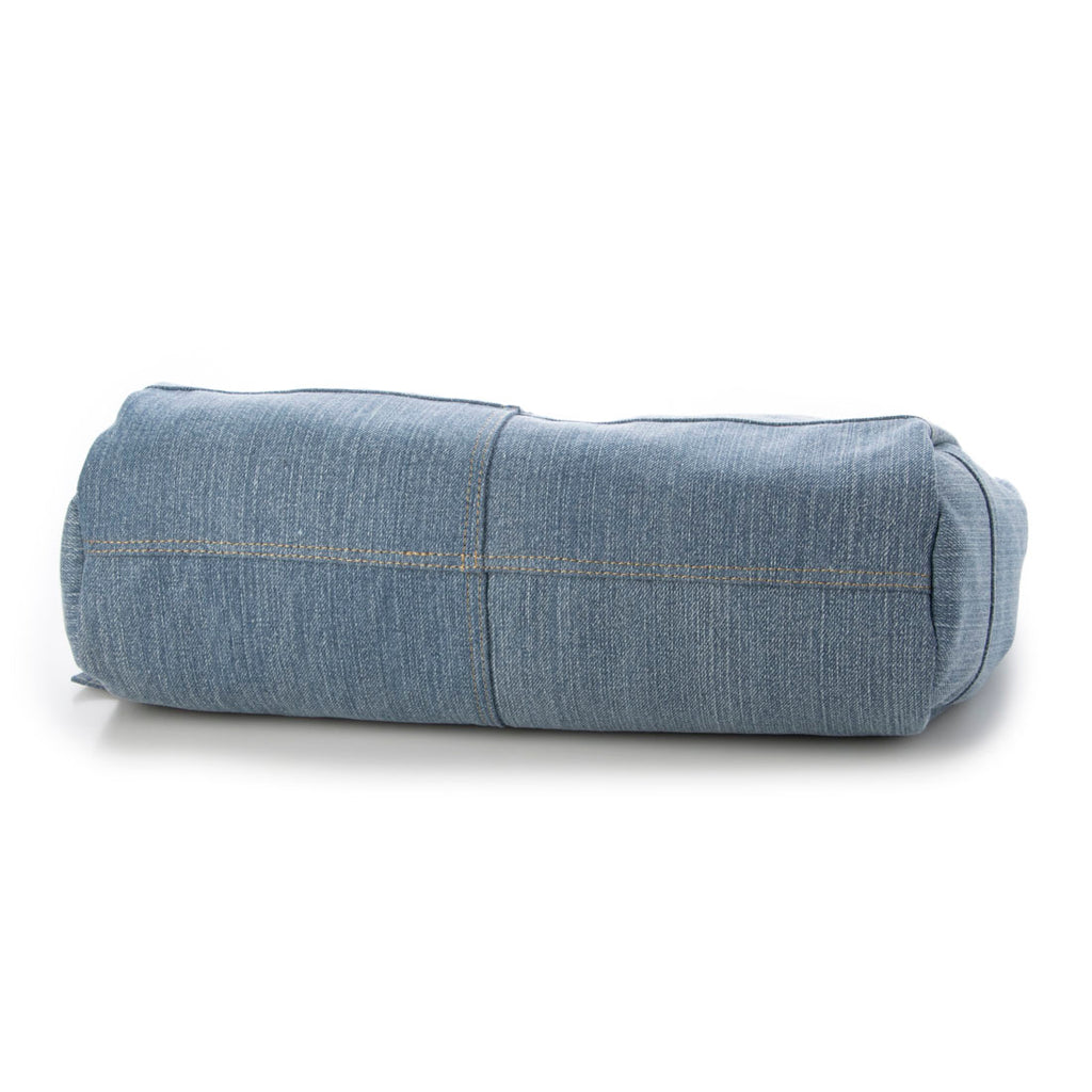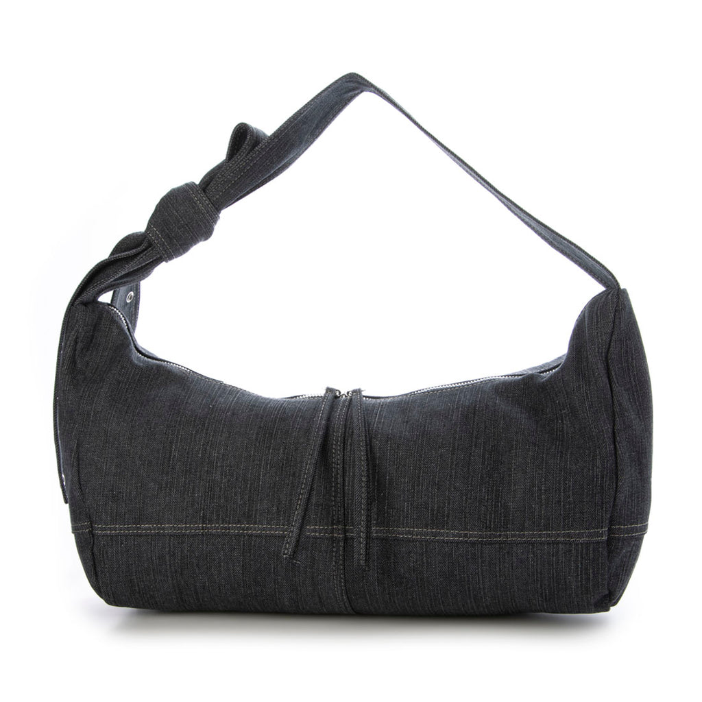 A denim bag with eyelets and a handle tied roughly, inspired by the YK2.