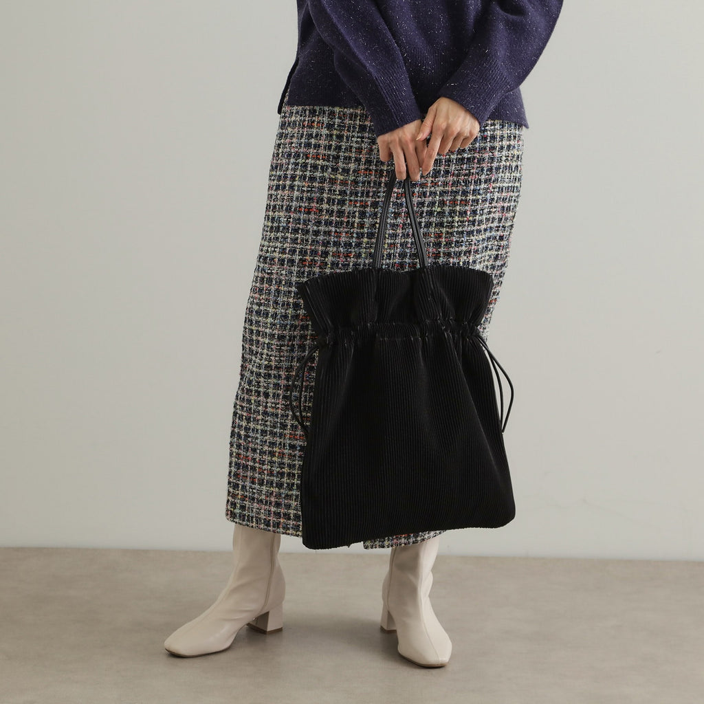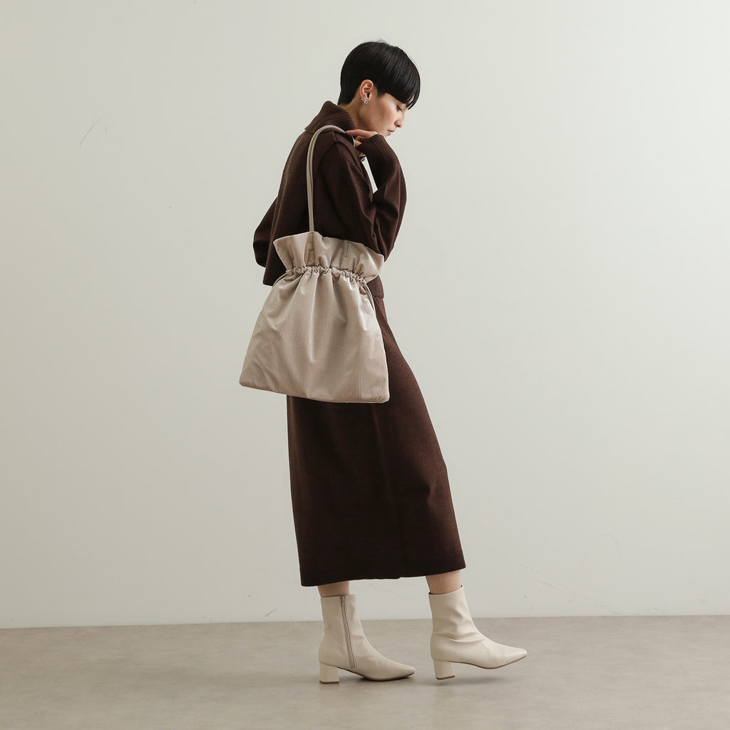 It has a design that allows you to create a drawstring by pulling the cords on both sides, and when you tighten it, it takes on the silhouette of a pouch.