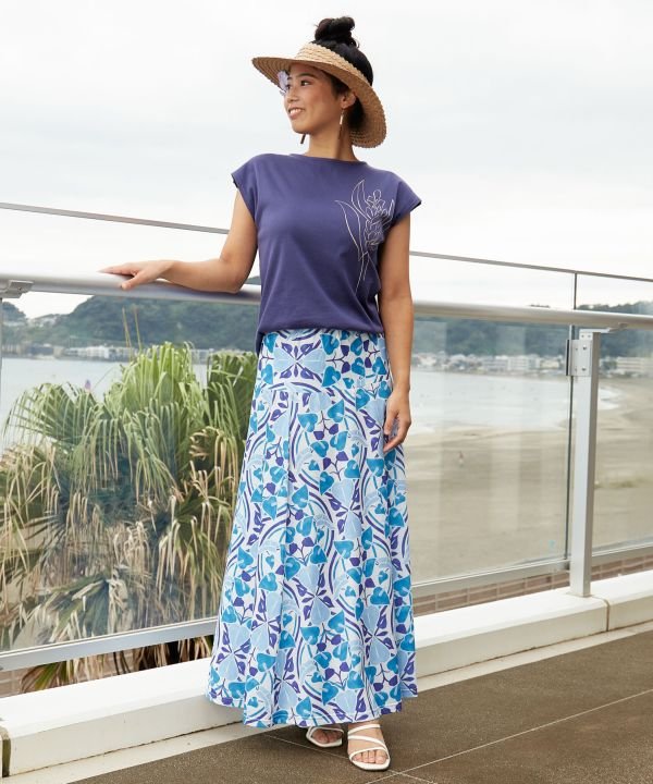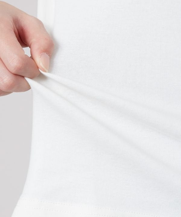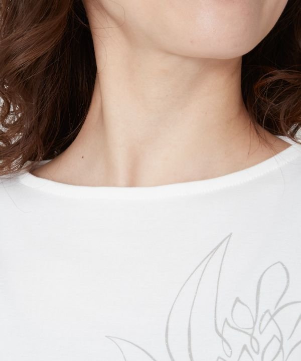 A simple line drawing of ginger gives a new impression to the lesson T-shirt. It also features a feminine sparkle with an aurora-style glitter print. The French sleeves make the shoulders and upper arms look delicate, creating an elegant impression. The semi-boat neck enhances the feminine décolletage. Made from stretchy material.