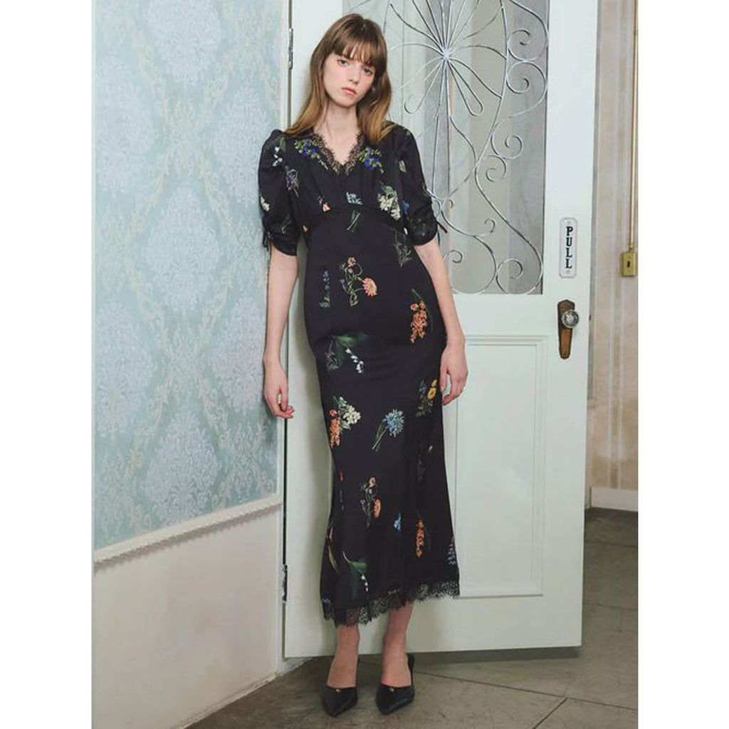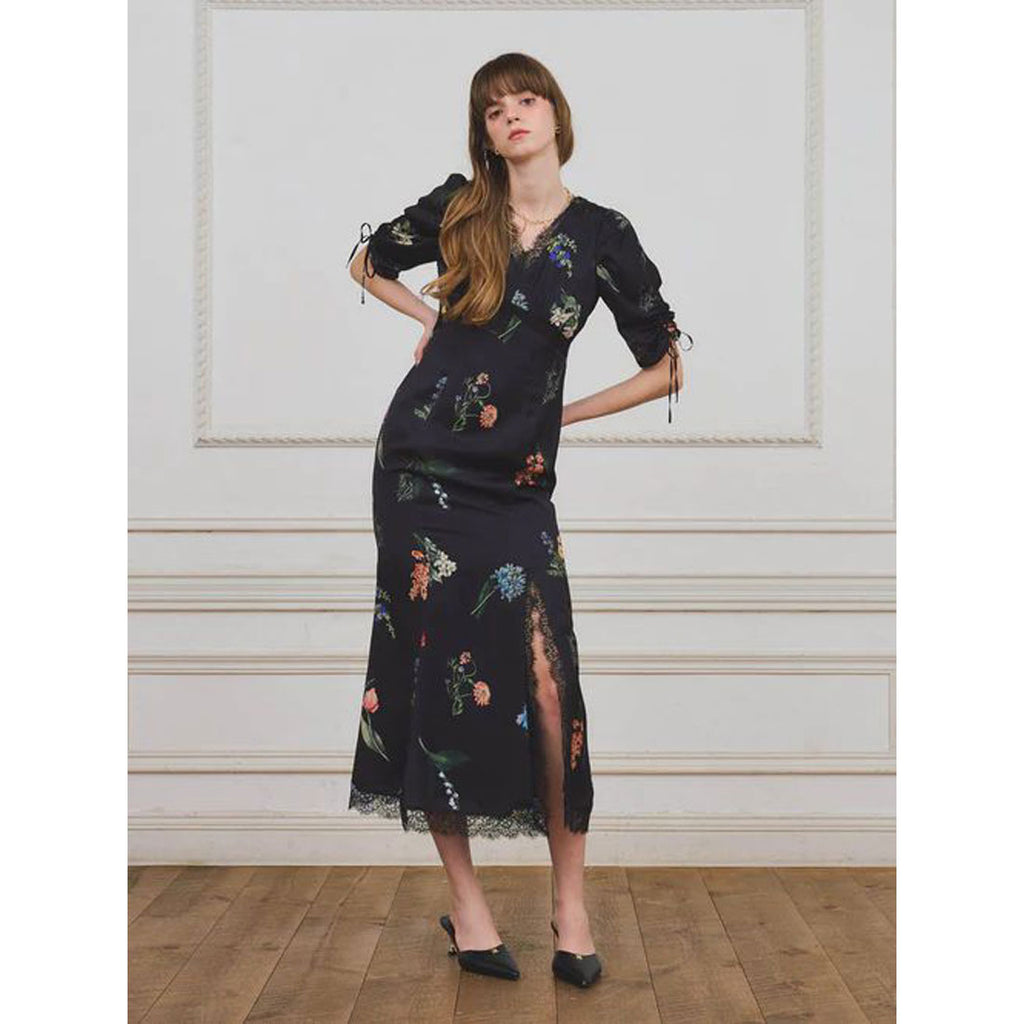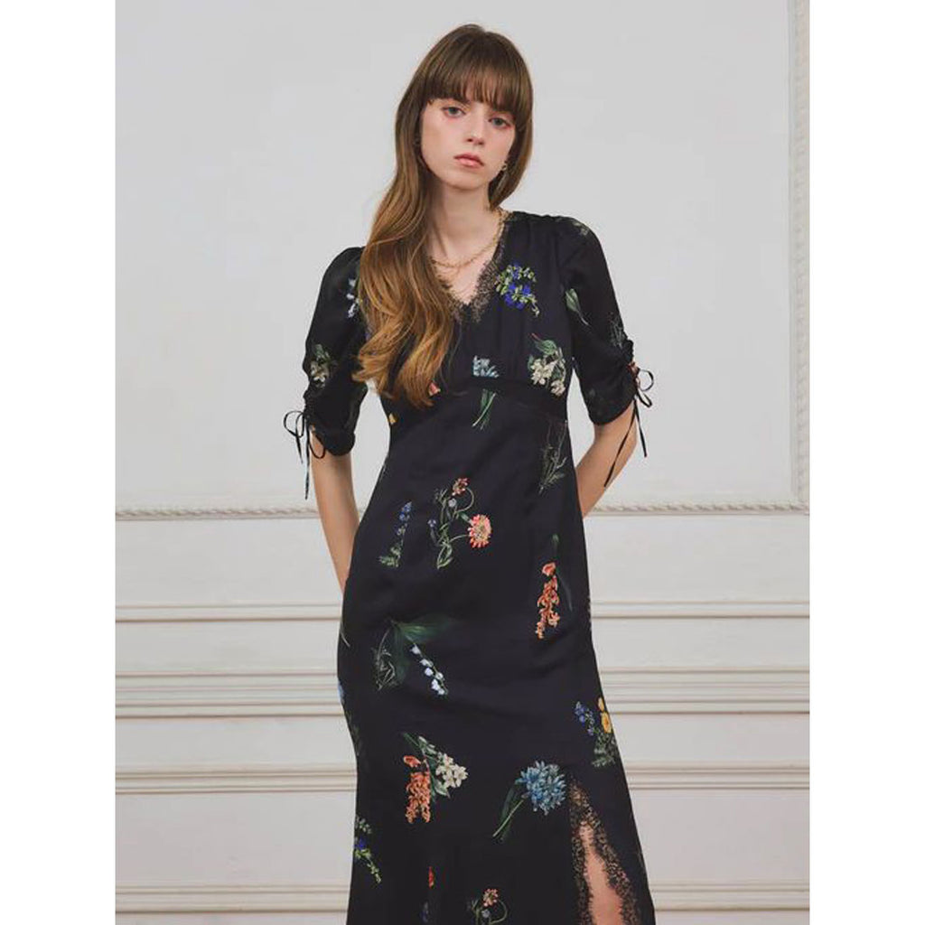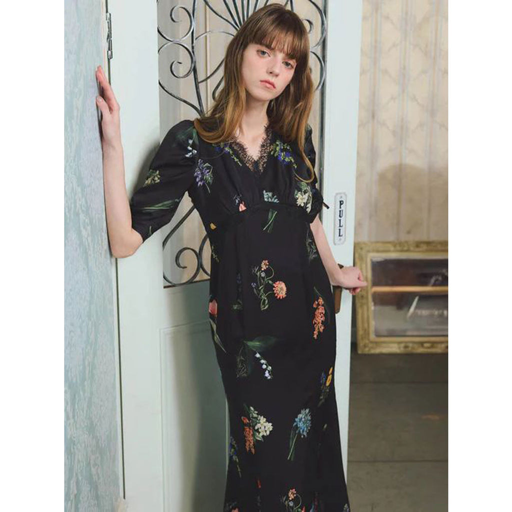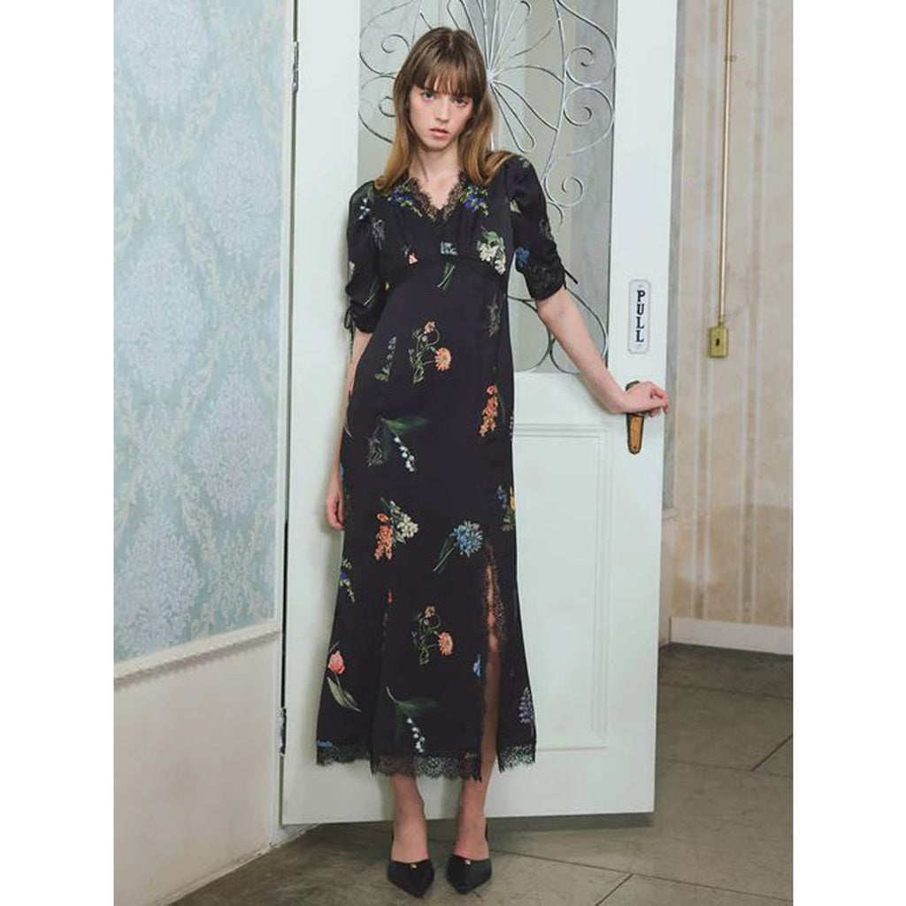 A flower print dress that embodies quiet elegance.