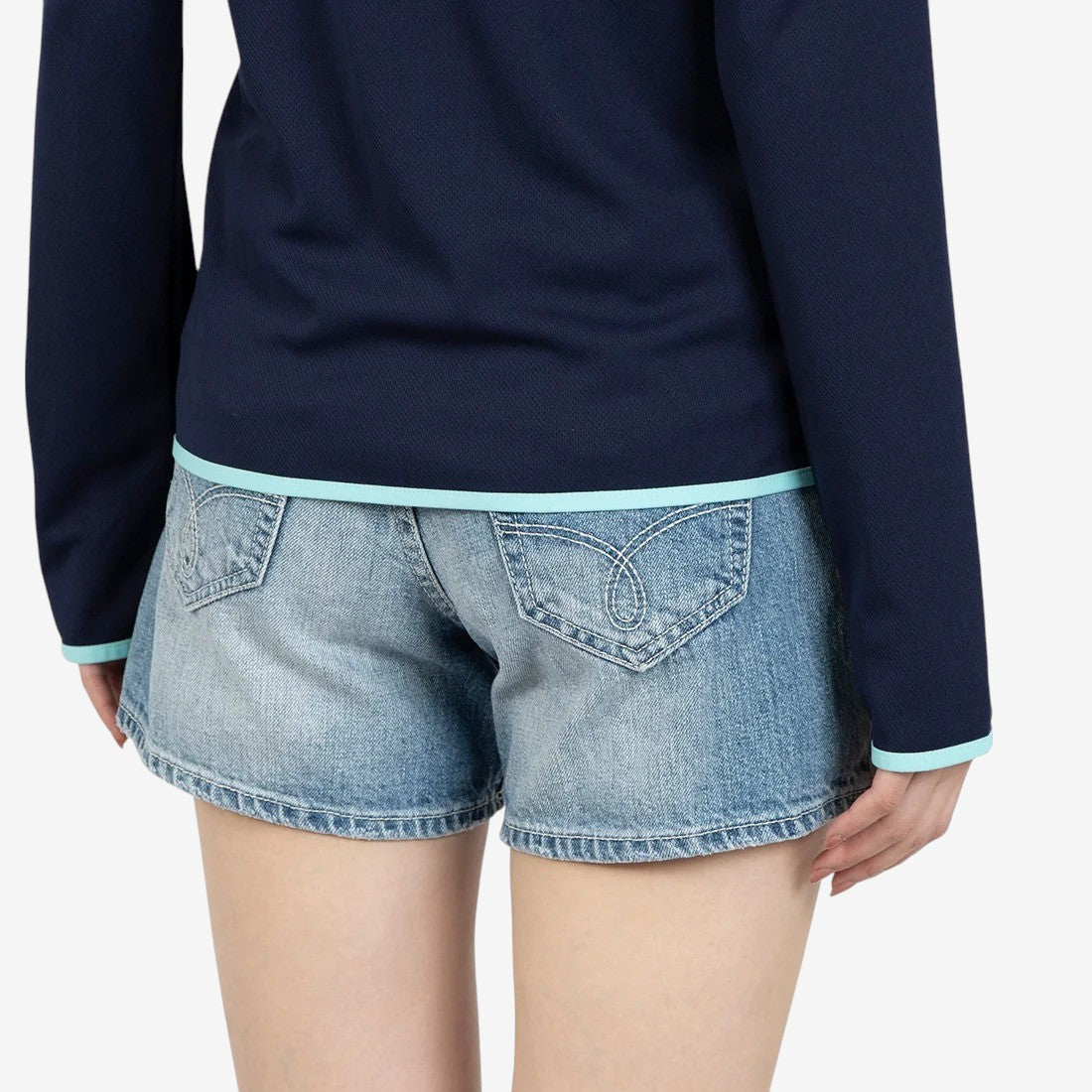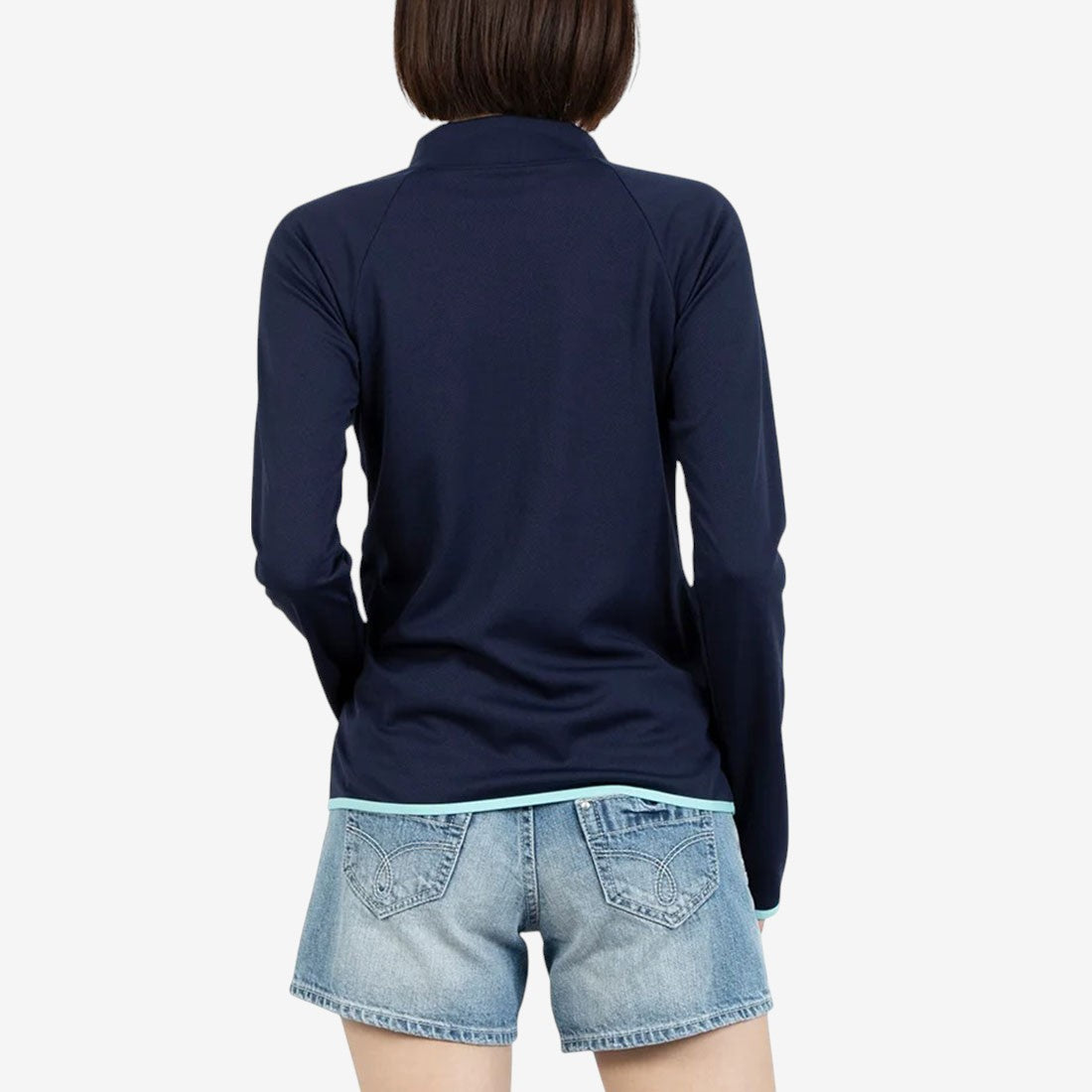 A rash guard featuring a one-point logo, suitable for both land and water.