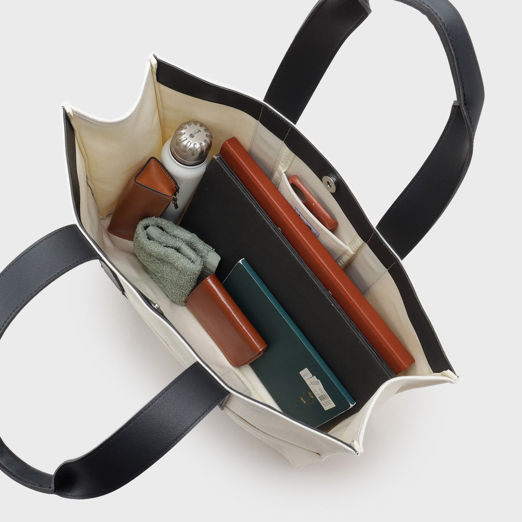 The slightly thicker handle uses synthetic leather that stands out against the canvas material, adding a subtle accent.