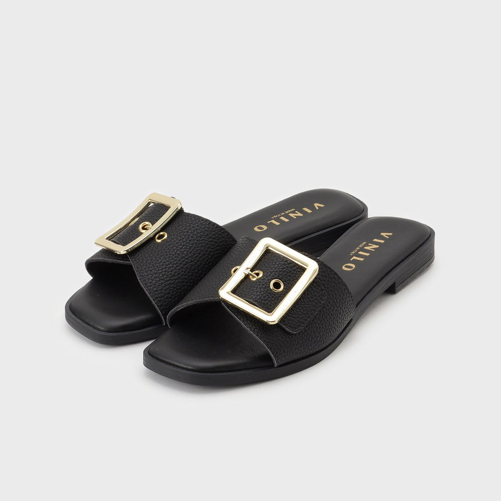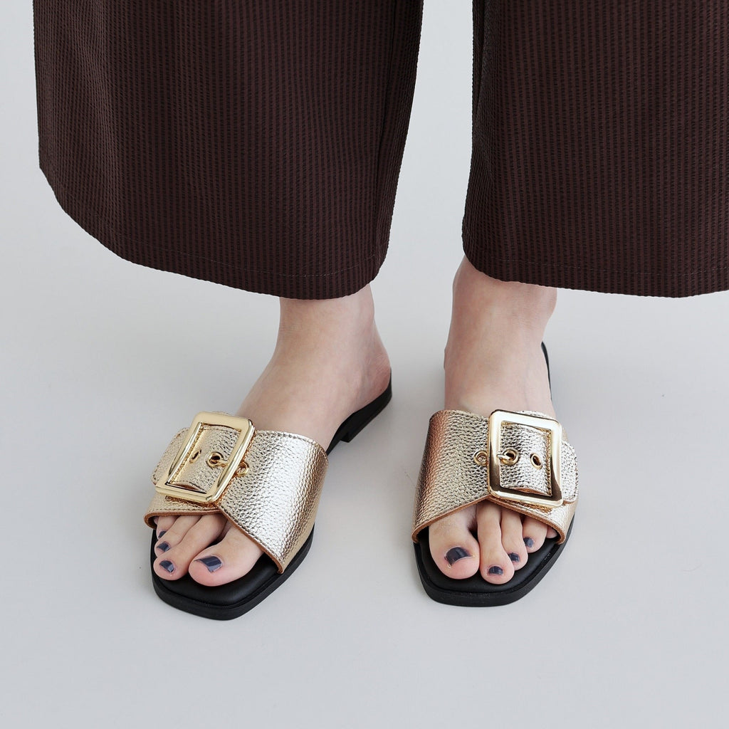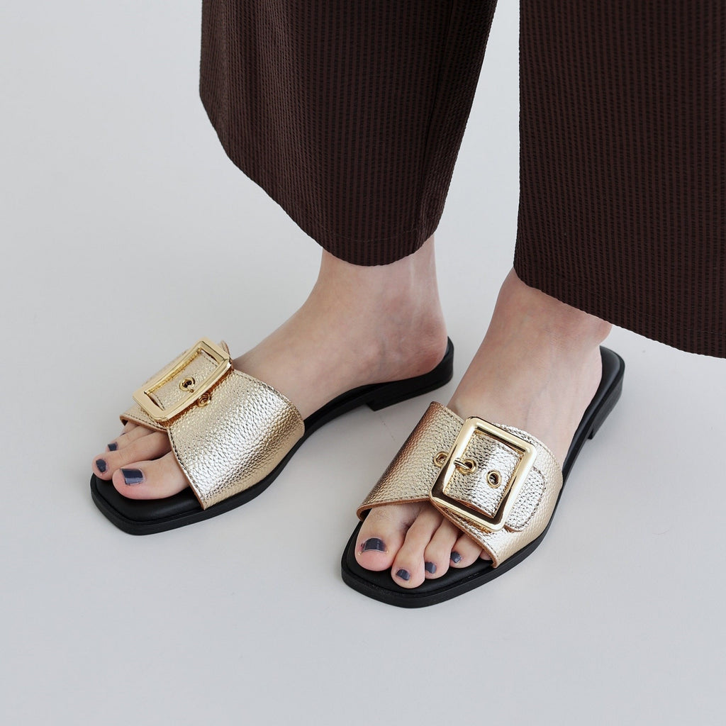 Flat sandals with a large buckle belt as a key feature.