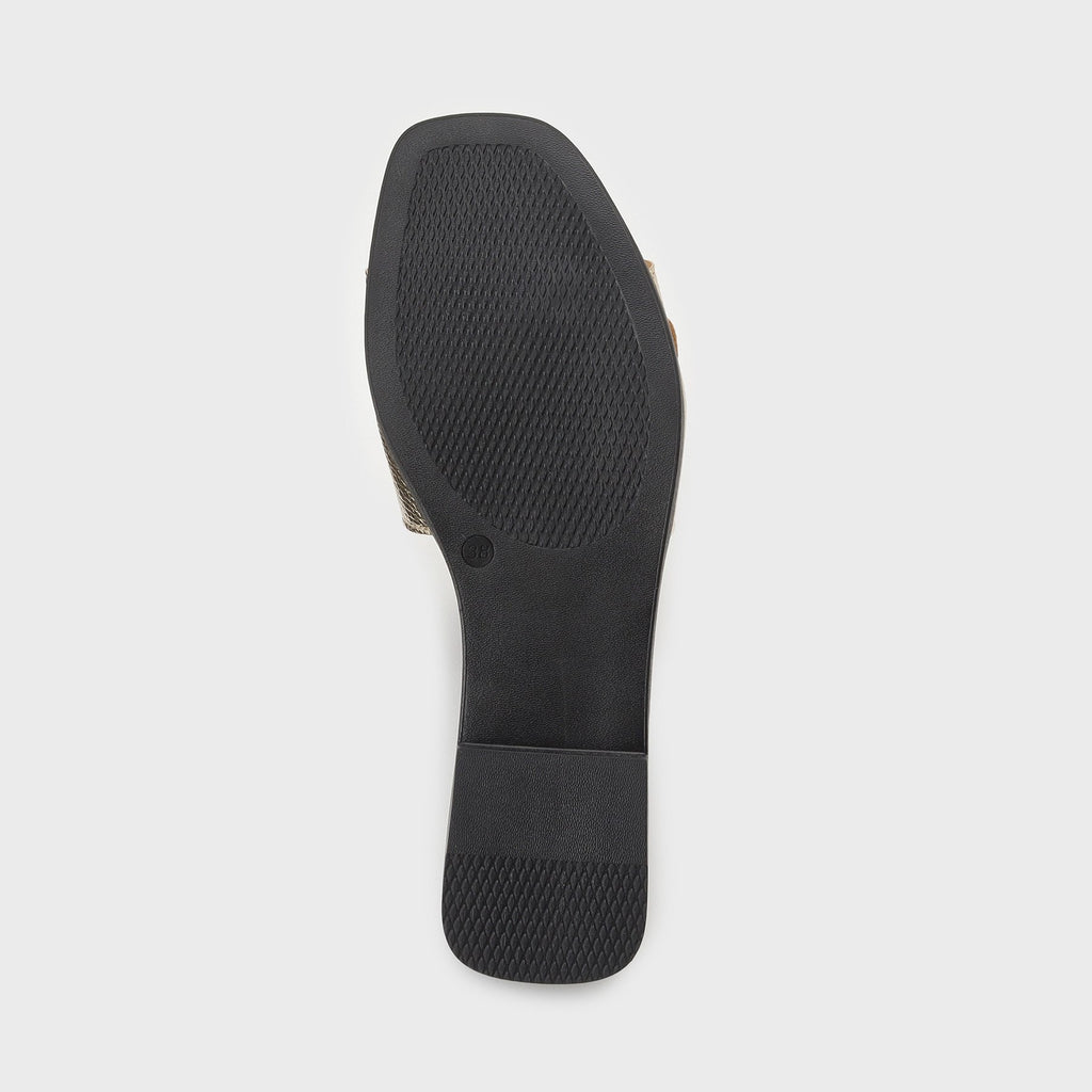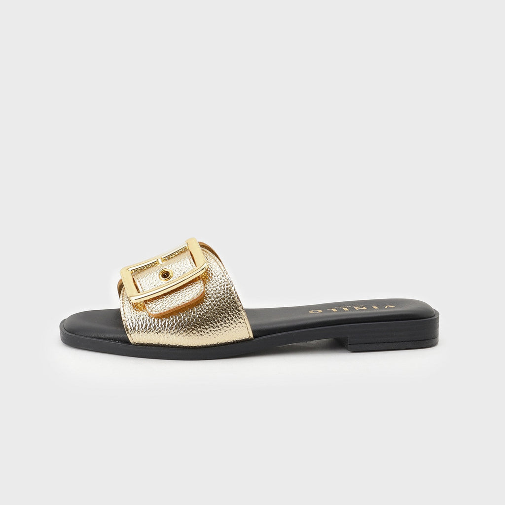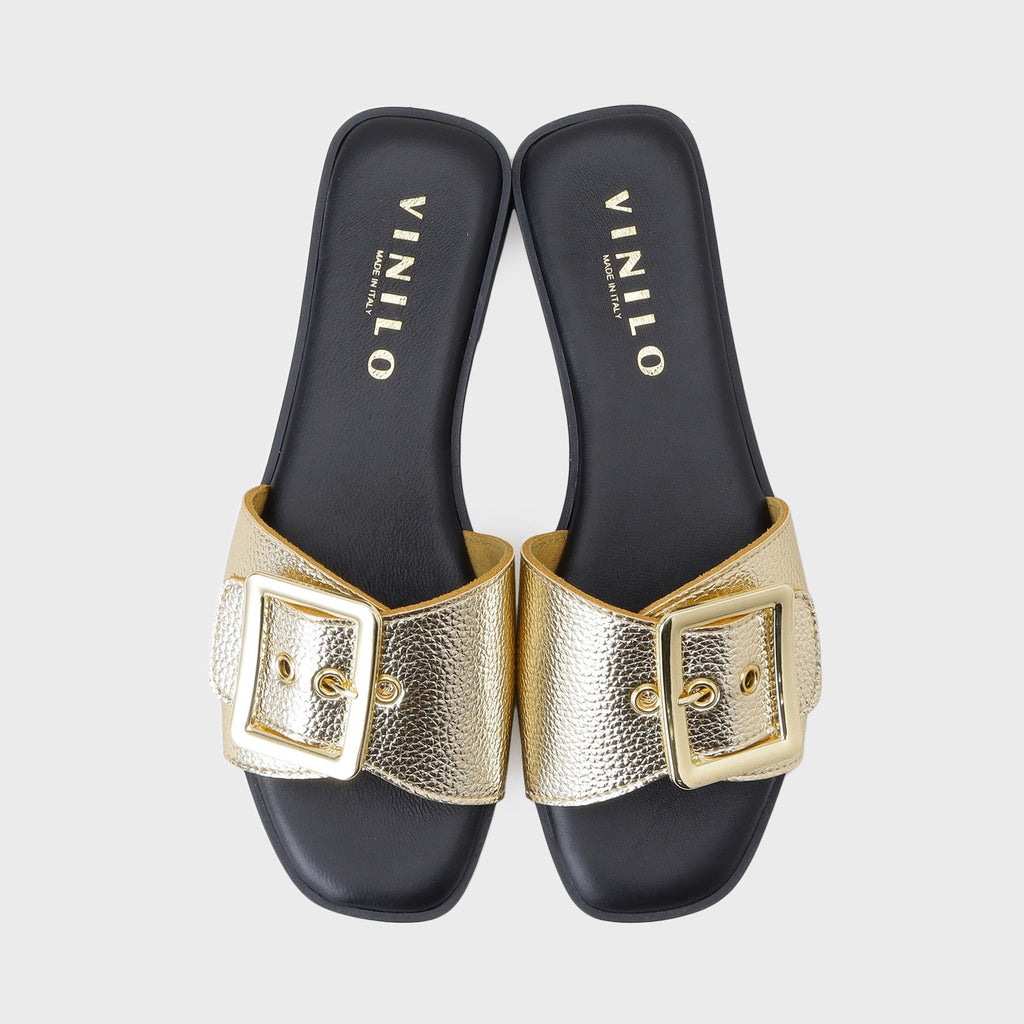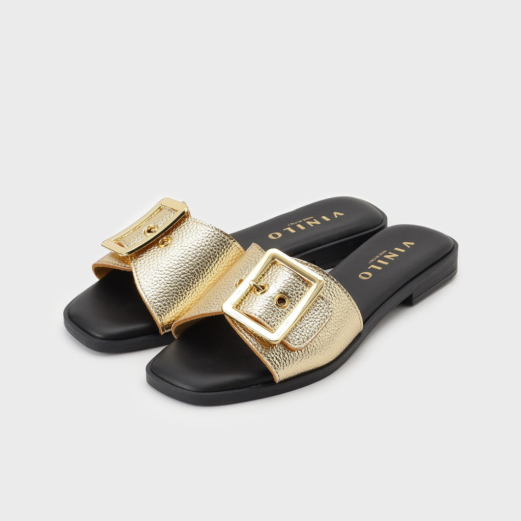 Flat sandals with a large buckle belt as a key feature.