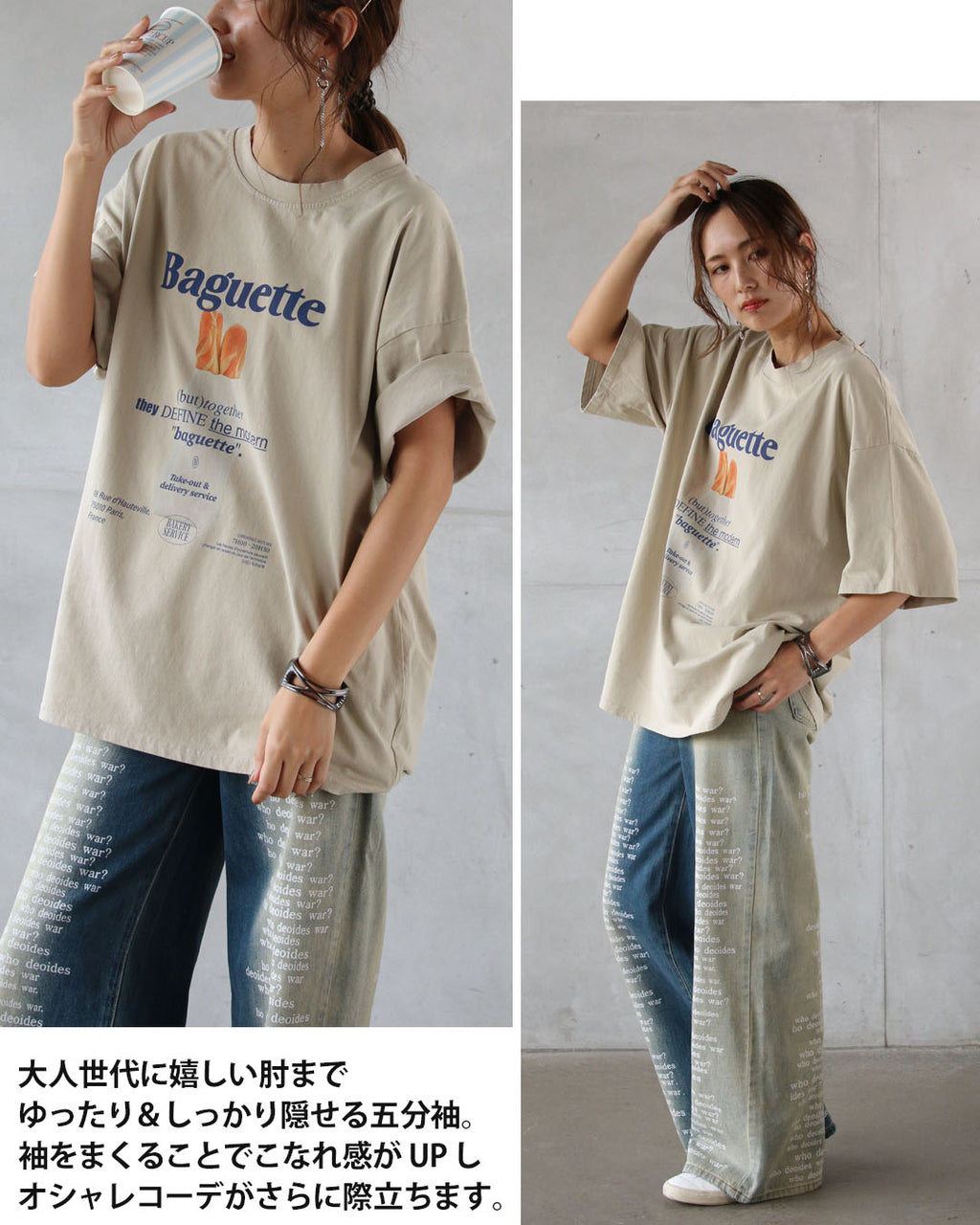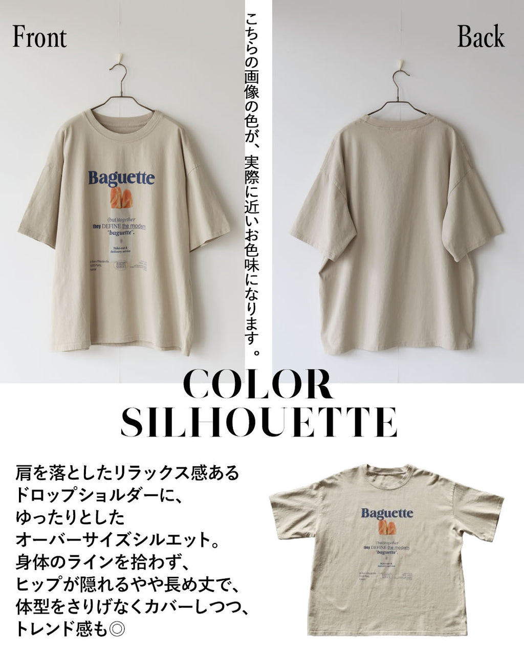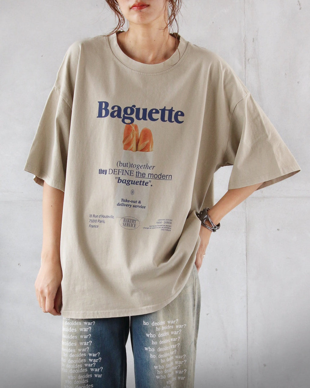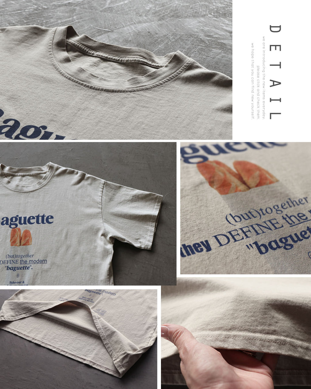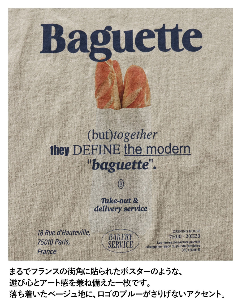 A graphic T-shirt featuring a boldly drawn "baguette" and logo that catches the eye.