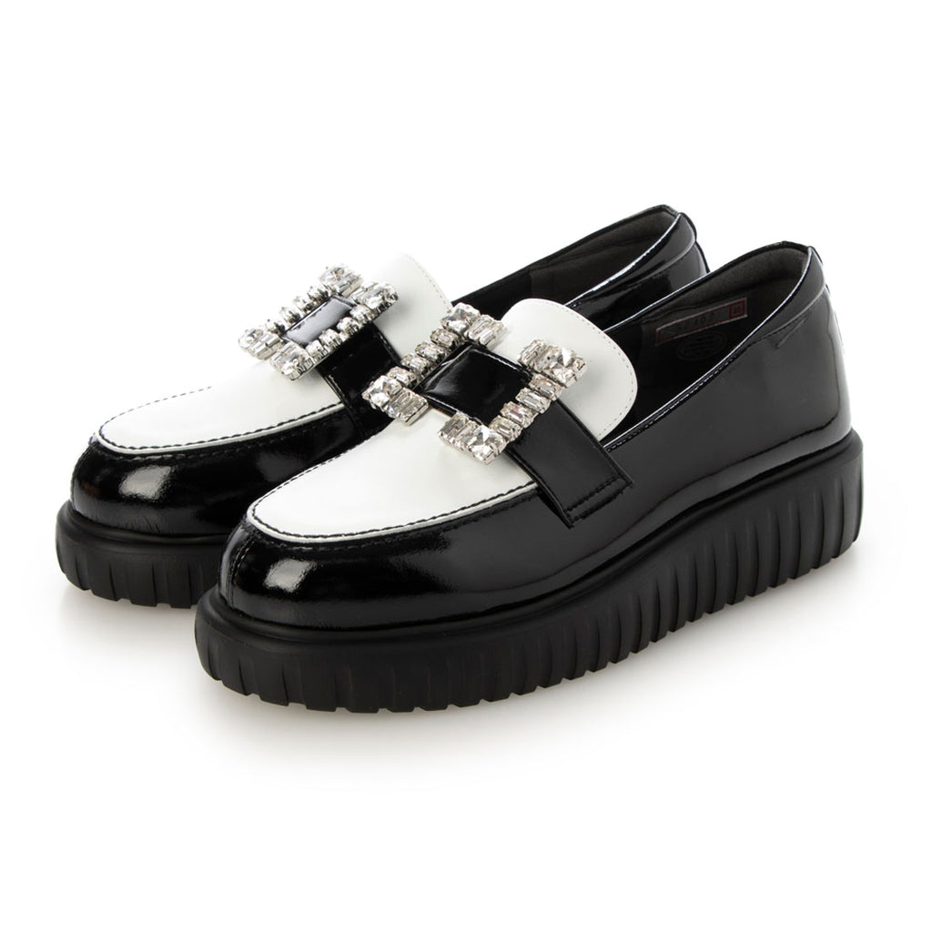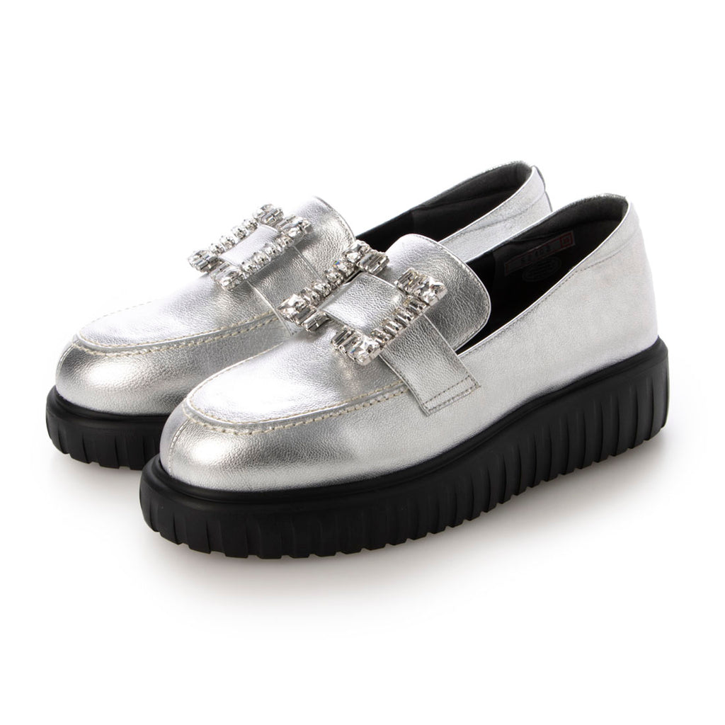 The loafers with enamel and foil processing are adorned with large square jewels that sparkle coolly.