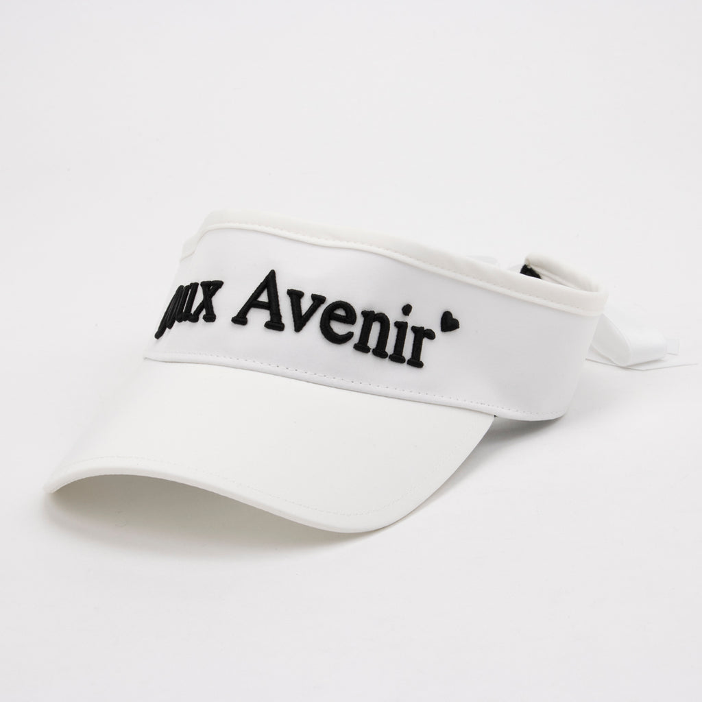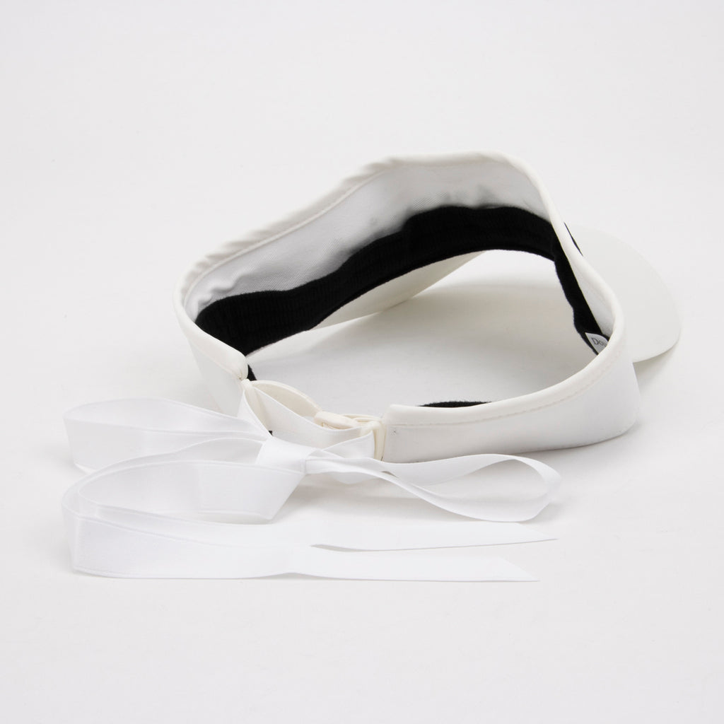 A visor with a simple form, featuring a prominent embroidered logo and ribbon that adds a feminine touch.