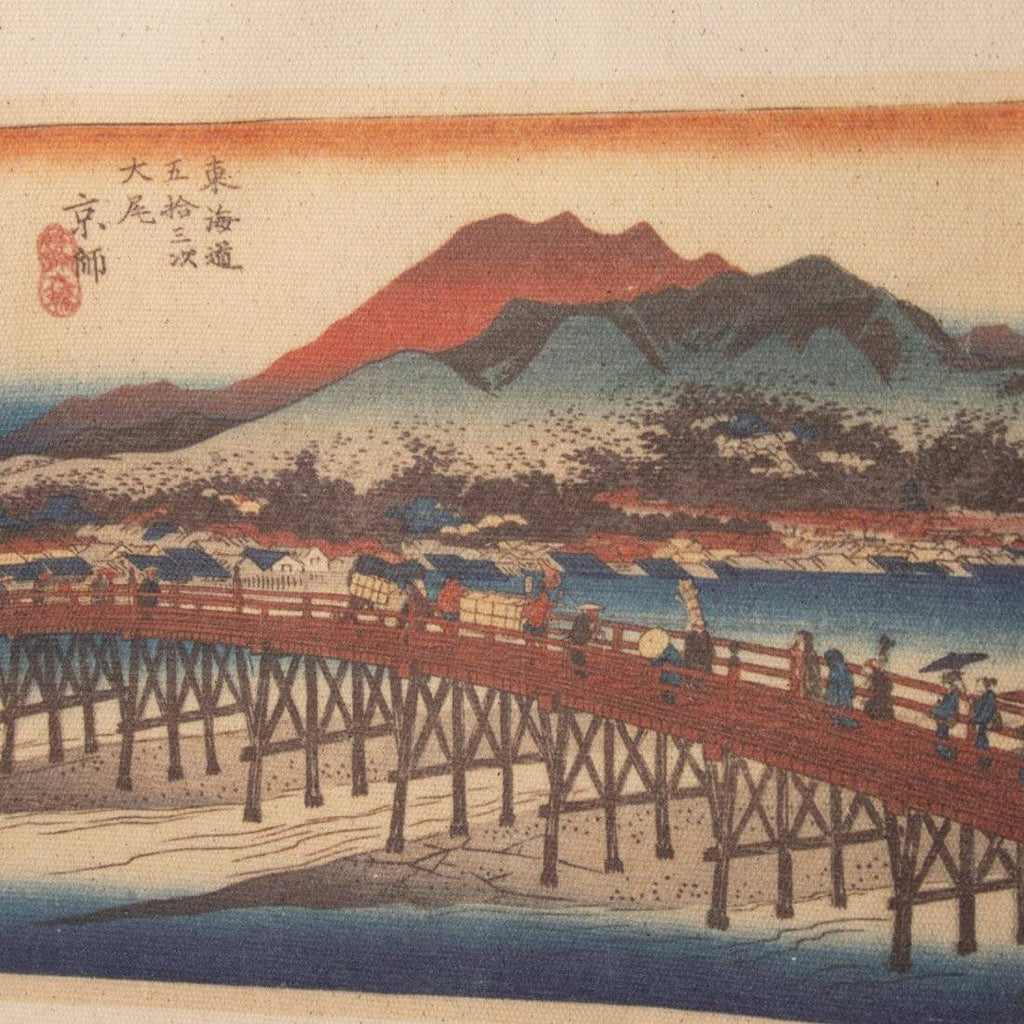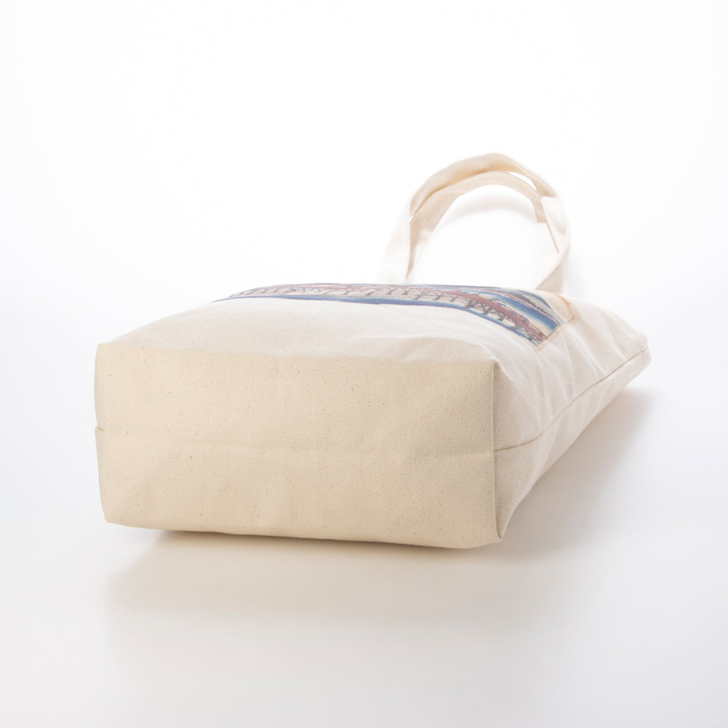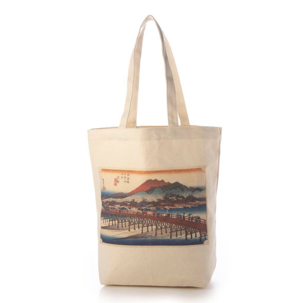 A striking tote bag printed with a Japanese design centered around ukiyo-e patterns across the entire bag.