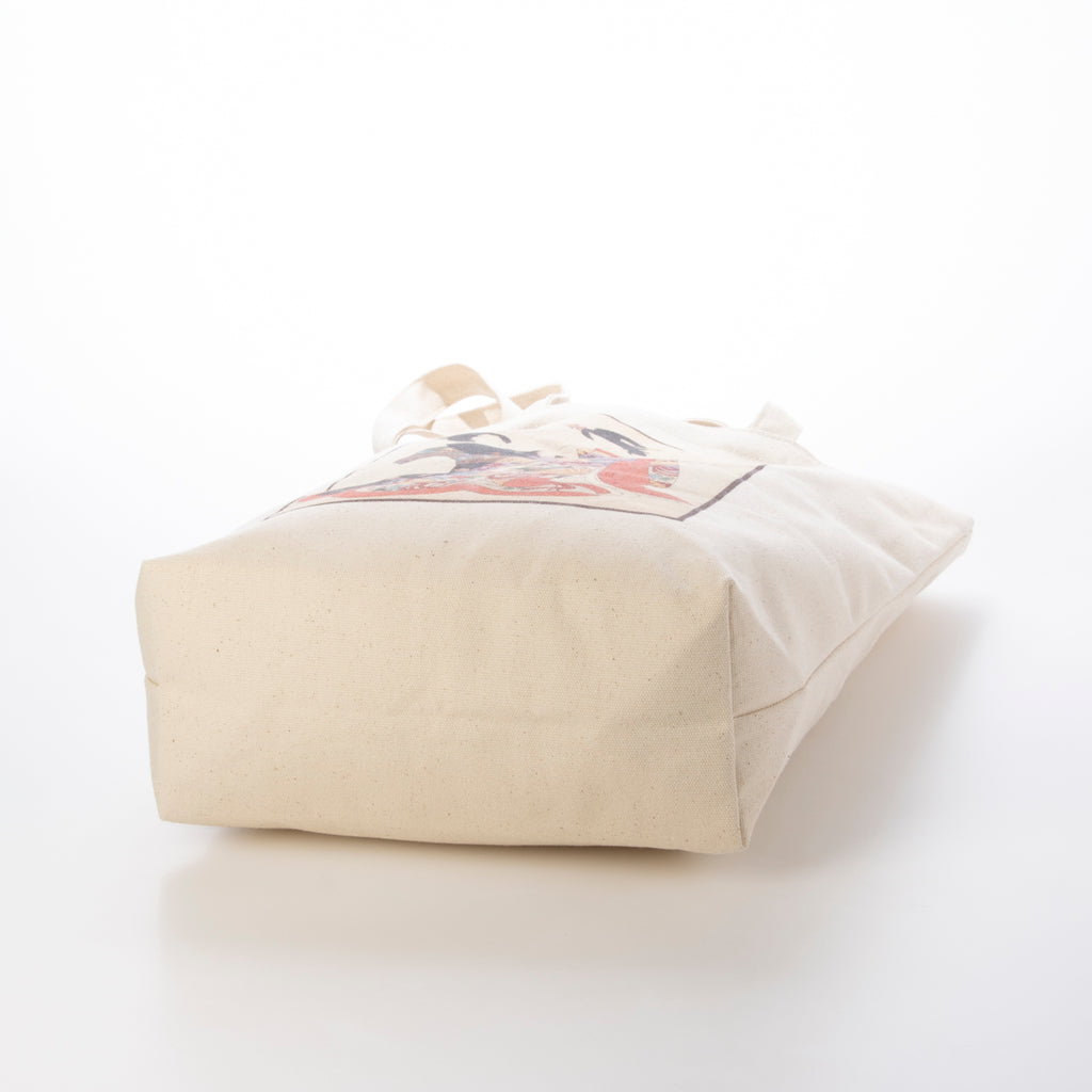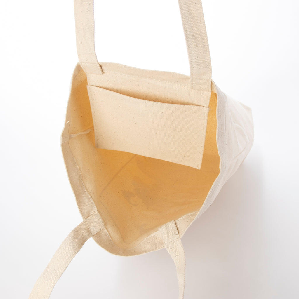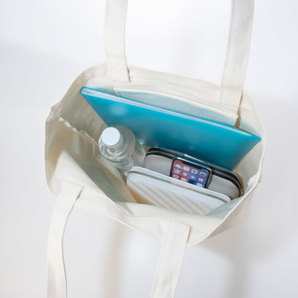 The tote bag made of durable canvas is a convenient size that can fit A4 files.