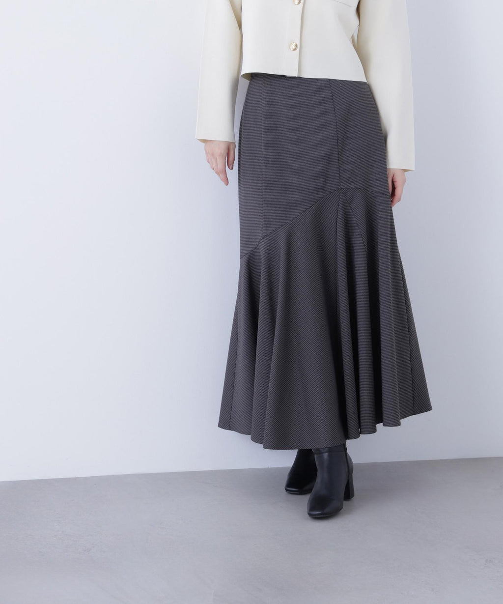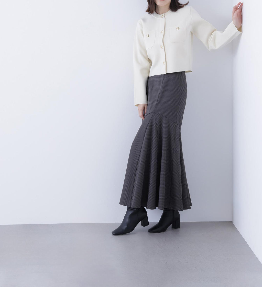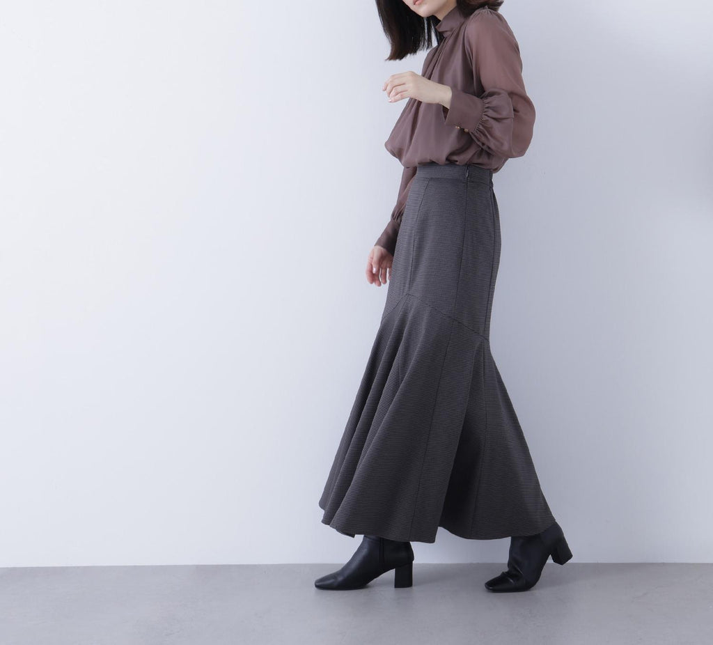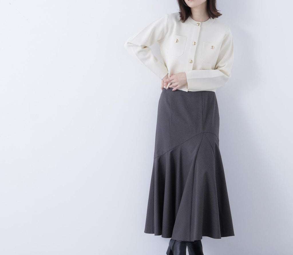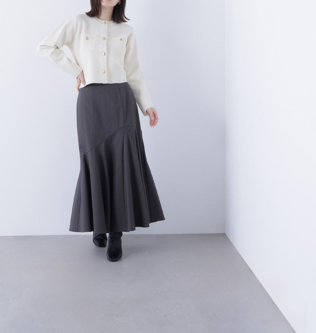 An asymmetrical switching design is the point of the mermaid skirt. By adding a gusset flare toward the hem, it creates a swaying and voluminous impression at the hem, making it glamorous. The back waist is elasticized for a stress-free fit. The small houndstooth check pattern is mature and can be worn with a feminine mood.