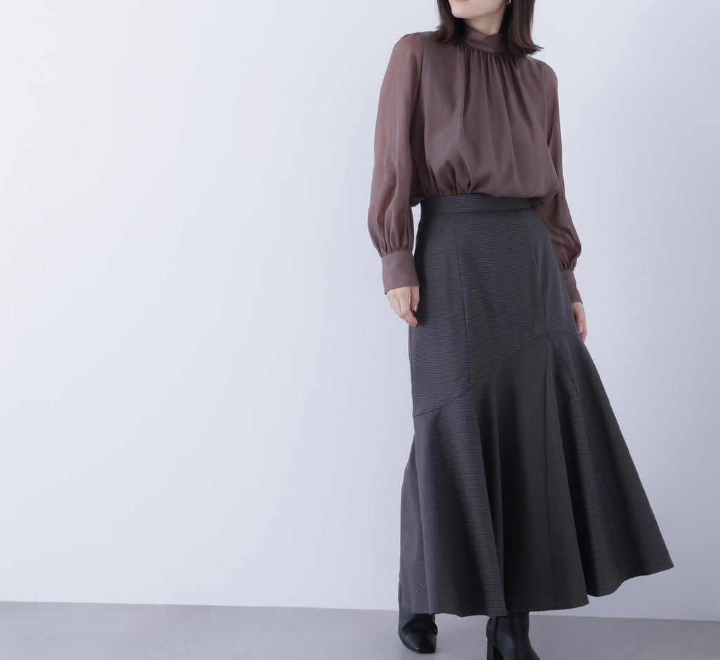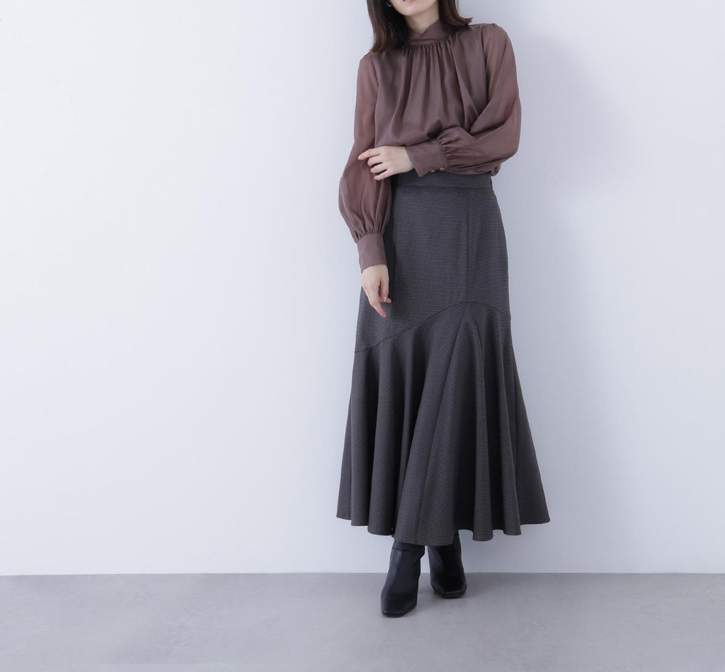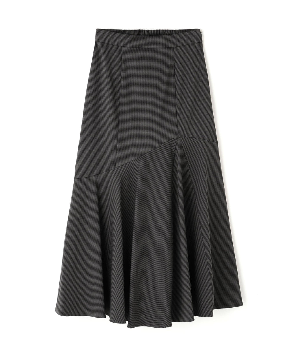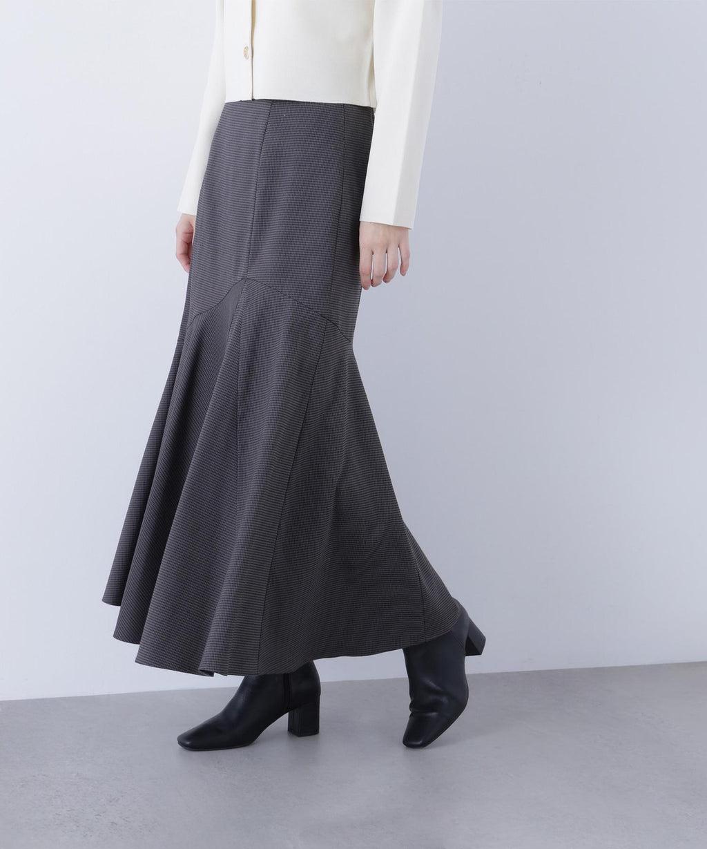 An asymmetrical switching design is the point of the mermaid skirt. By adding a gusset flare toward the hem, it creates a swaying and voluminous impression at the hem, making it glamorous. The back waist is elasticized for a stress-free fit. The small houndstooth check pattern is mature and can be worn with a feminine mood.