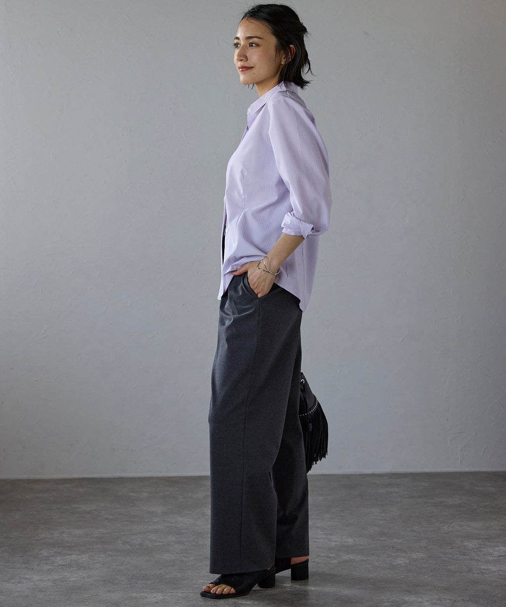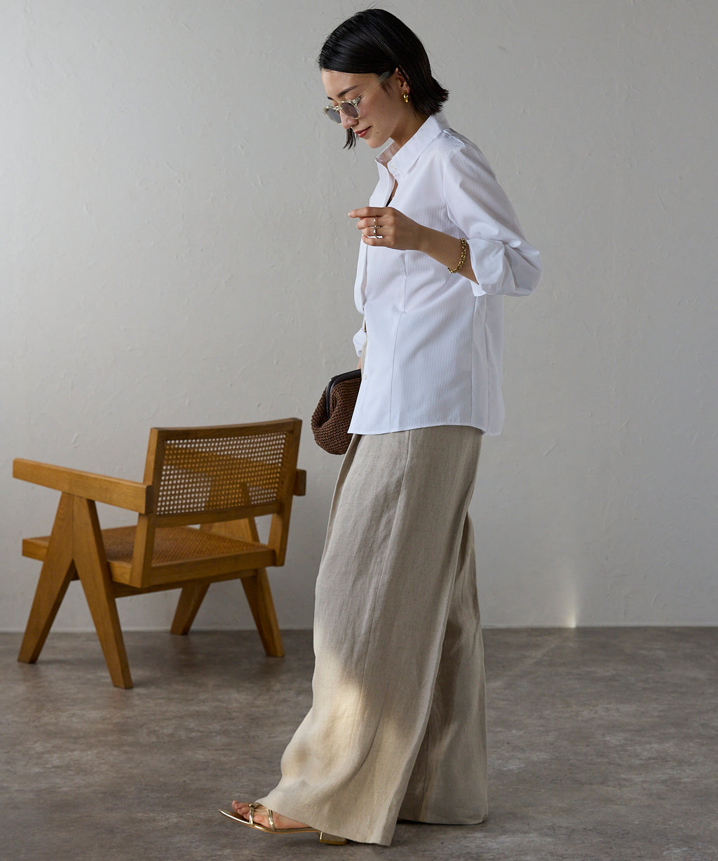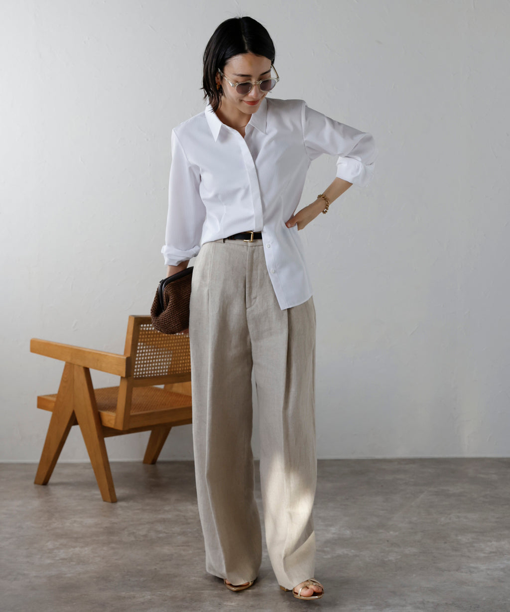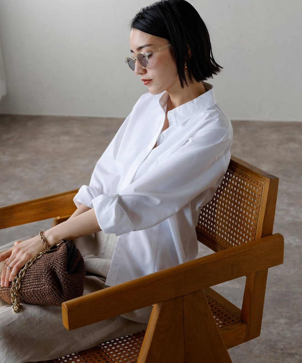 We recommend wearing it in an outstyle. It creates a well-balanced overall look compared to tucking it in. Choose slightly wide pants for a relaxed feel.