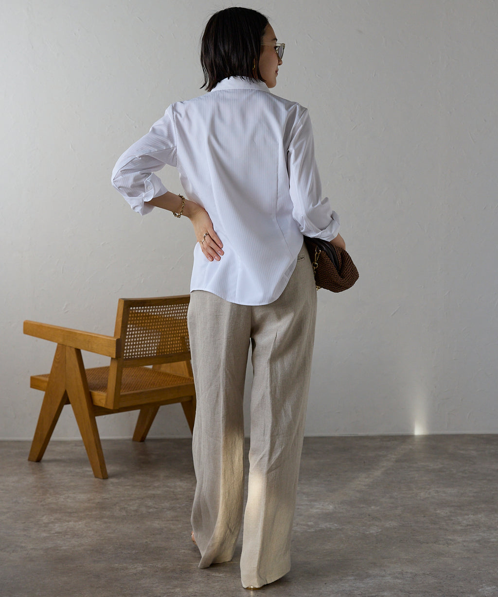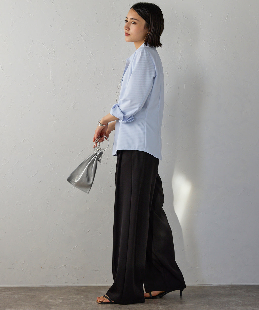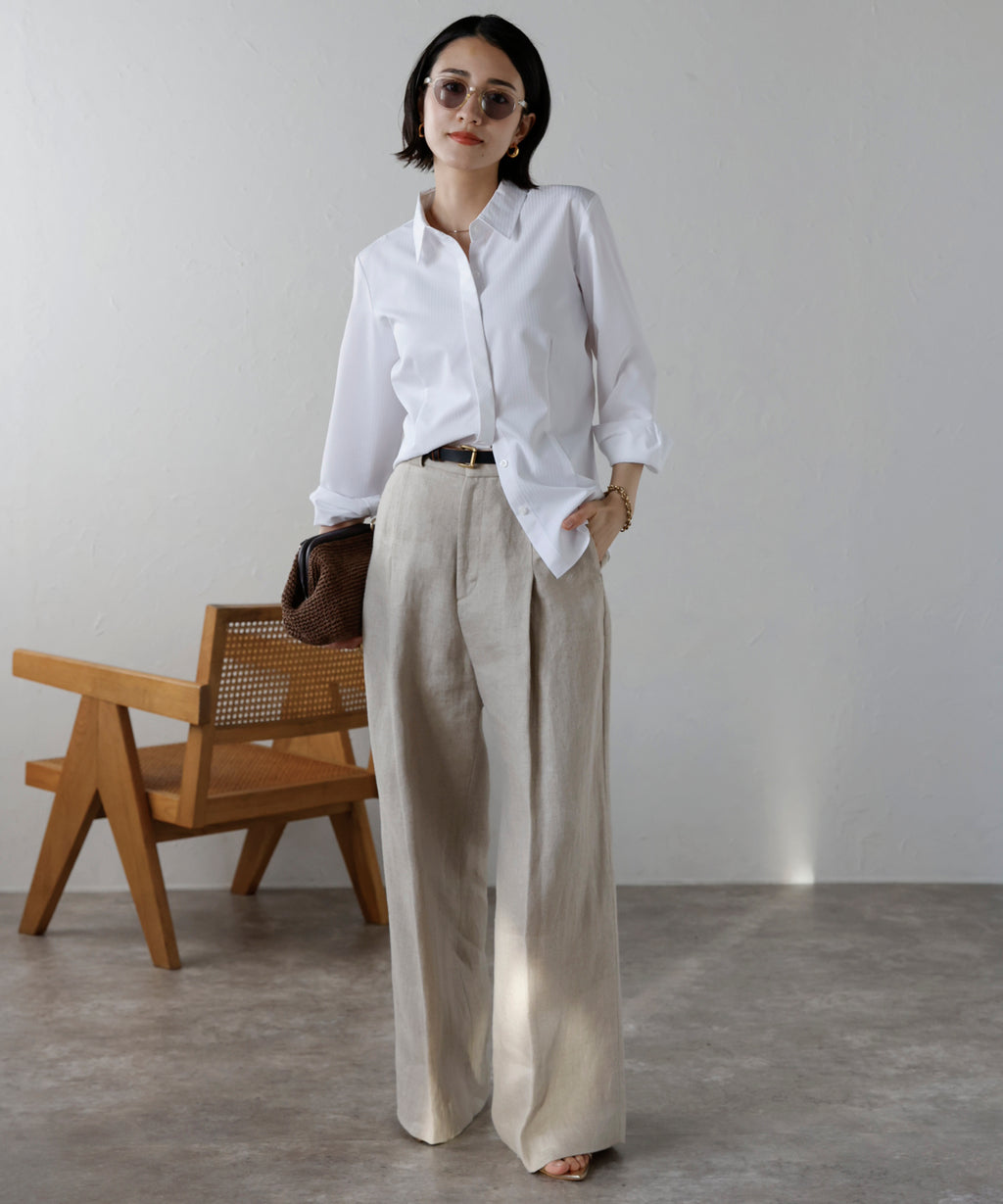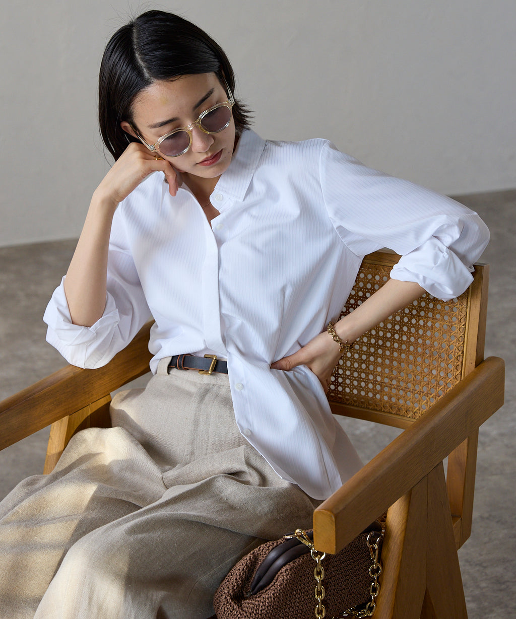 We recommend wearing it in an outstyle. It creates a well-balanced overall look compared to tucking it in. Choose slightly wide pants for a relaxed feel.