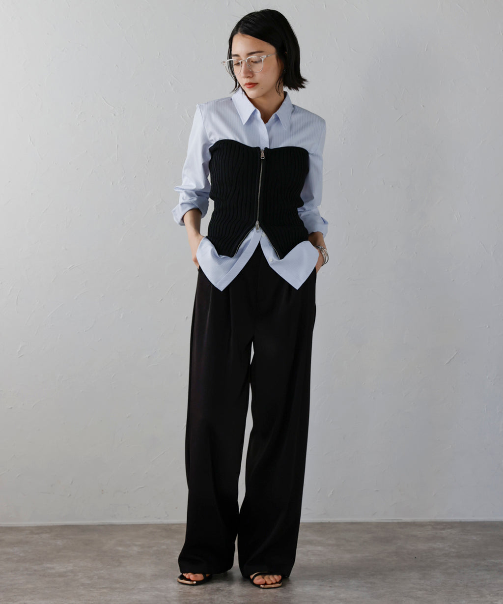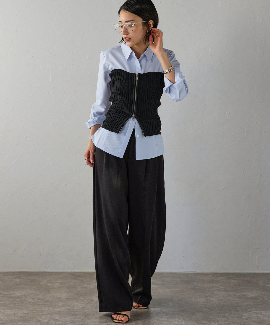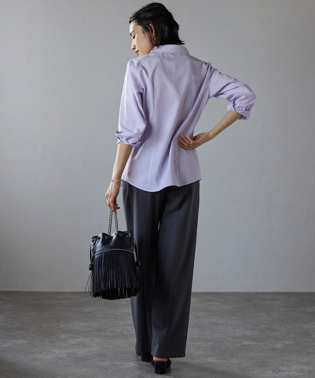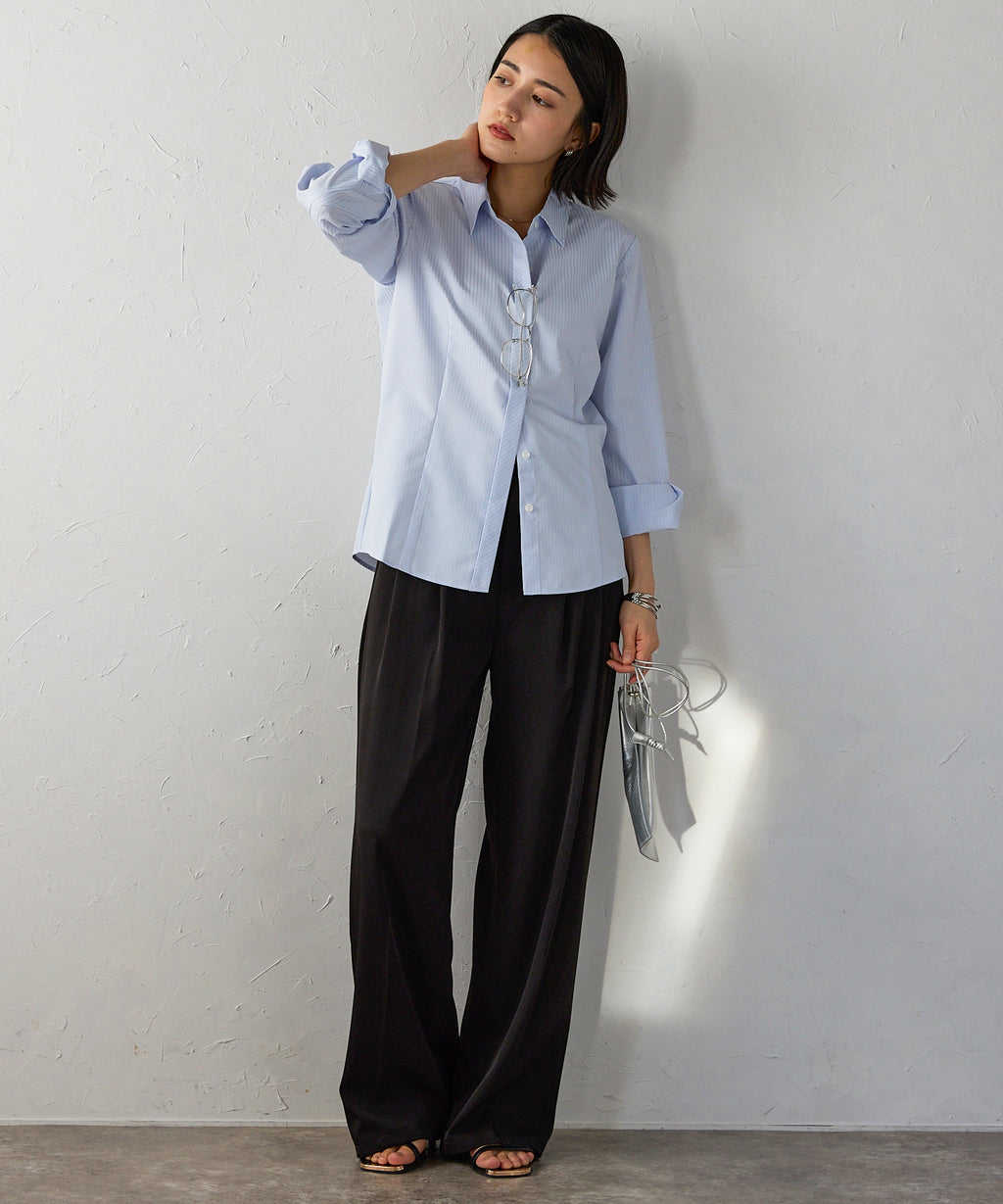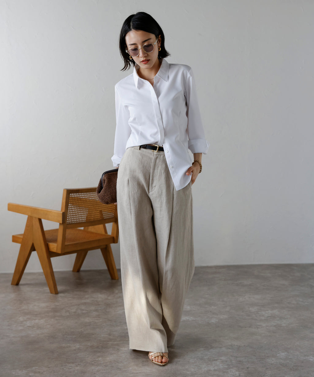 We recommend wearing it in an outstyle. It creates a well-balanced overall look compared to tucking it in. Choose slightly wide pants for a relaxed feel.
