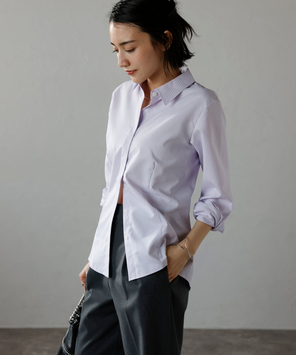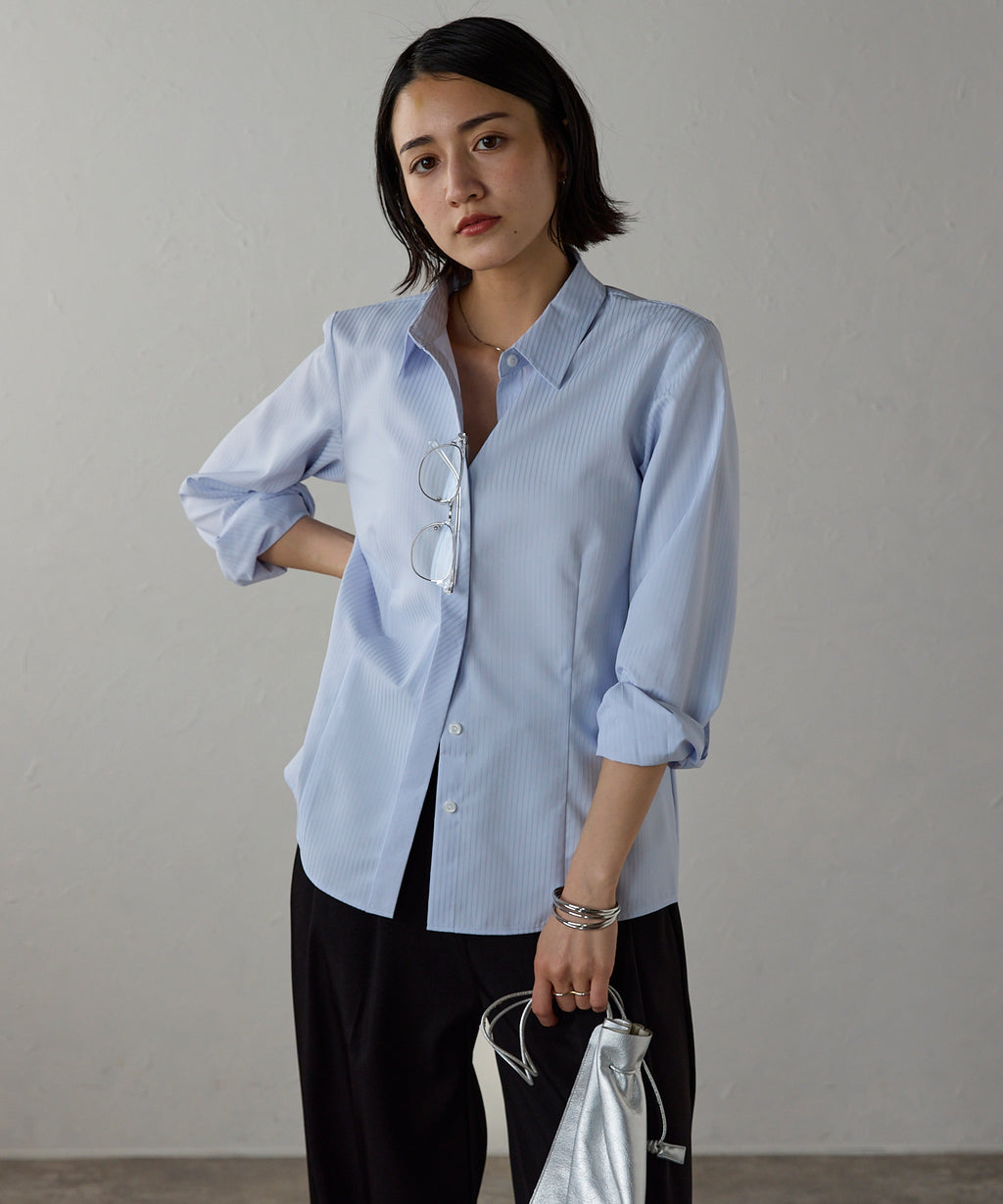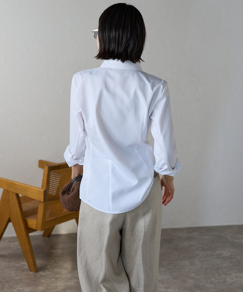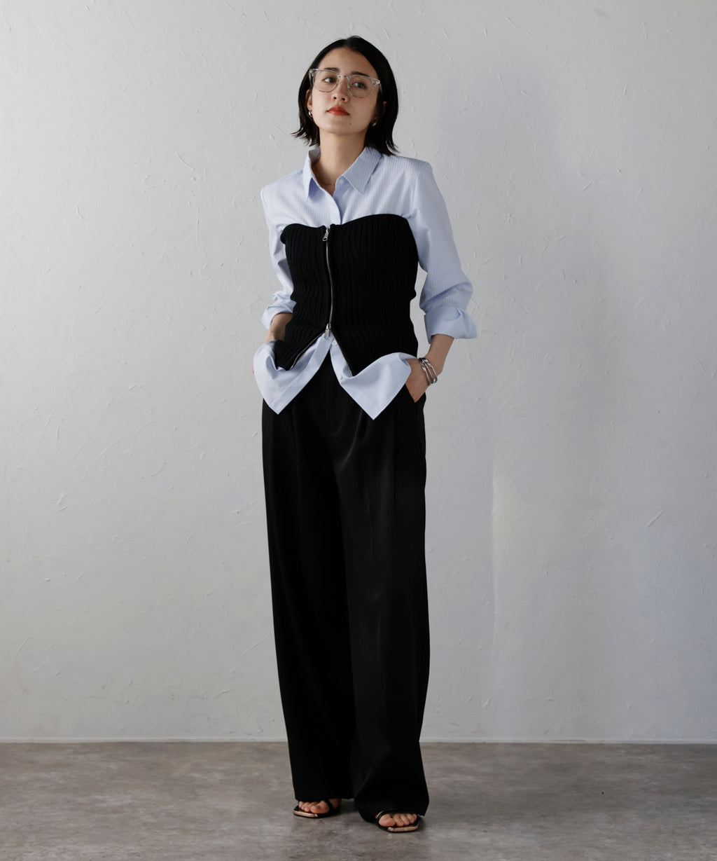 We recommend wearing it in an outstyle. It creates a well-balanced overall look compared to tucking it in. Choose slightly wide pants for a relaxed feel.