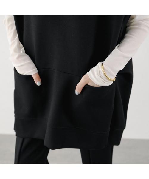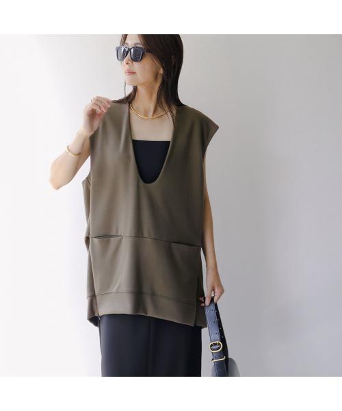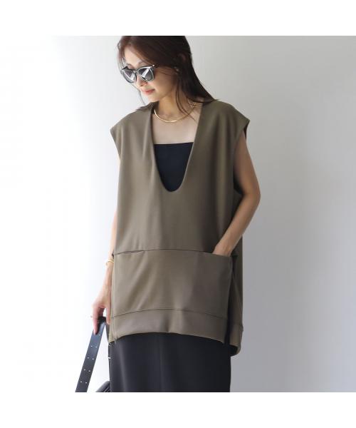 Relaxed silhouette with a length that covers the hips, deep V-neck, and side tucks are the points.