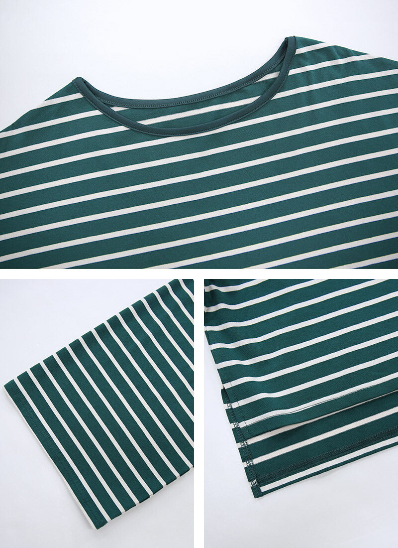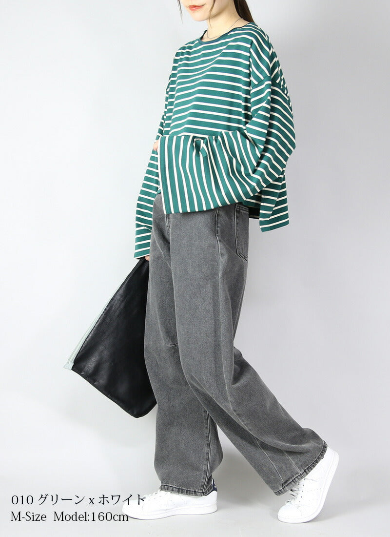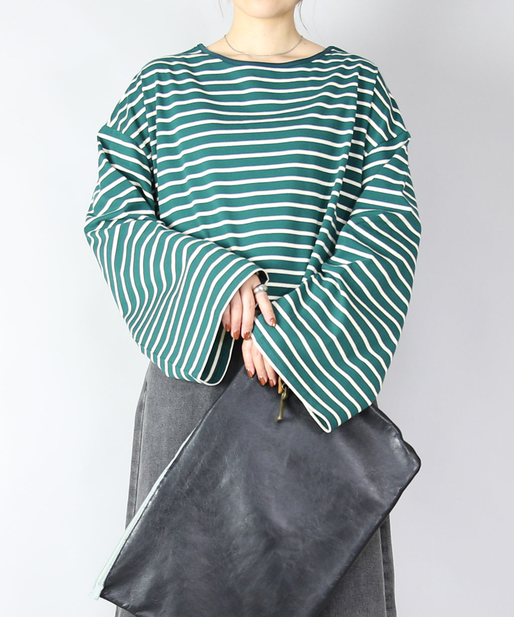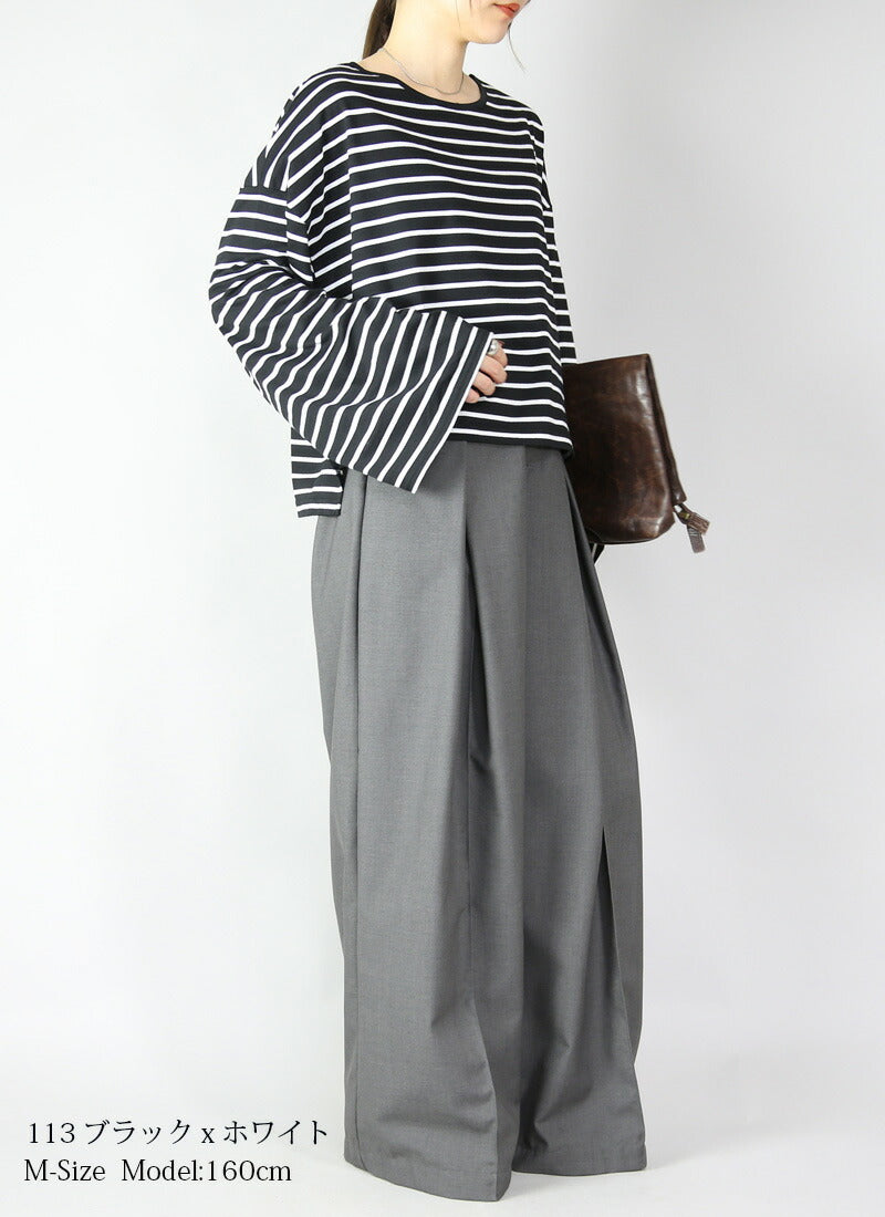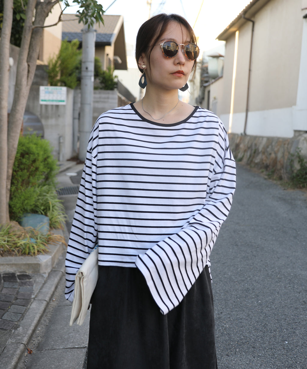 Andit and it_ Drop Shoulder Long Sleeve Border Short T-Shirt New Arrival Tops Autumn Clothes Elegant Cute Long Sleeve T-Shirt Long T-Shirt Wide Sleeve 1 Piece Perfect Border Short Length