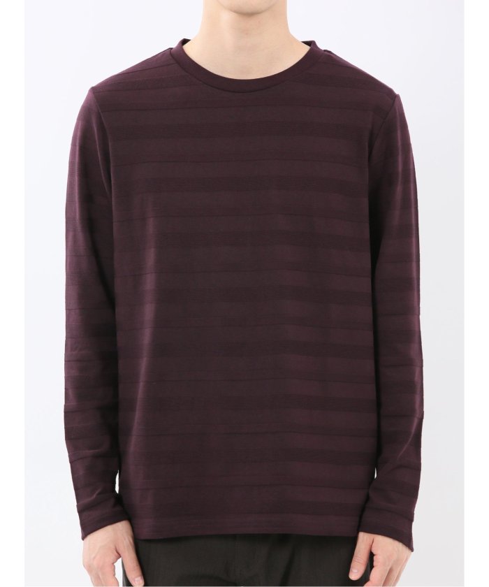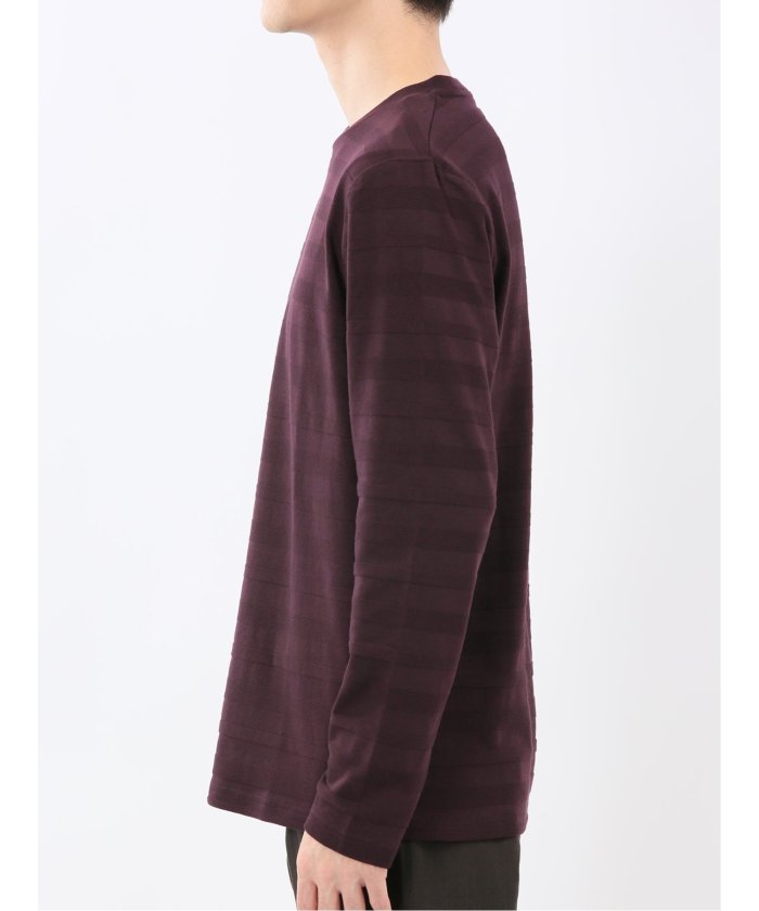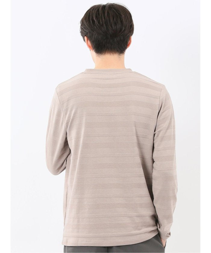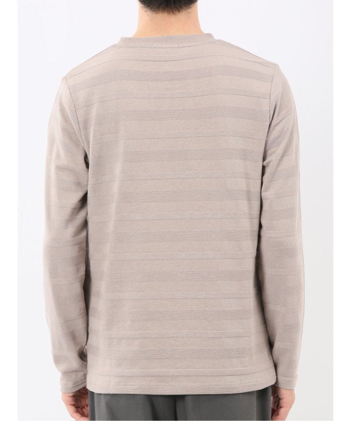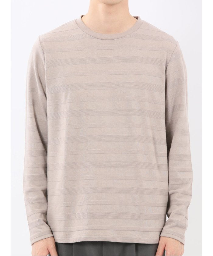 This is a crew neck long sleeve T-shirt with a presence that is not overly simple. It features a jacquard pattern with a surface texture that distinguishes it from plain fabrics, resulting in a stylish look. It is a convenient item that can be worn alone or as an inner layer under jackets, shirts, or vests.