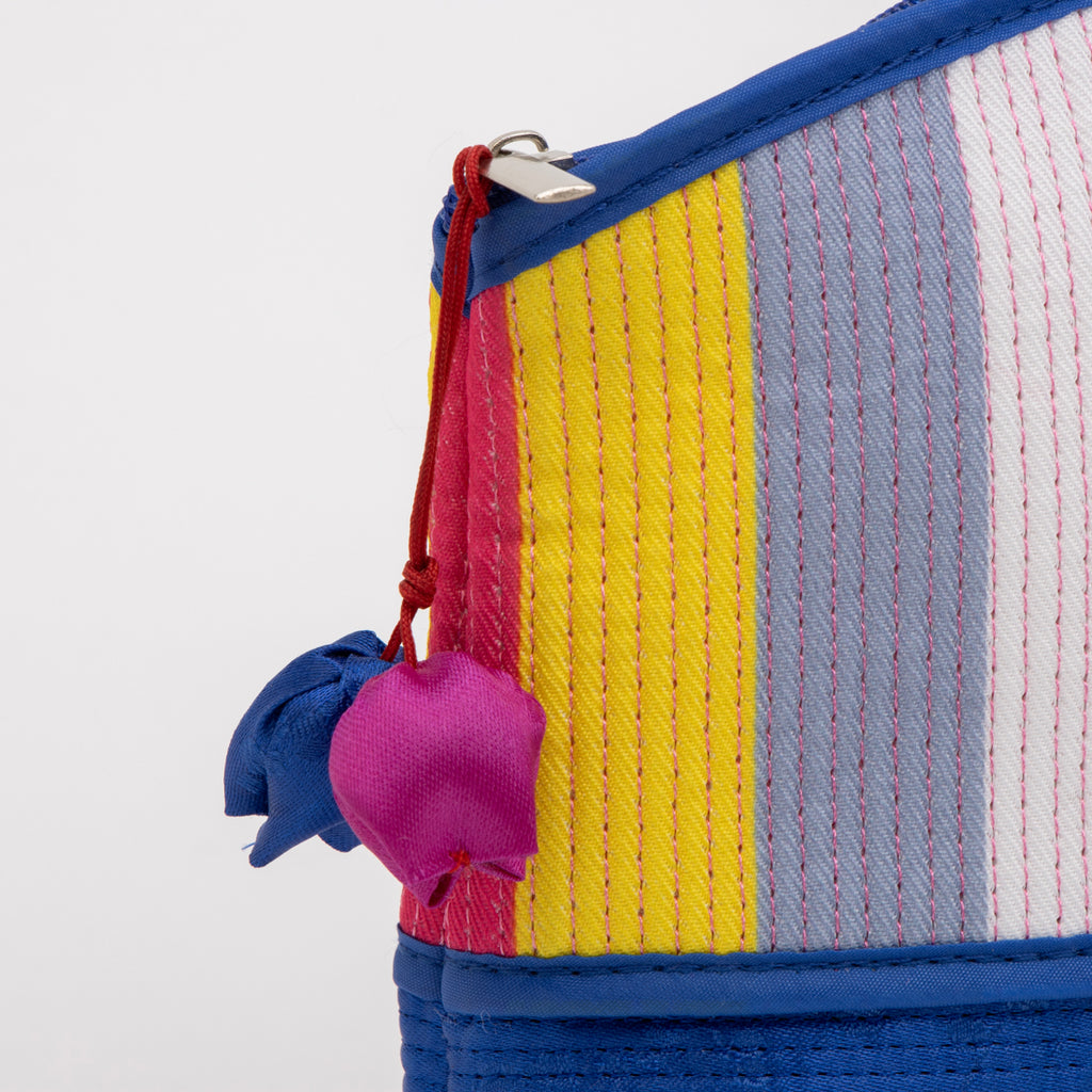The top features various colored stripes, and the bottom is made of cute red fabric, creating a unique design.