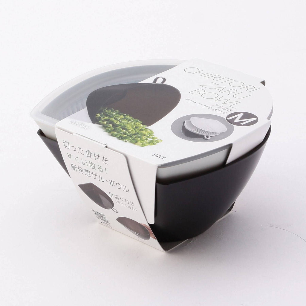 The "Chiritori Zaru Bowl," which comes as a set with a resin strainer, bowl, and lid, is a convenient product that handles everything from food preparation to simple storage. As the name "Chiritori" suggests, the shapes of the bowl and strainer resemble the letter D, making it easy to smoothly return chopped ingredients from the cutting board to the bowl. It can also be used in the microwave, making it very handy during food preparation. Additionally, with its lid, you can wash fruits and vegetables, drain the water, and store them temporarily (and since it has a lid, it can be stacked as well). It also features measurements, so we frequently use it as a measuring cup, hanging it with an S-hook for easy access. This product is recommended for both cooking beginners and veterans, so why not add it to your new kitchen tools?