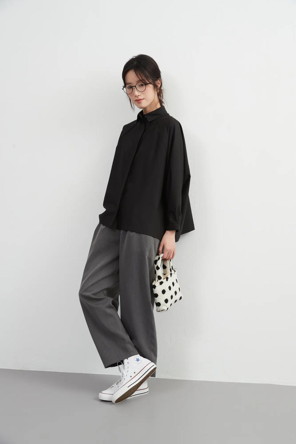 Tucking in a simple top to emphasize the waistline further enhances the style-up effect.