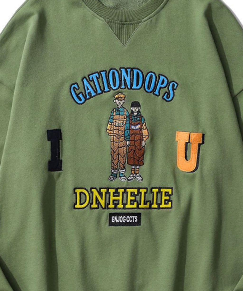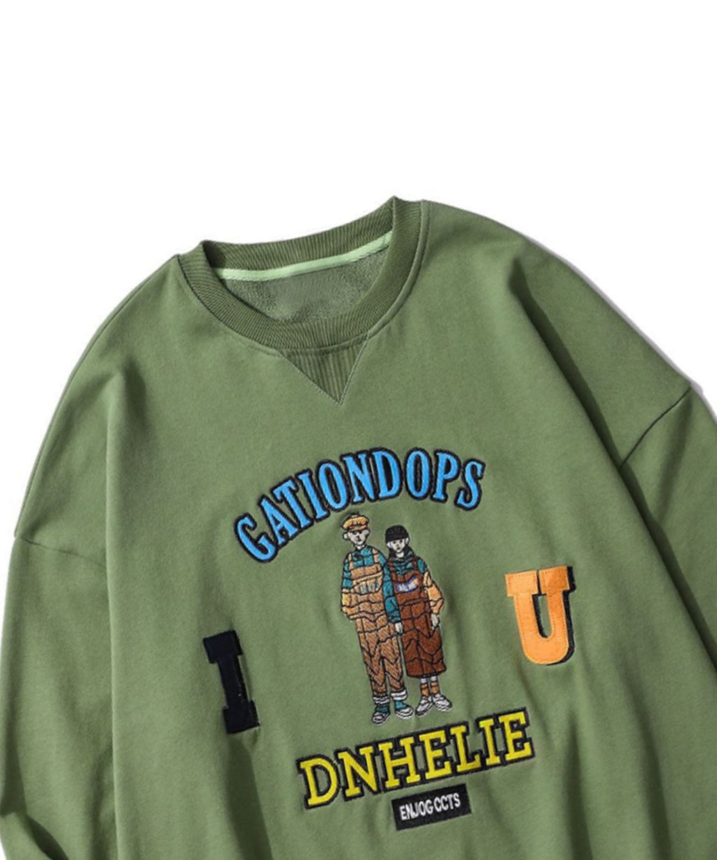 The embroidery featuring street-style English letters and a couple illustration is a highlight.