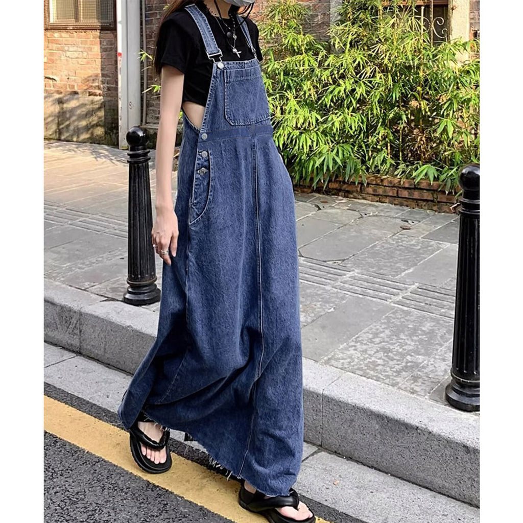 Maxi length jumper skirt denim suspender dress slit slimming long skirt layered denim dress Korean style