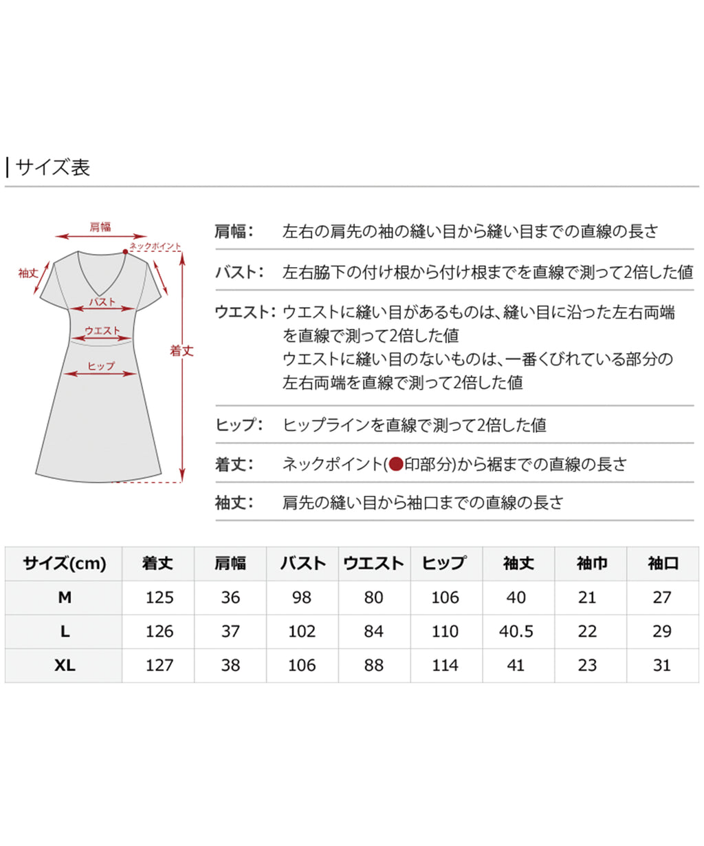 Actual size M : Length:125cm, Shoulder Width:36cm, Bust:98cm, Sleeve Length:40cm, Waist:80cm, Hip:106cm