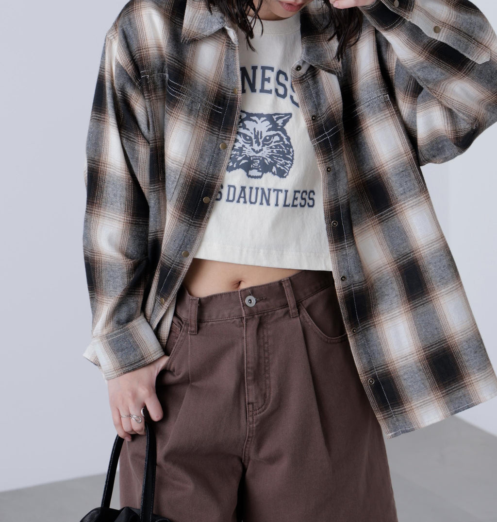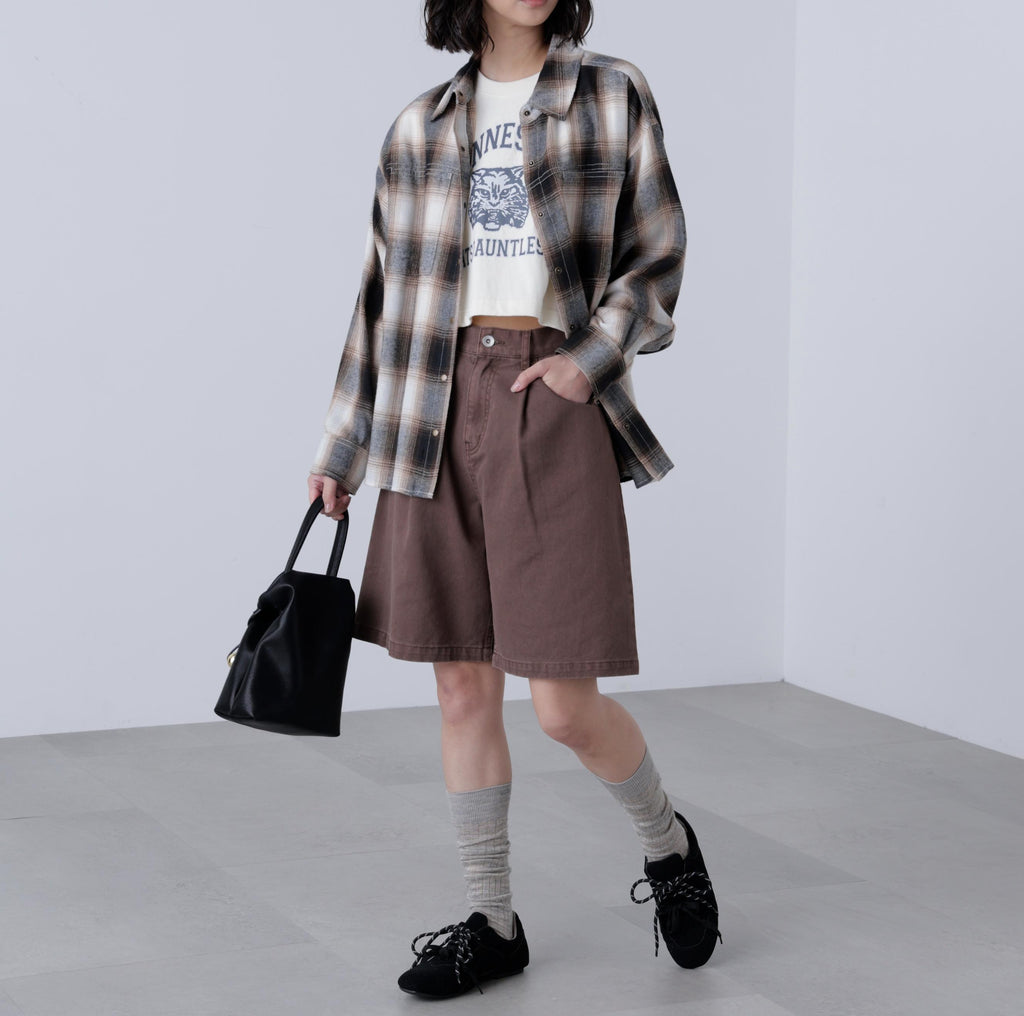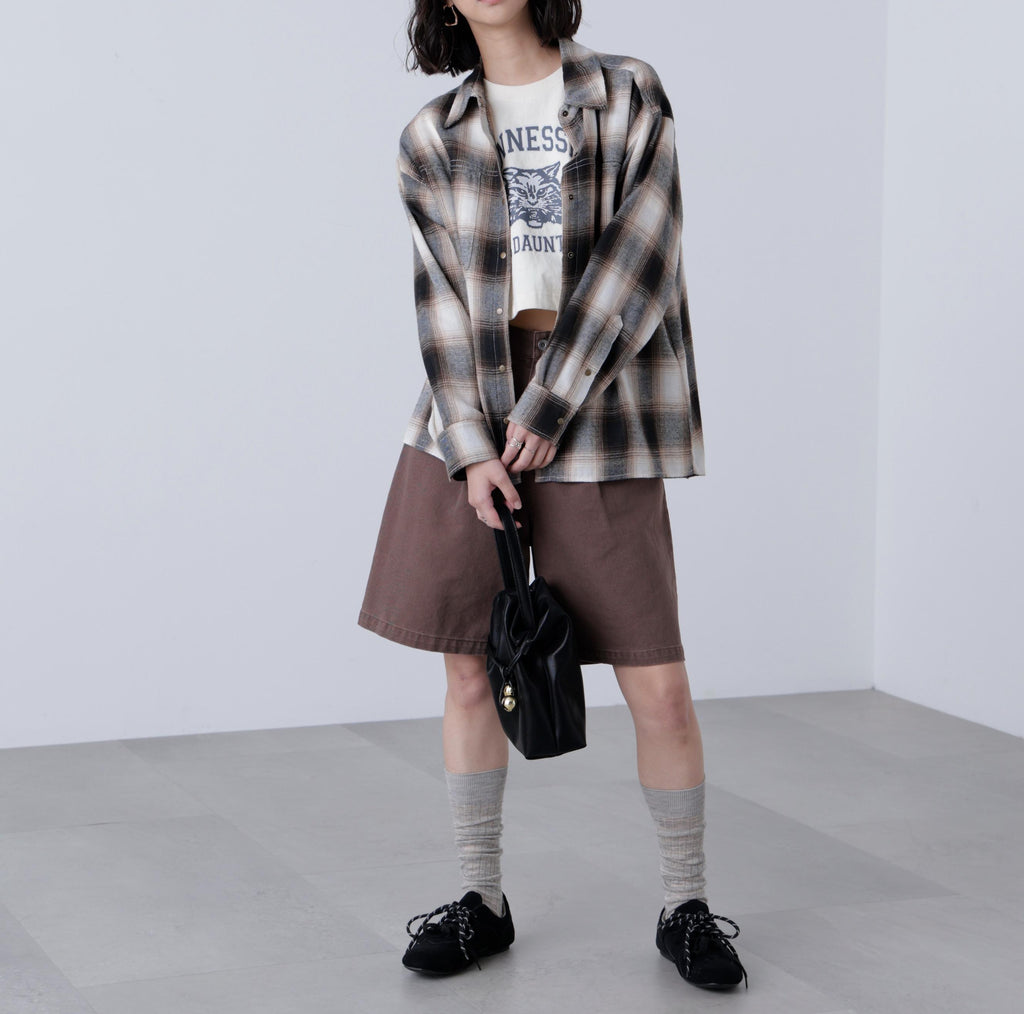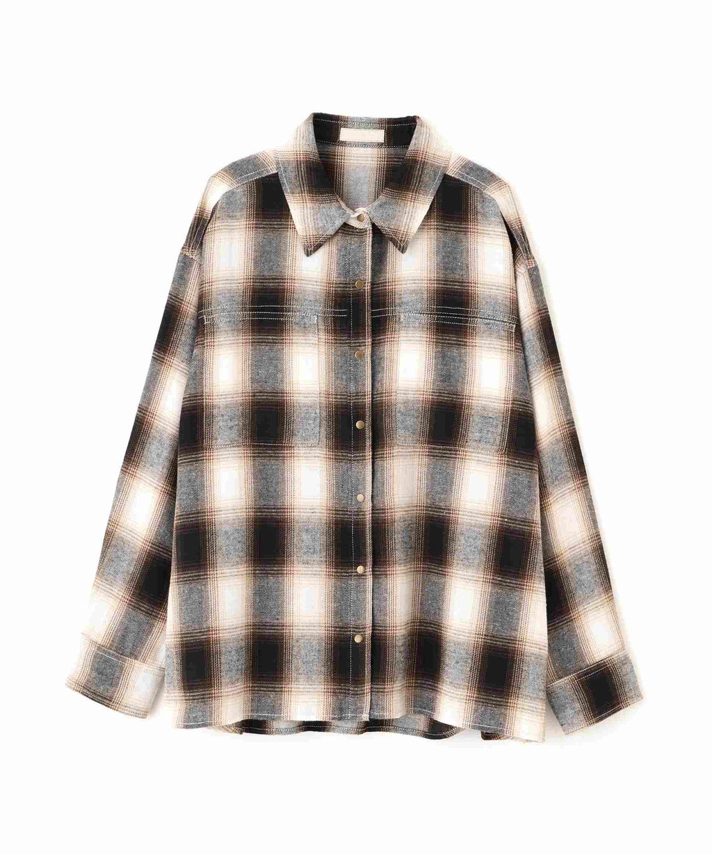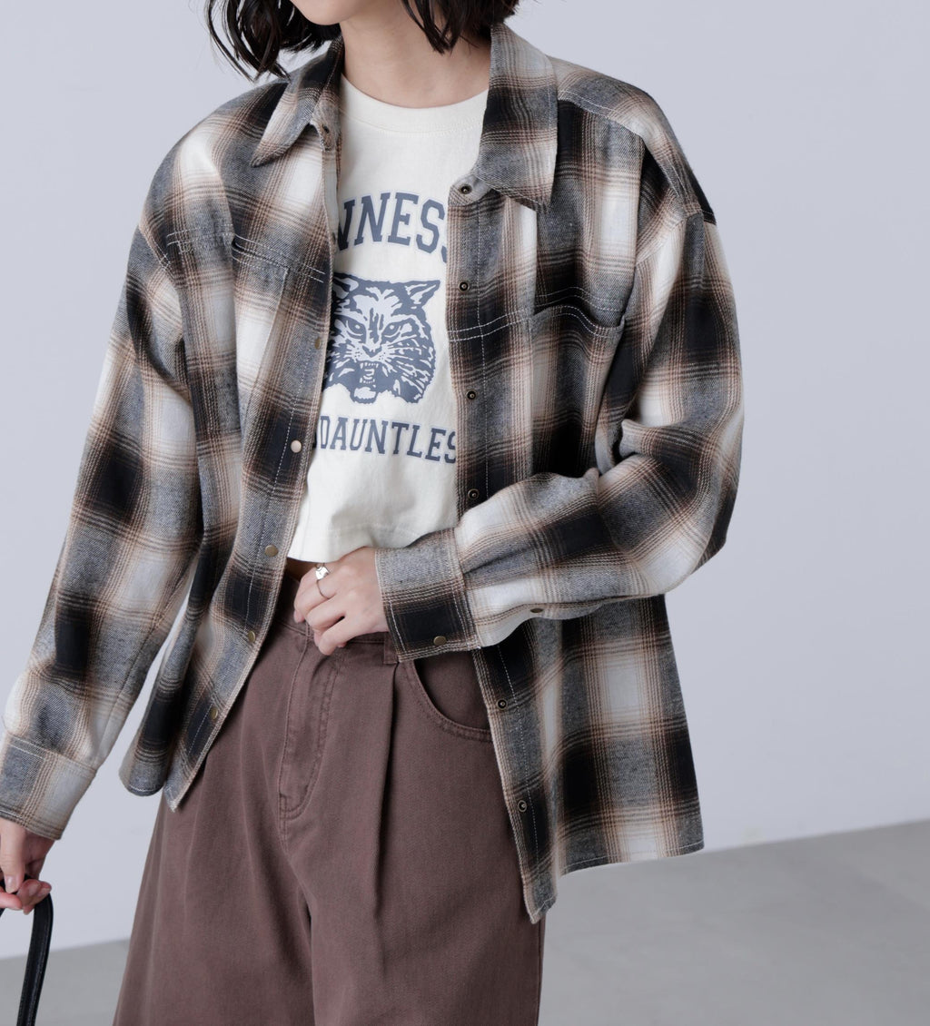 A looser shirt with a more modest silhouette than traditional over-shirts, while still maintaining a relaxed feel. It has a season-appropriate size that pairs well with pants styles. Features vintage-inspired antique gold-colored snap buttons and stitched detailing. For a casual look, pair with denim pants, or for a Y2K style, match with pleated skirts. In autumn, layering with a leather blazer creates a cute look. Made from soft material that feels good on the skin, it is easy to wear alone or as a layering piece, and also comfortable as an inner layer under outerwear. Available in suede-like beige and an on-blend check pattern in black and brown.